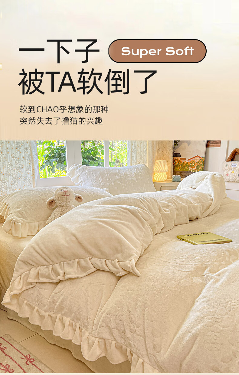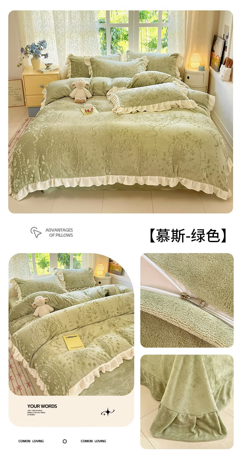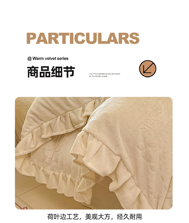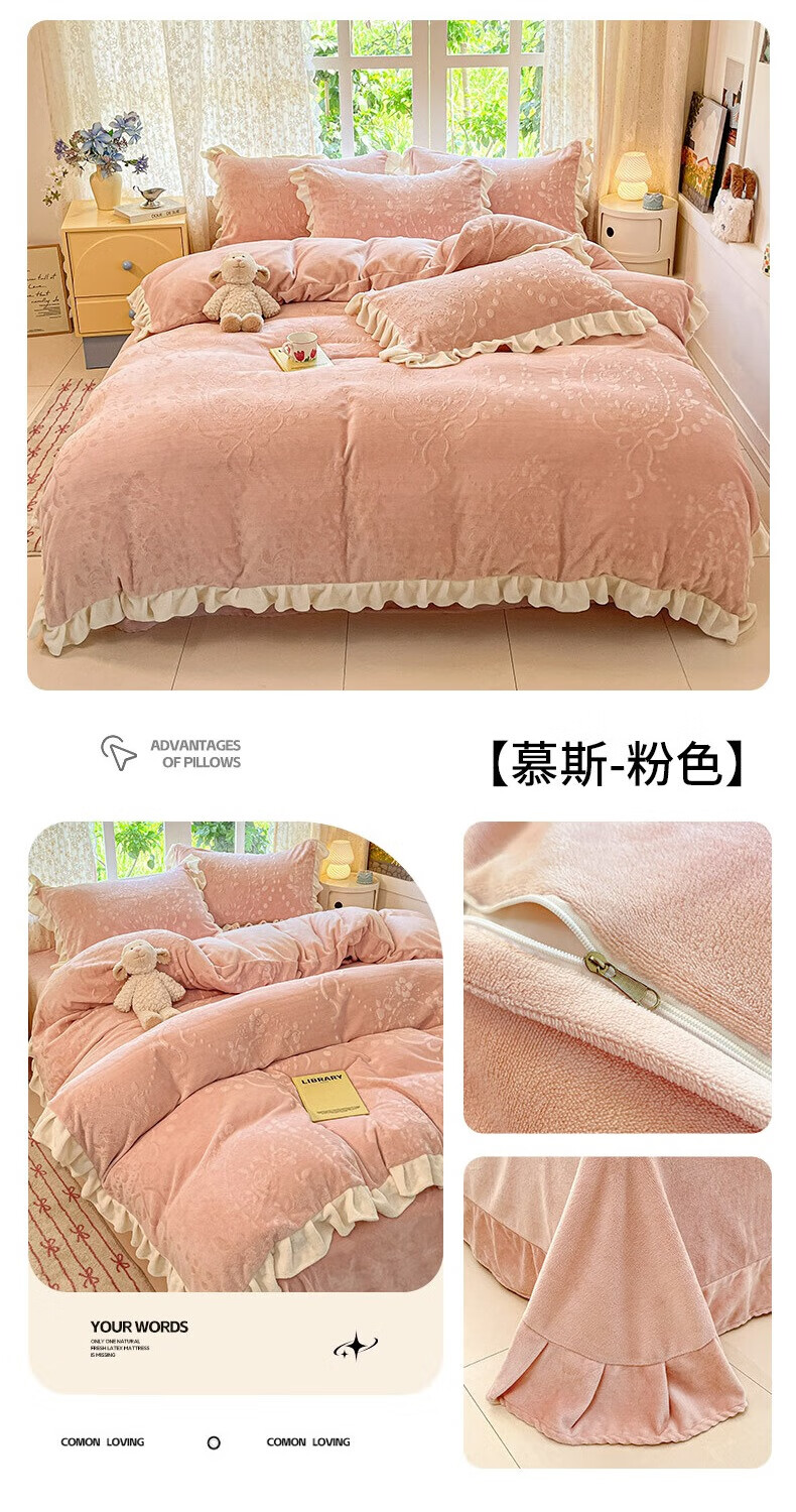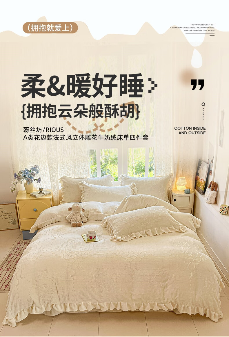 牛奶绒床单款花边款四件套,热情与温暖的综合体;牛奶绒面料 让保暖持续更久些 ;绒底厚实牢固 舒适保暖