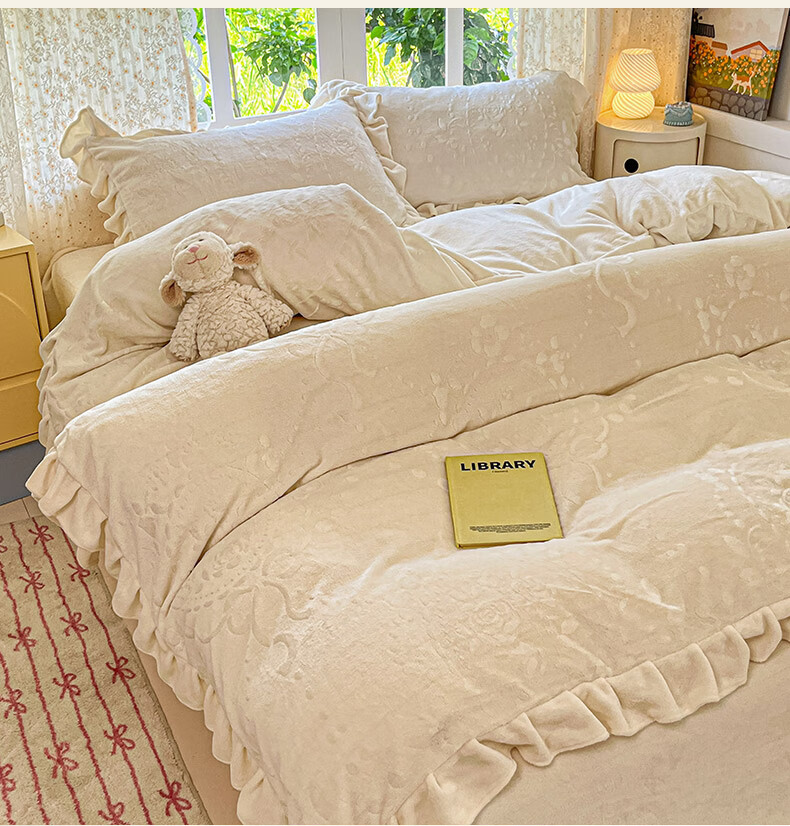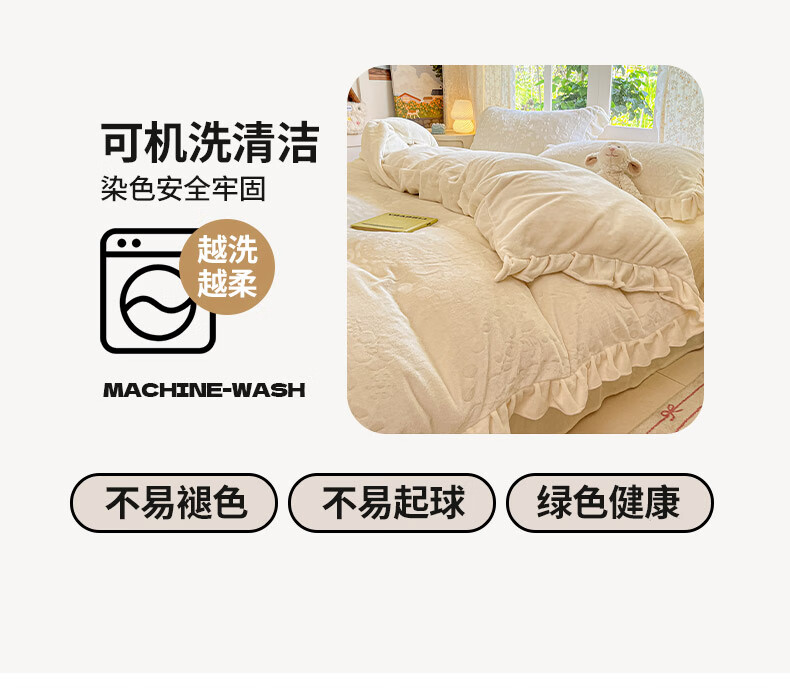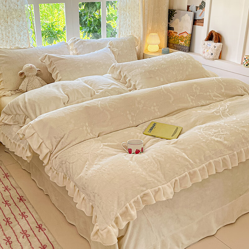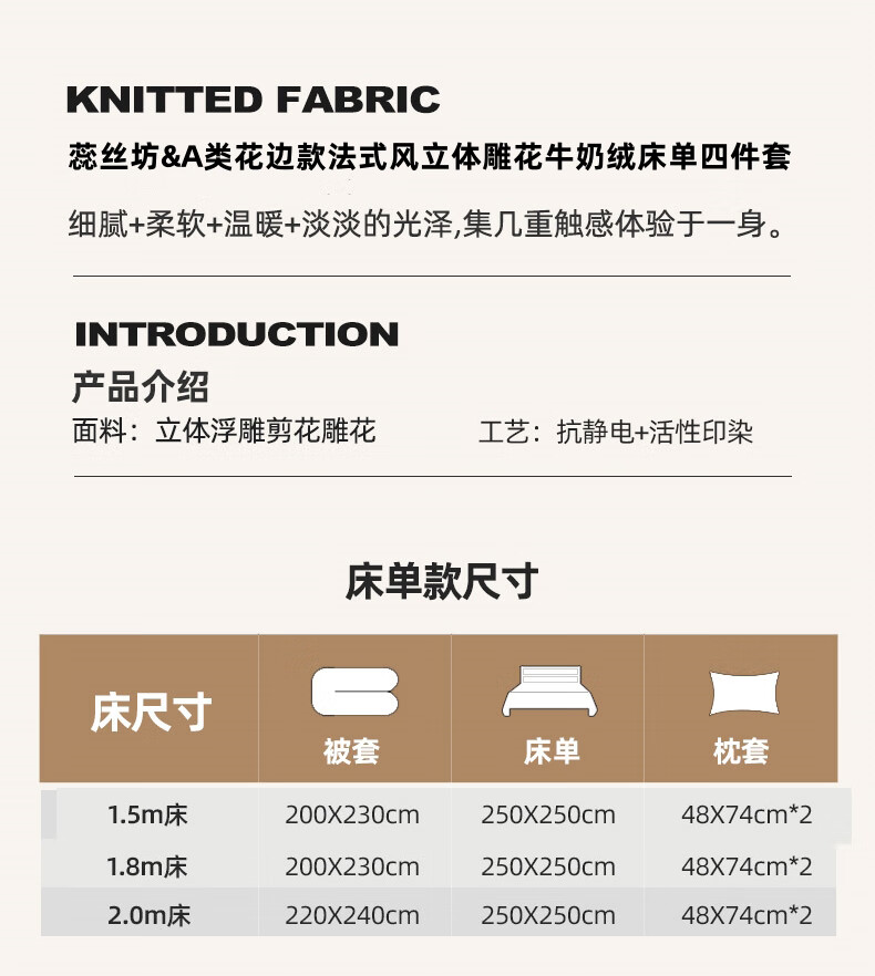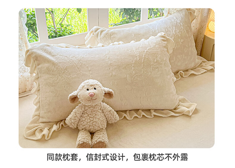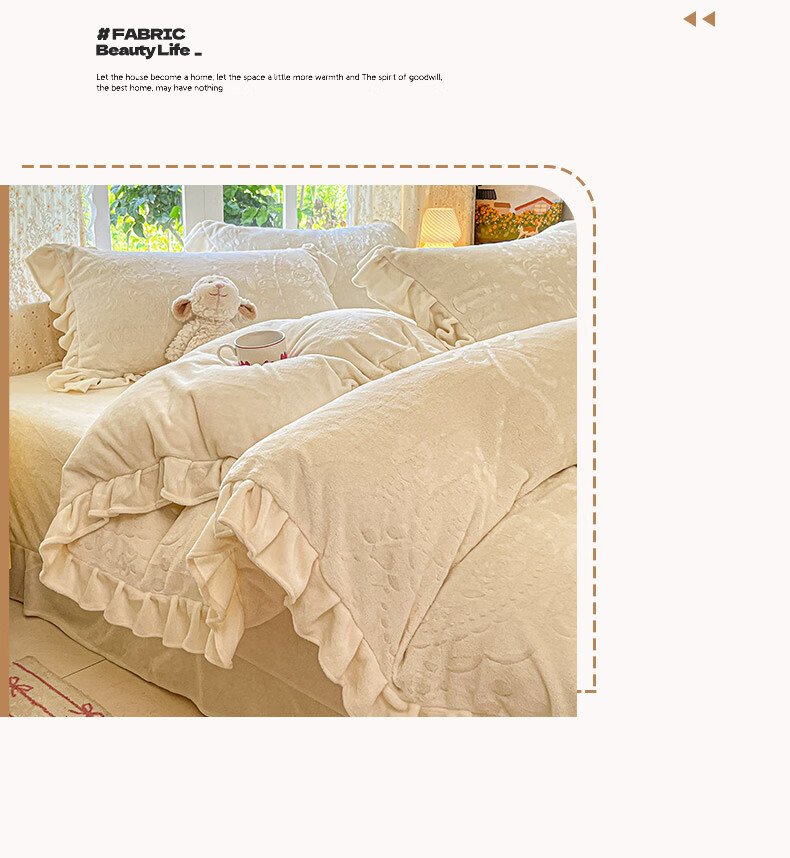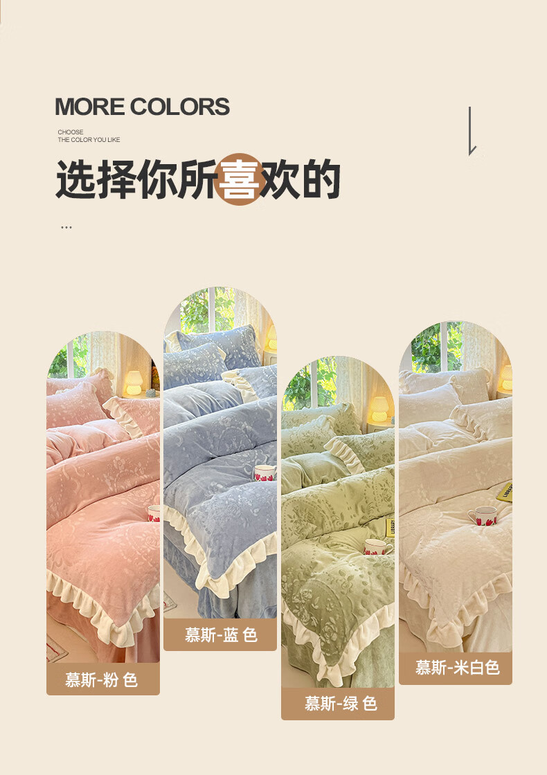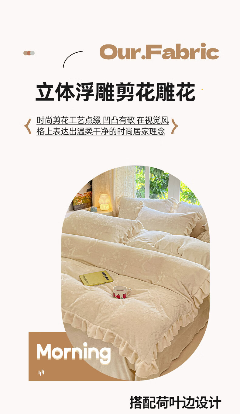 牛奶绒床单款花边款四件套,热情与温暖的综合体;牛奶绒面料 让保暖持续更久些 ;绒底厚实牢固 舒适保暖