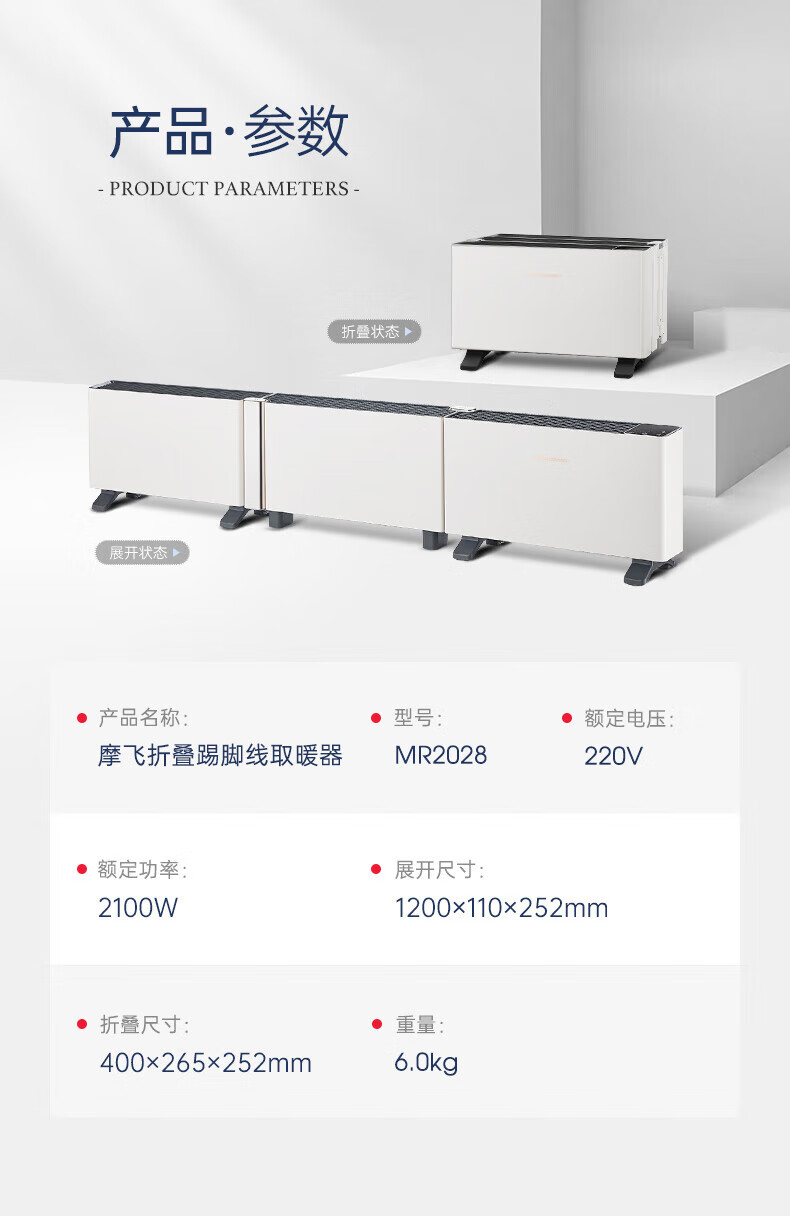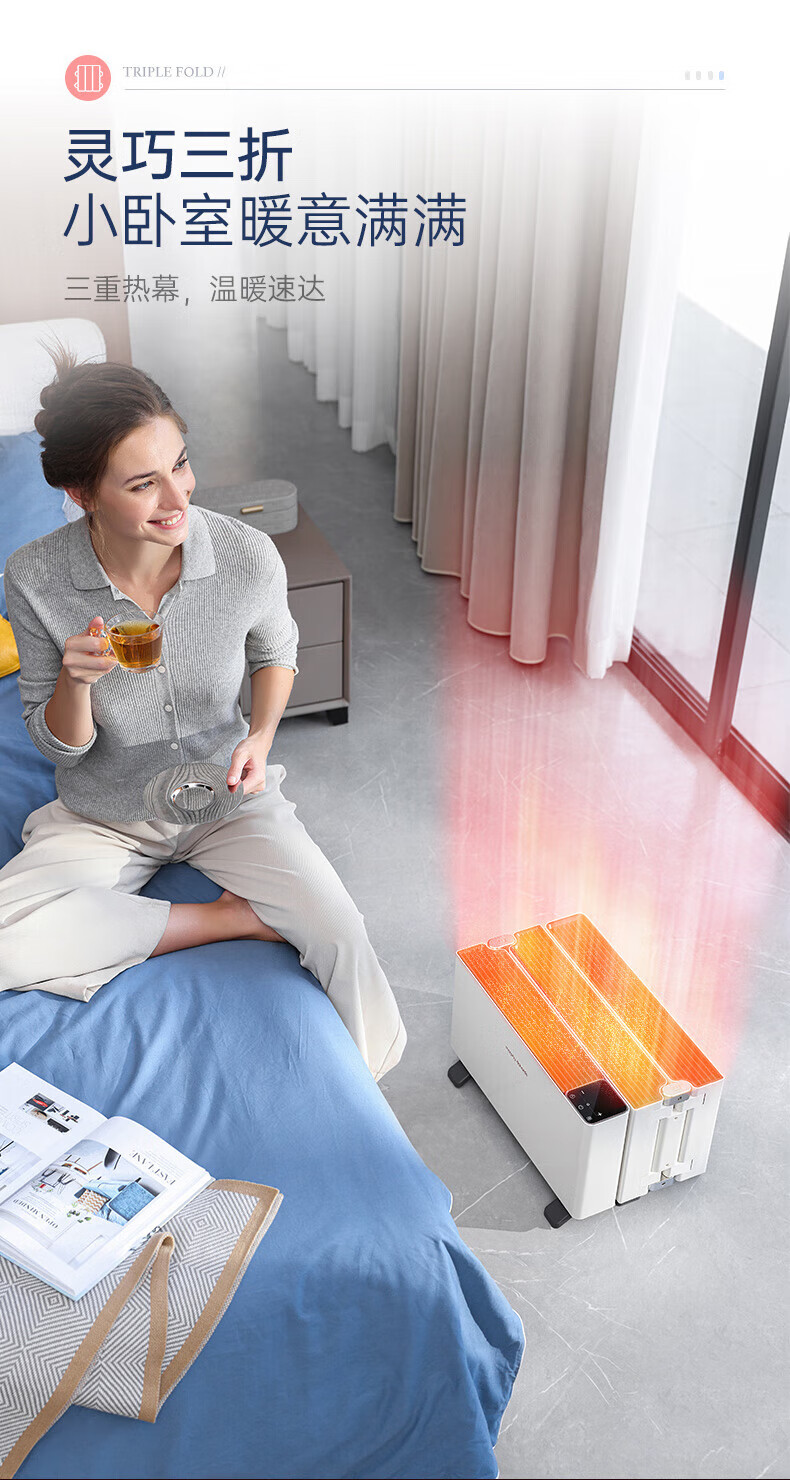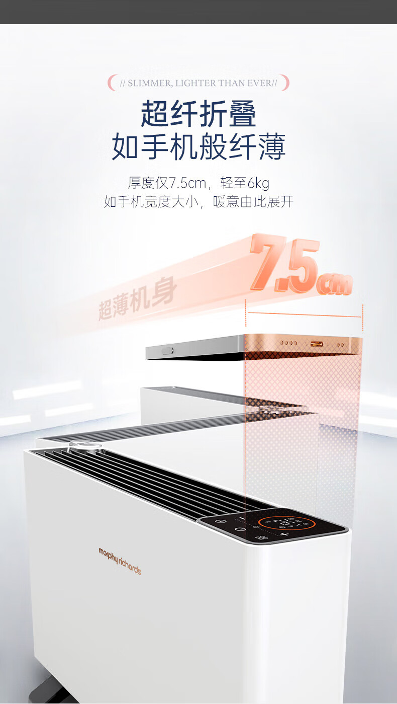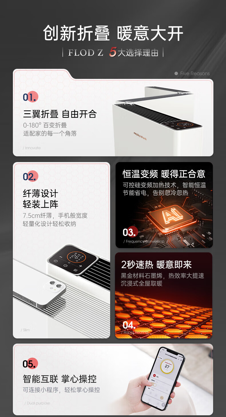 7.5cm超薄设计、三板折叠;采用软胶垫底脚设计,保护地板;采用三组黑金材料石墨烯发热体