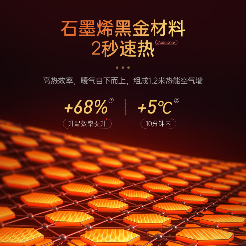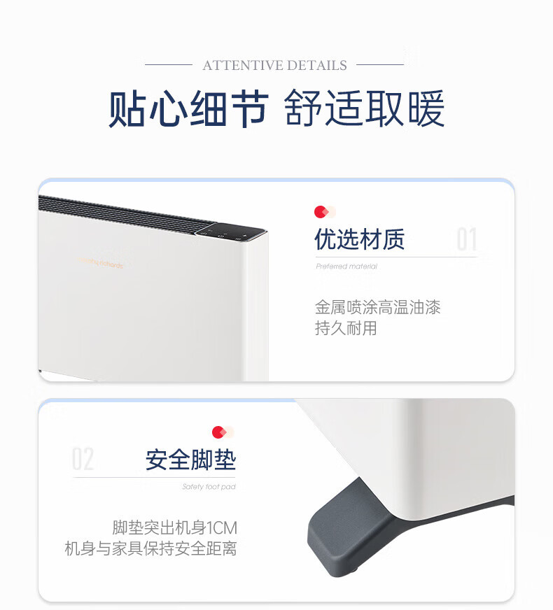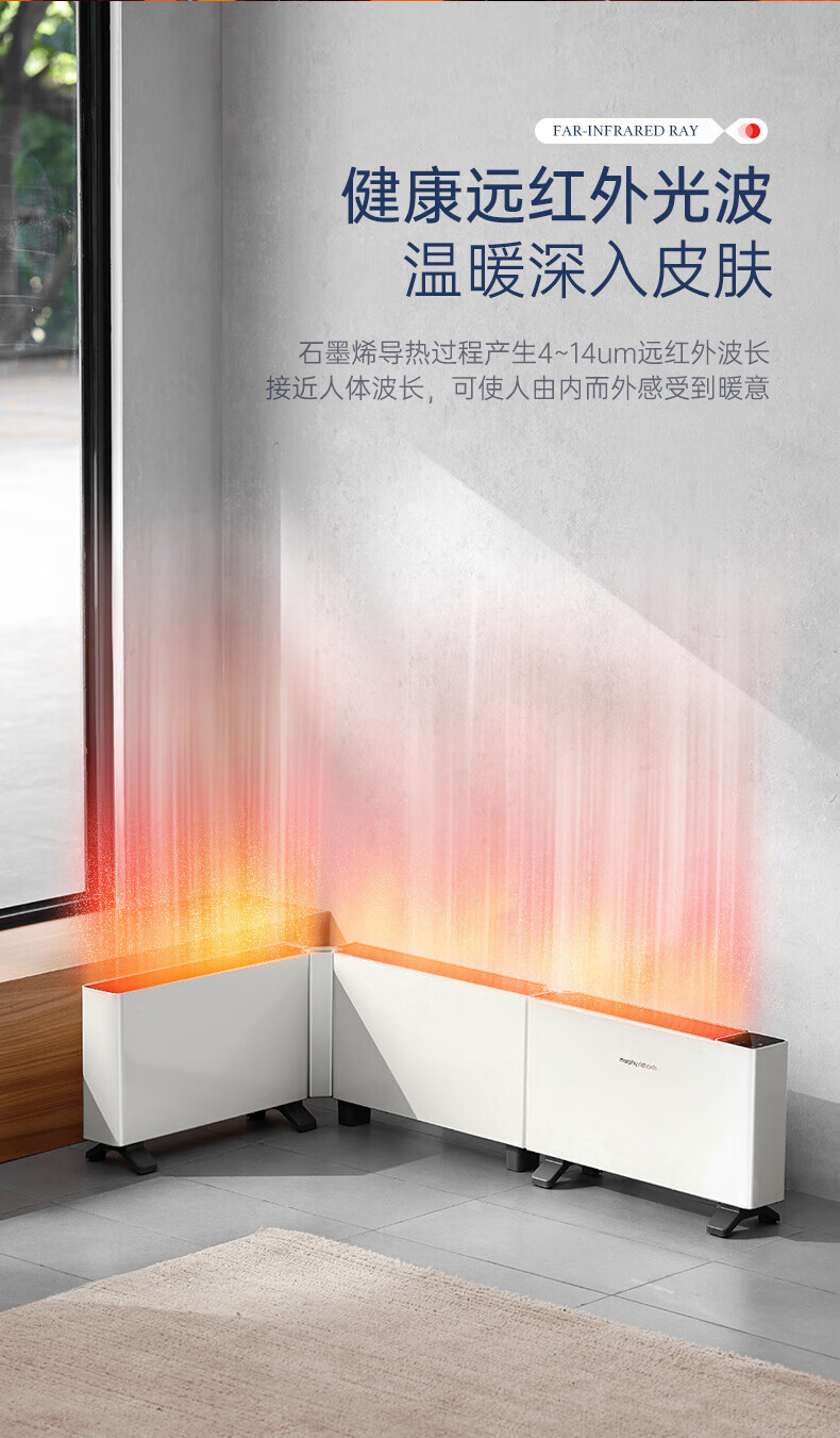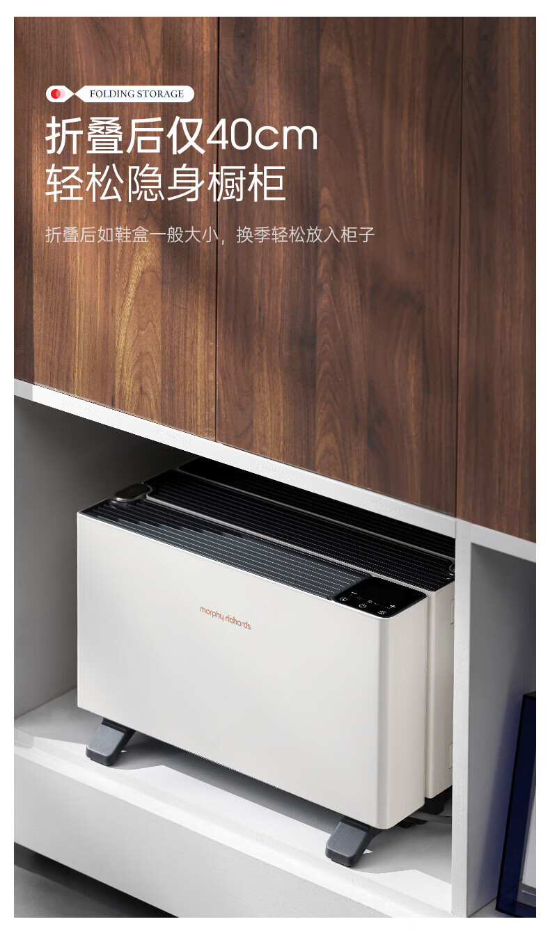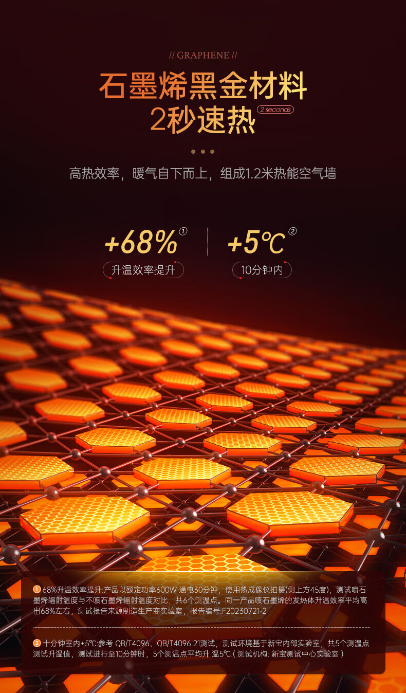7.5cm超薄设计、三板折叠;采用软胶垫底脚设计,保护地板;采用三组黑金材料石墨烯发热体