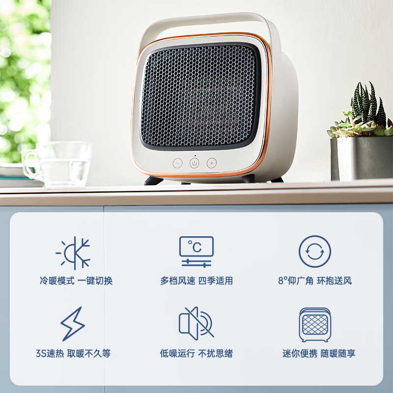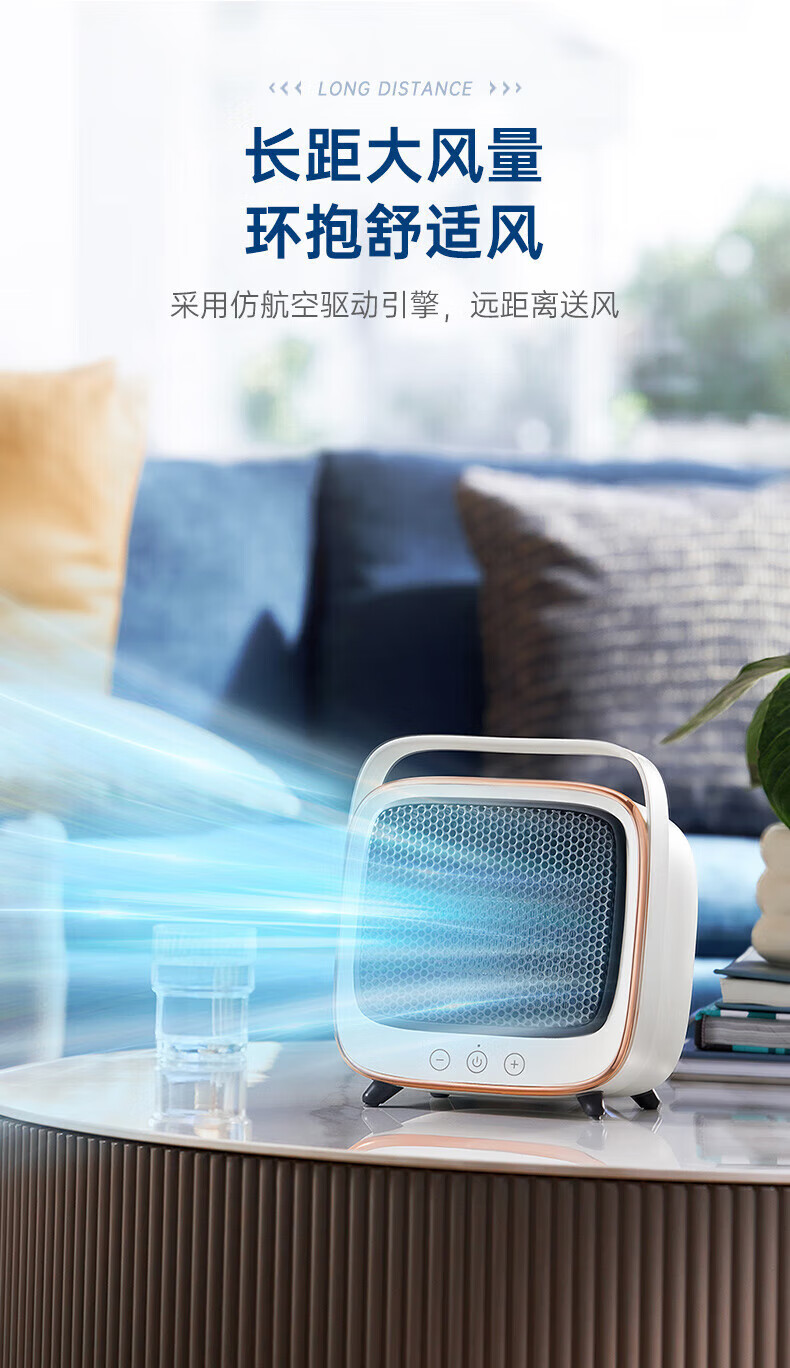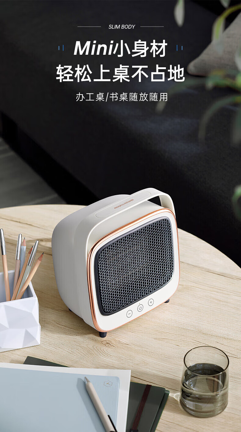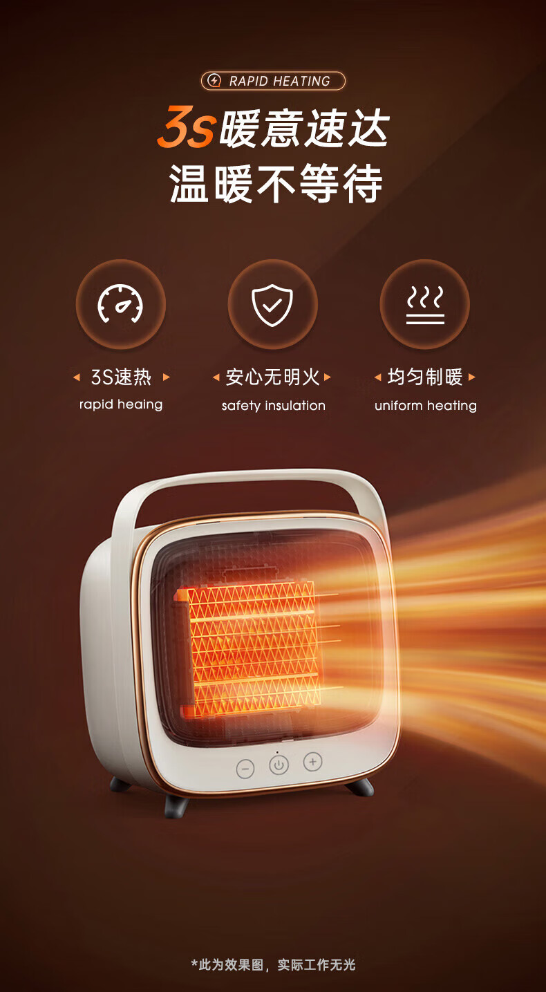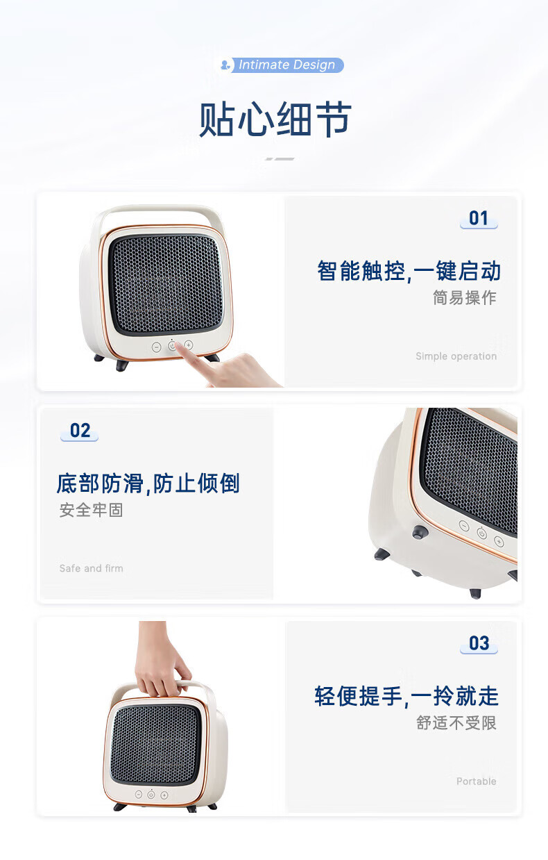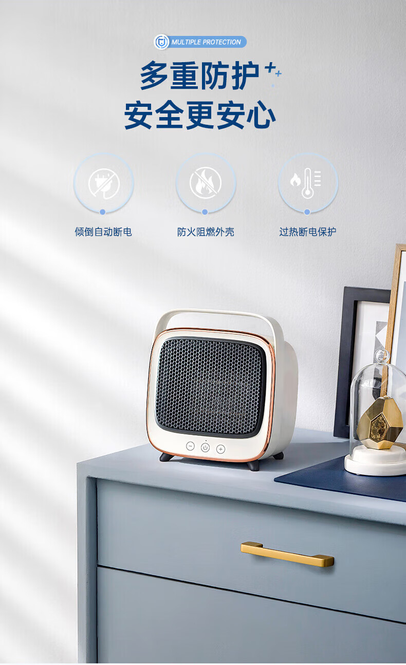 采用陶瓷PTC发热体;45°倾倒断电、过热保护;小巧机身