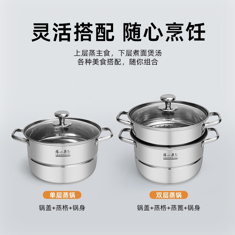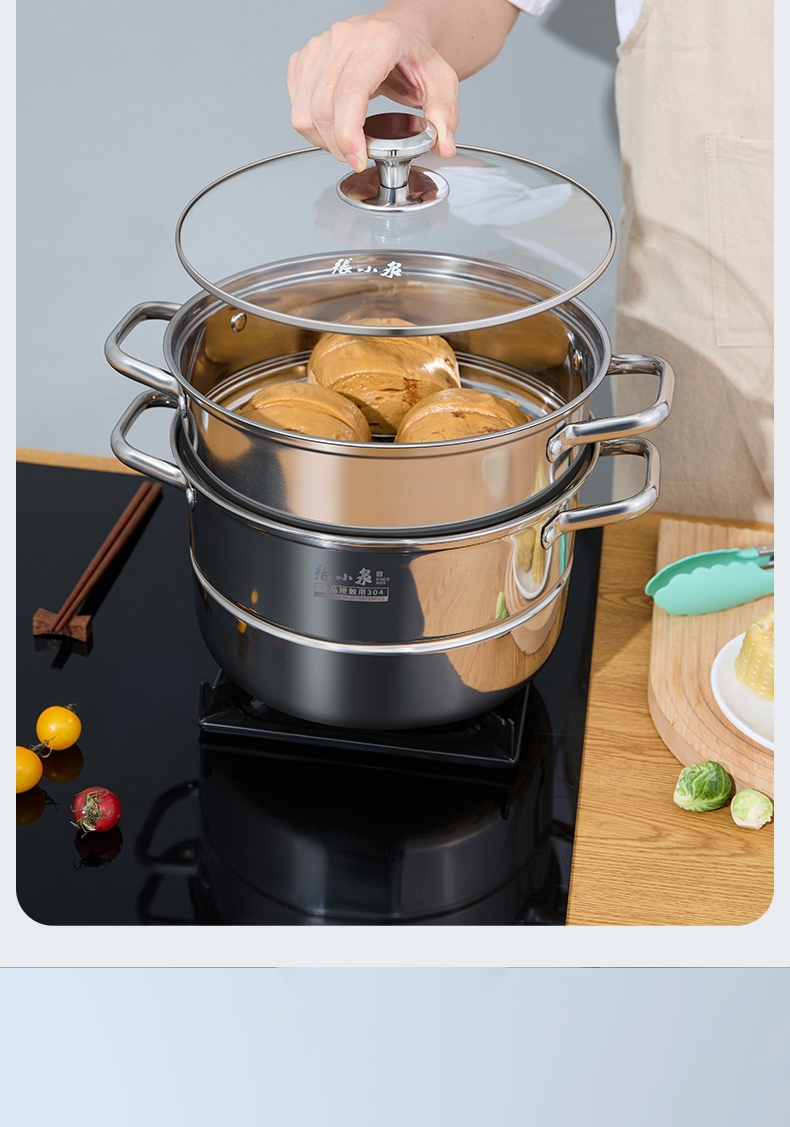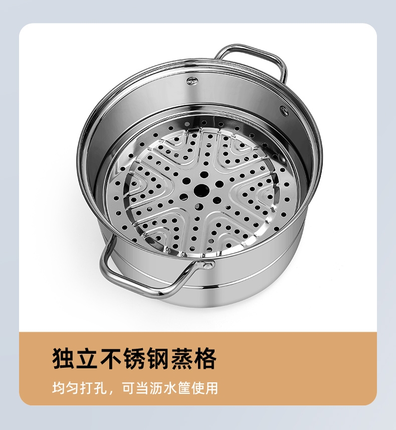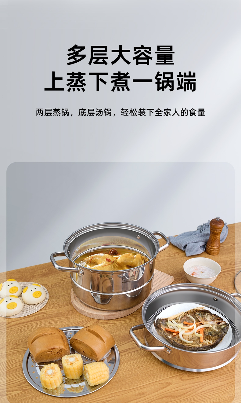 加厚304不锈钢基材,厚重坚实,导热更迅速,节能省;不挑灶具,可适合不同灶具;双层设计,下煮上蒸,更省时