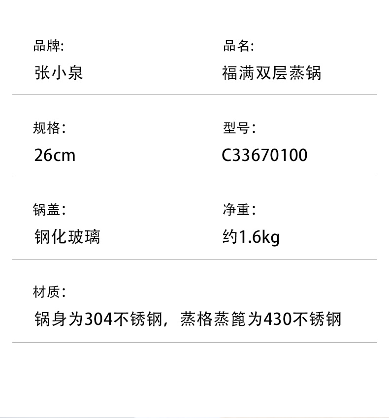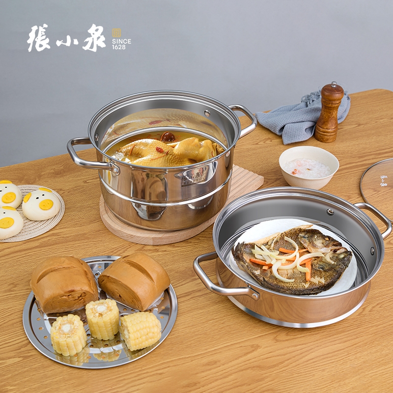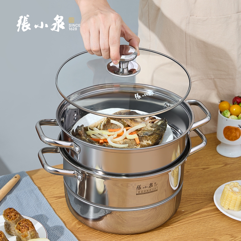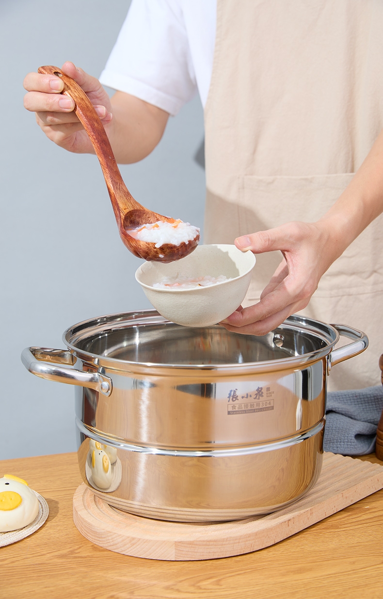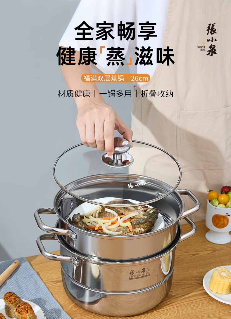 加厚304不锈钢基材,厚重坚实,导热更迅速,节能省;不挑灶具,可适合不同灶具;双层设计,下煮上蒸,更省时