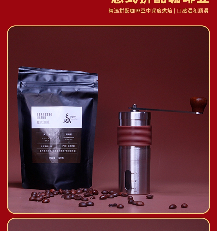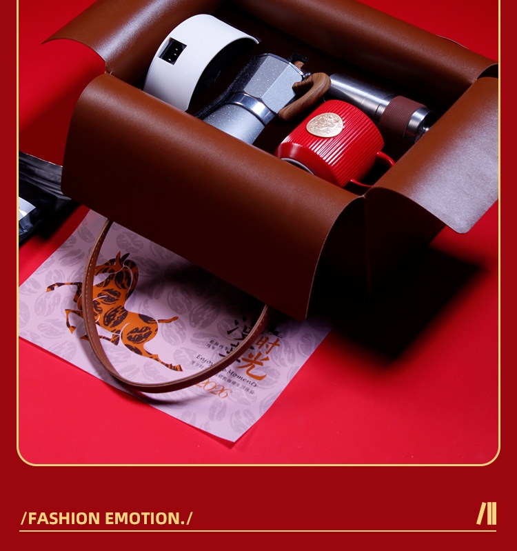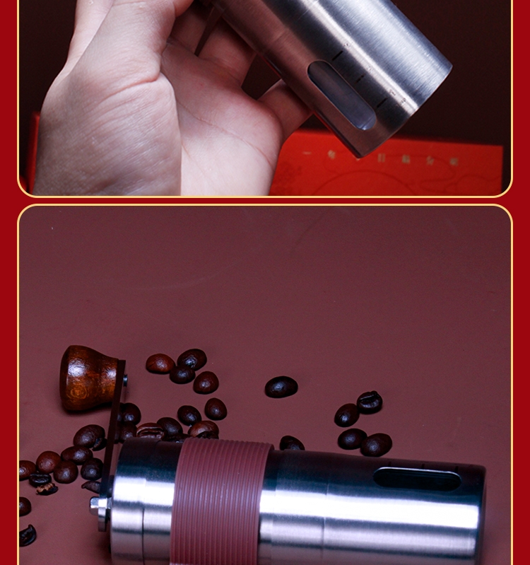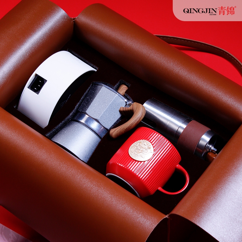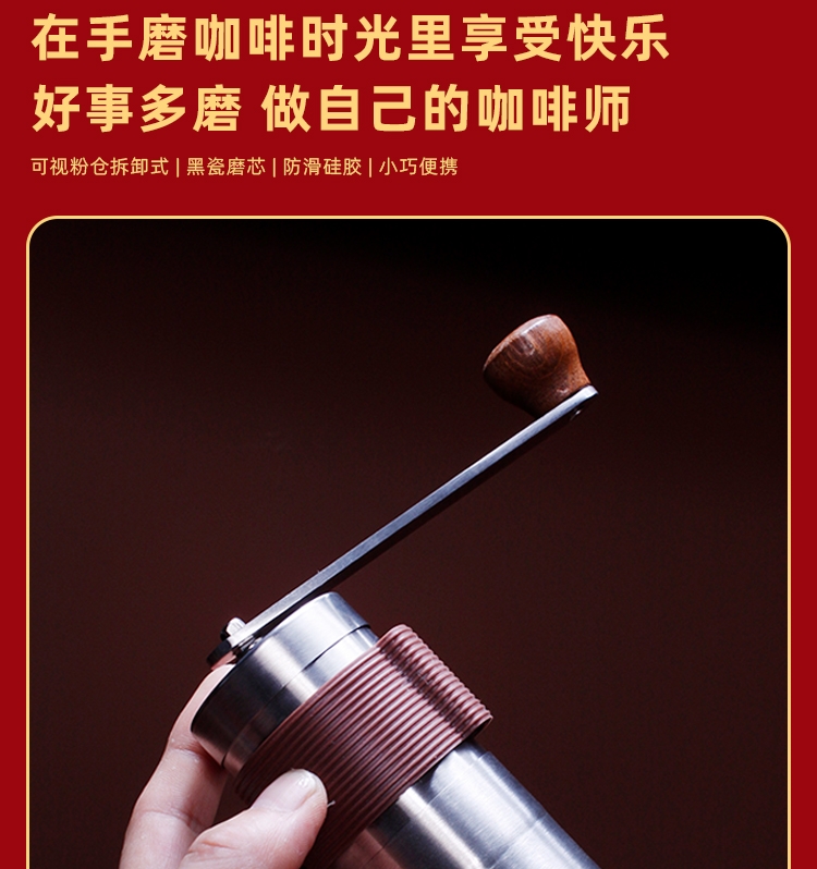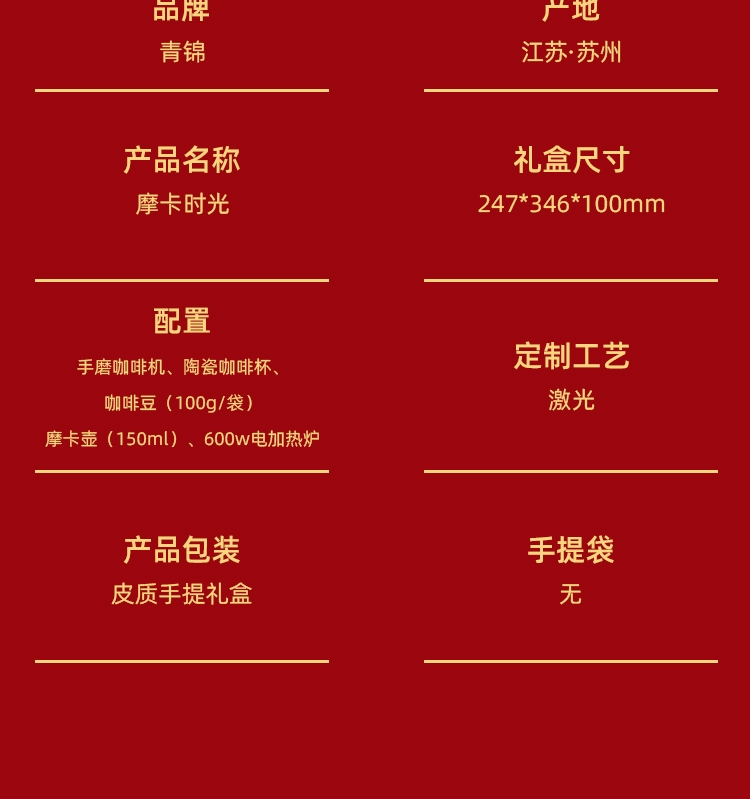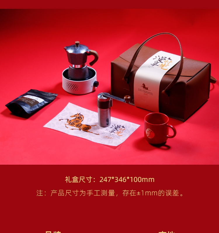 配置清单:手磨咖啡机*1 意式拼配咖啡豆*1袋(100克) 星空灰色摩卡壶*1 150毫升 约3杯 红色咖啡杯*1说明书*1 600w摩卡壶加热炉*1 尺寸6*14cm 皮质手提礼盒*1