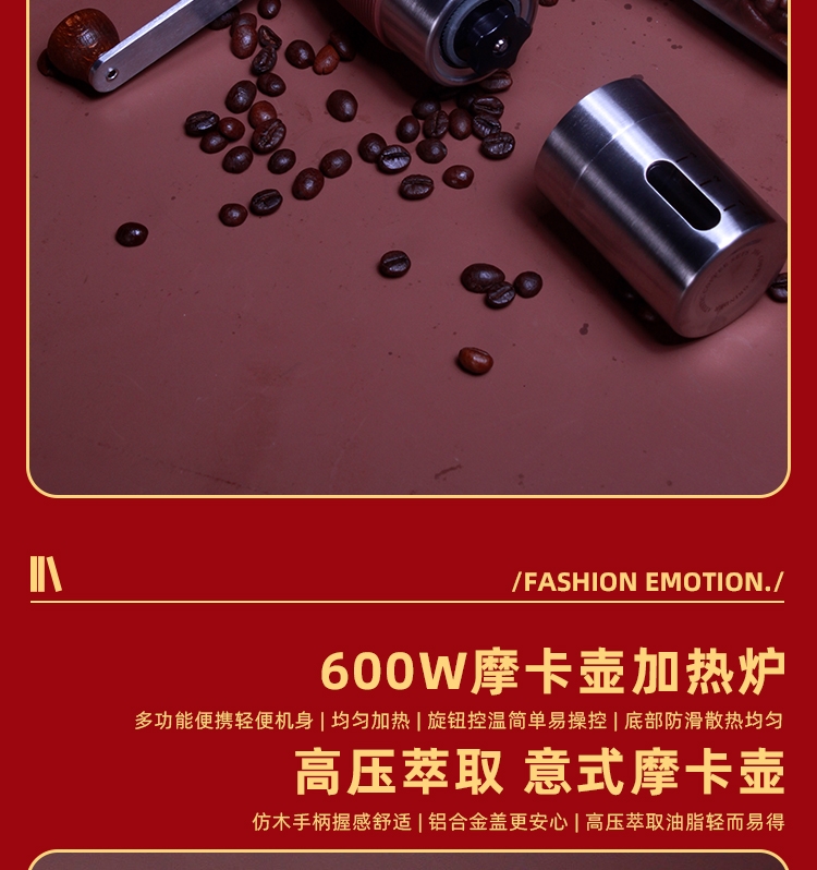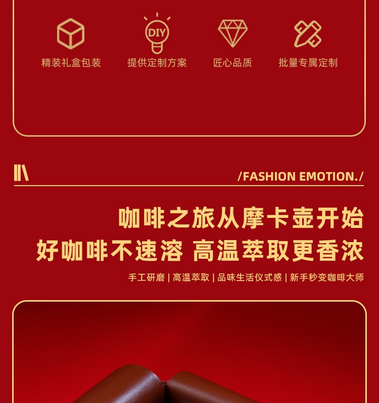 手提式实用设计便携环保;摩卡壶配置让咖啡一直温暖香醇;免费定制logo不限数量支持设计