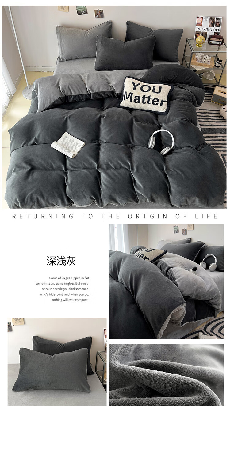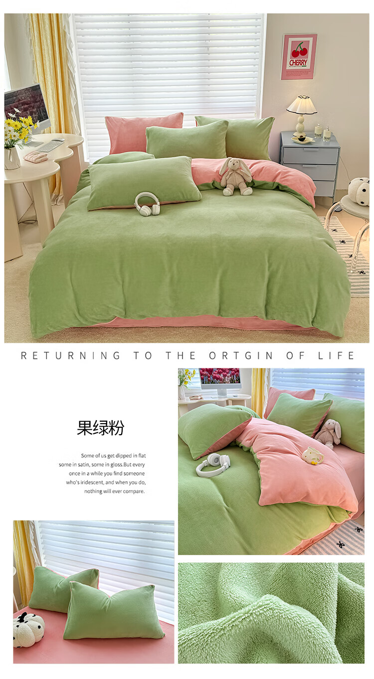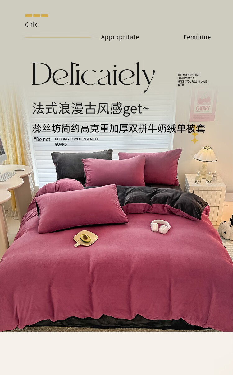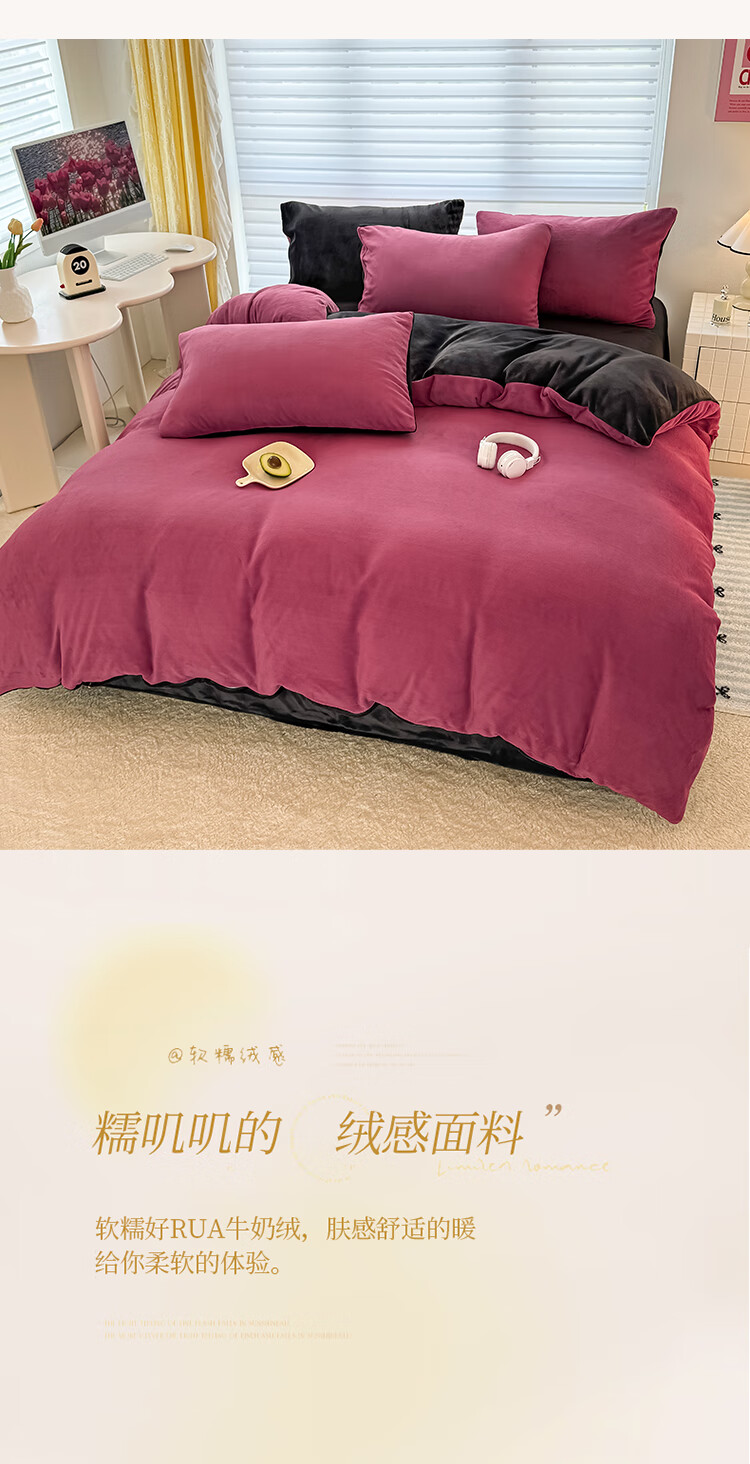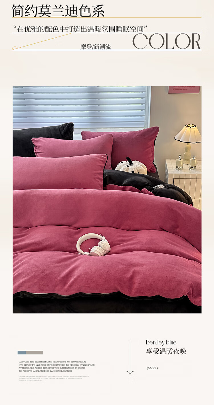 法式浪漫古风感GET 简约墨兰迪色系;在优雅的配色中打造出温暖氛围睡眠空间;软糯好PUA牛奶绒 肌感舒适的暖给你柔软的体验