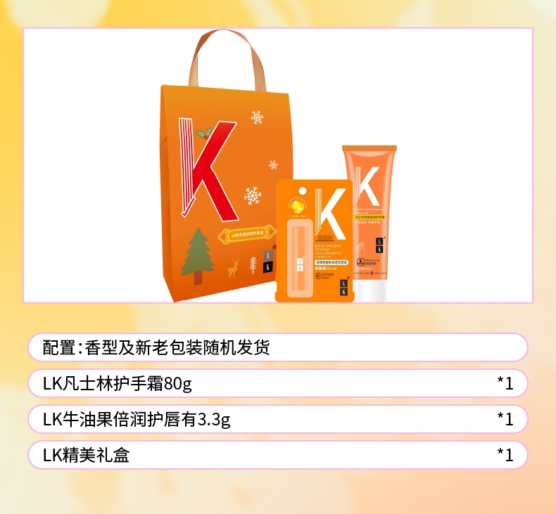 配置清单:LK凡士林深层滋润护手霜80g*1 LK 透明质酸钠保湿润唇膏3.3g*1 LK精美礼盒*1