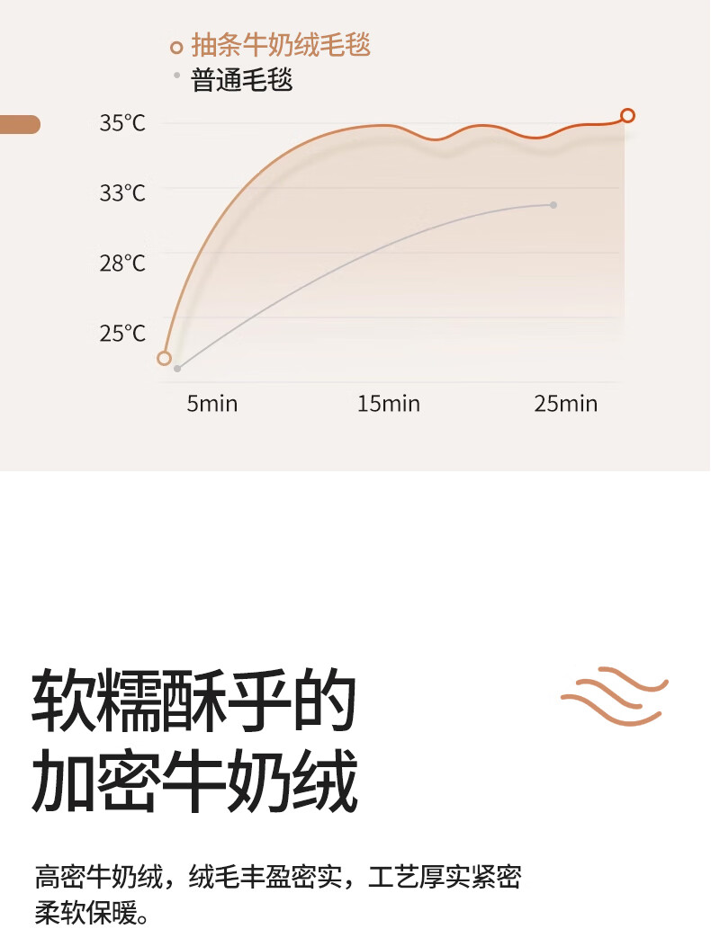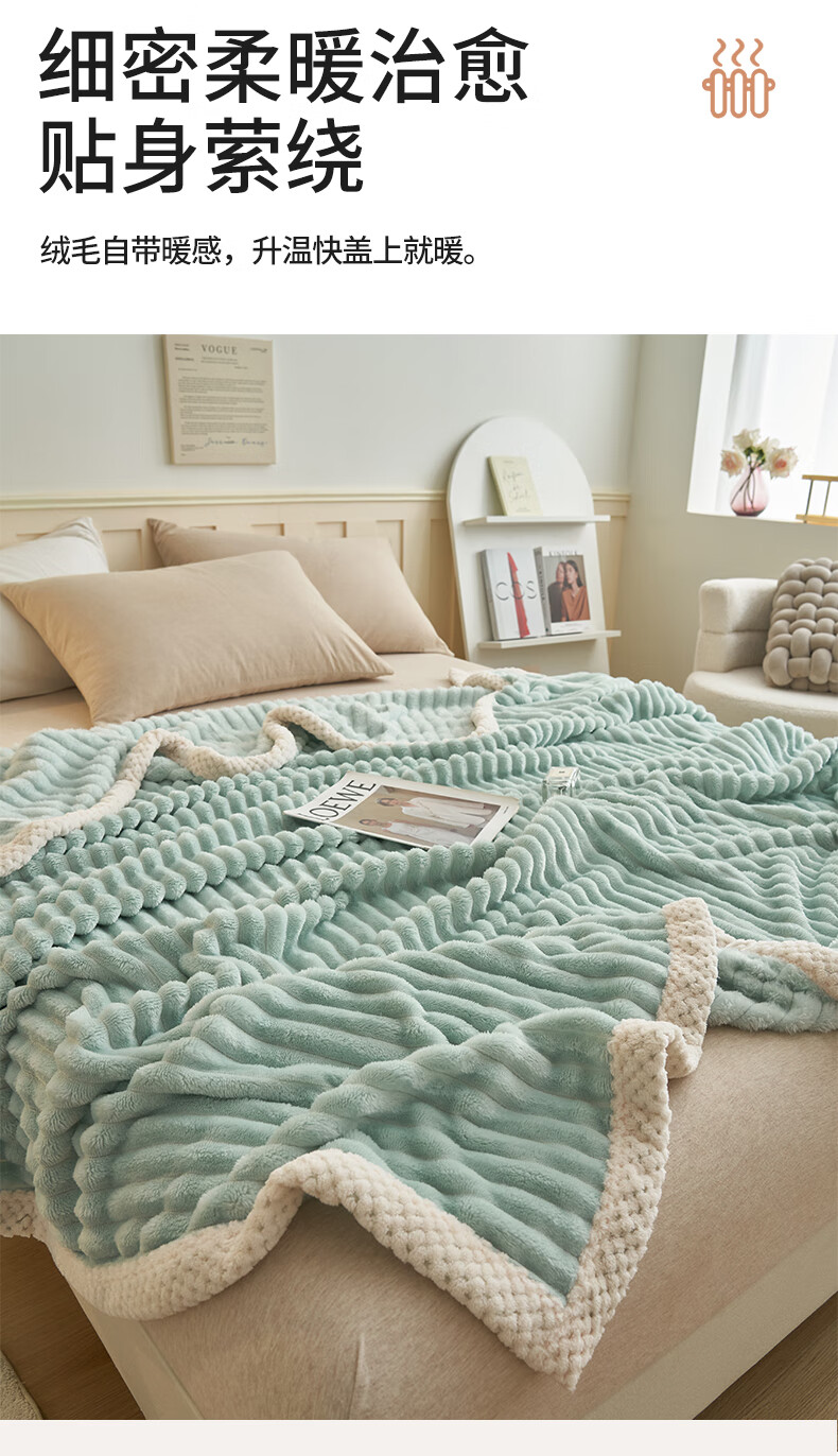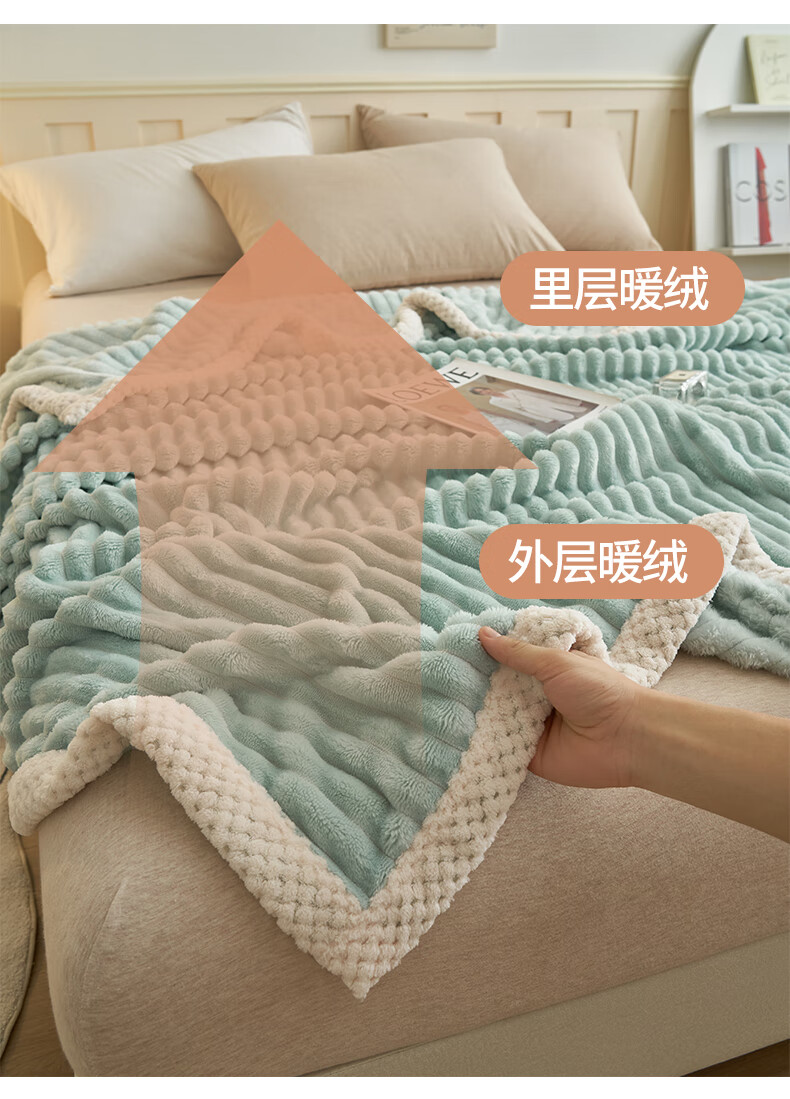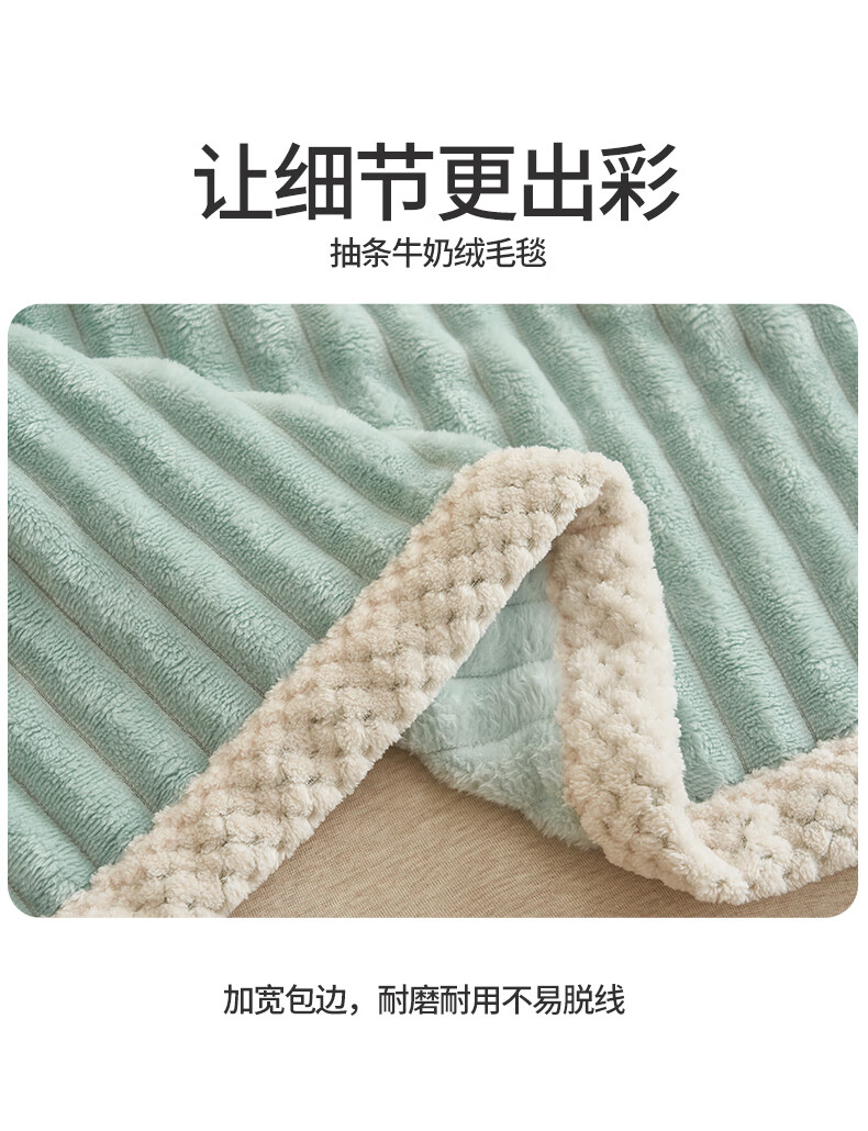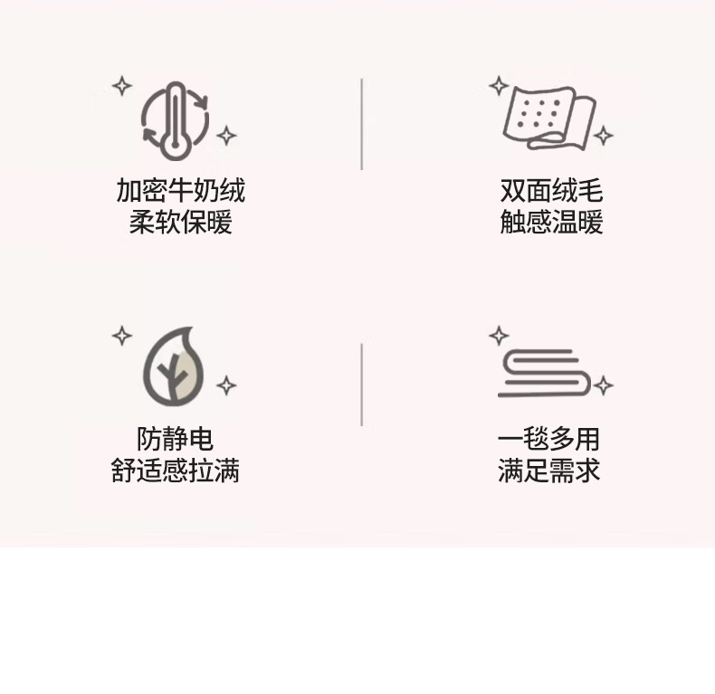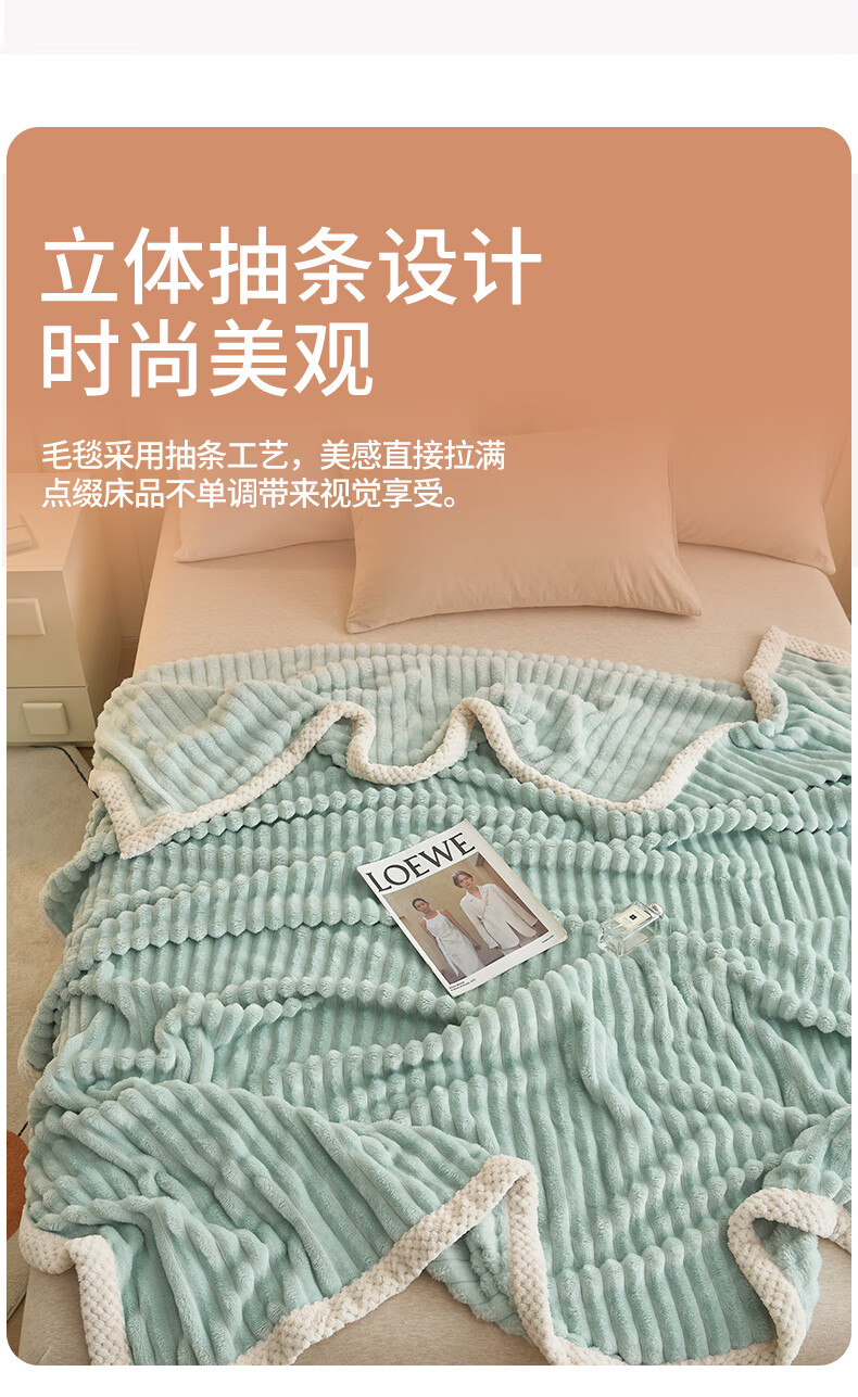 高密牛奶绒,绒毛丰盈密实,工艺厚实紧密柔软保暖;高品质印染工艺,着色安全且色牢度高;毛毯采用抽条工艺,美感直接拉满