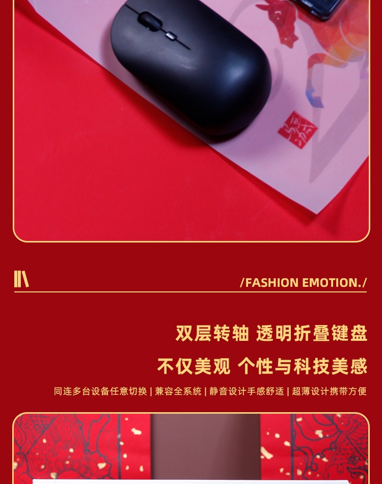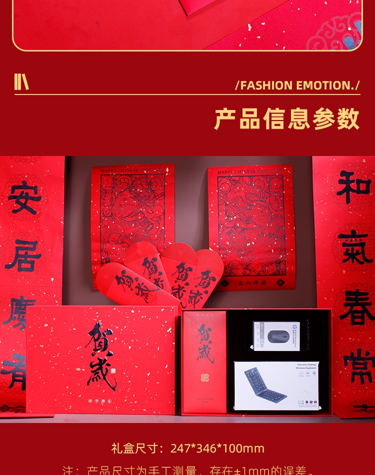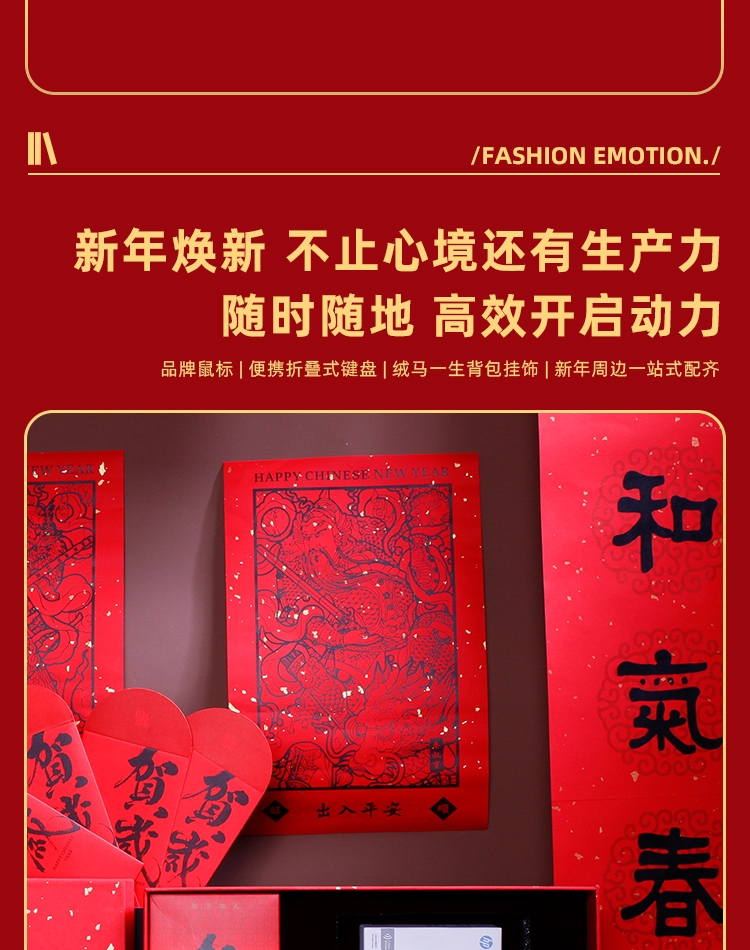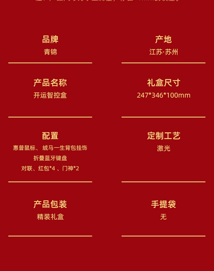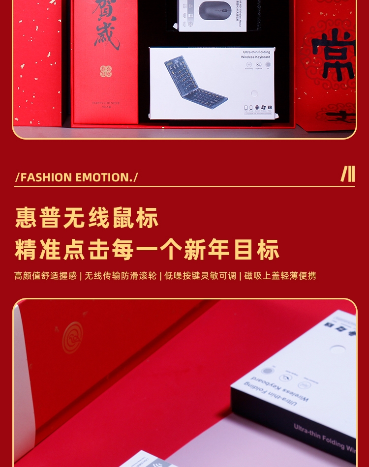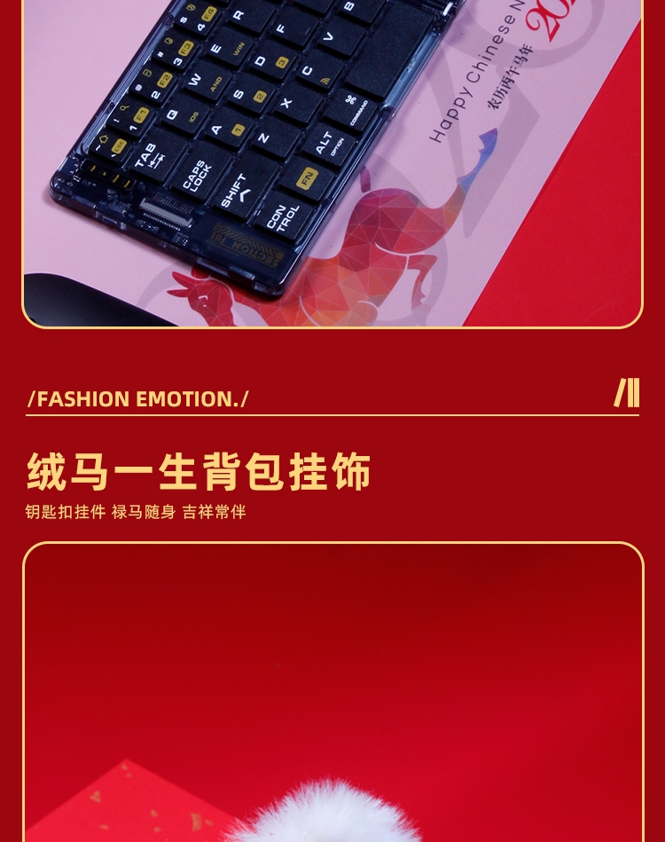配置清单:惠普鼠标*1 绒马一生背包挂饰*1折叠蓝牙键盘*1 对联*1-红包*4 门神*2 精装礼盒手提袋*1
