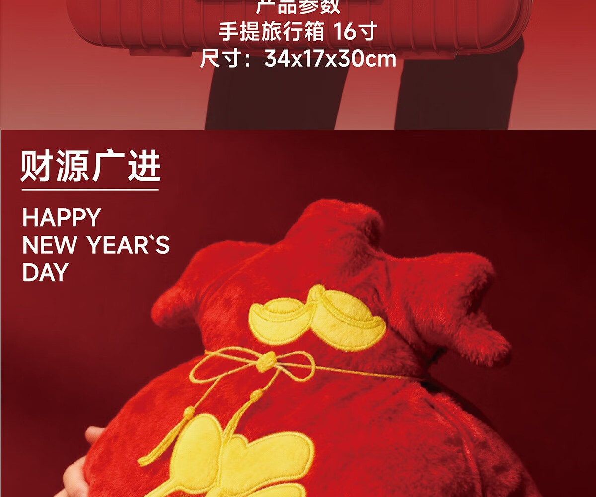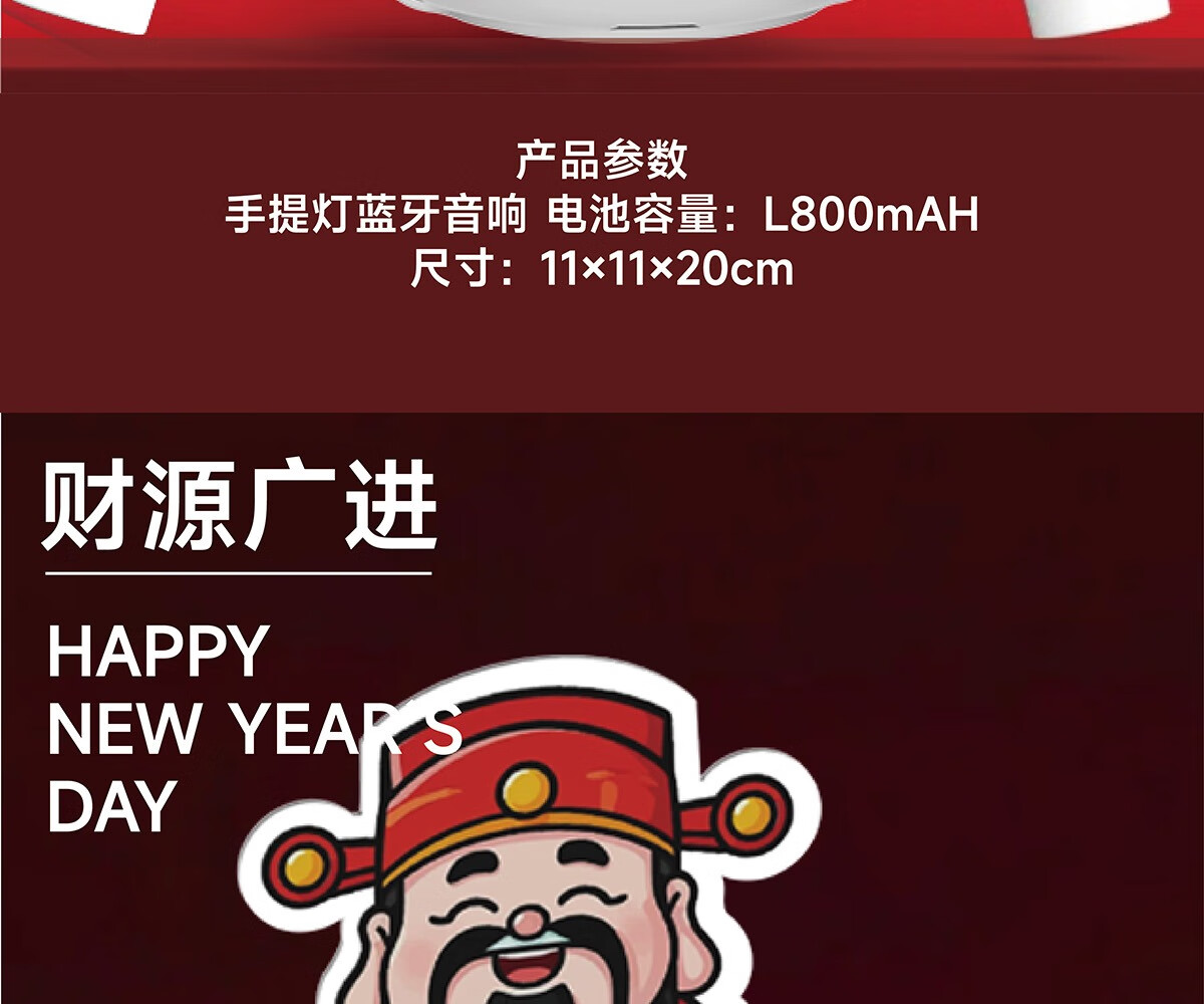 手提灯蓝牙音响: 一提在手,声光俱备,户外良伴;财神爷旋转手机支架:财神相伴,手机稳转,招财又实用;手提行李箱: 轻便能装,推行顺滑,旅途无忧。