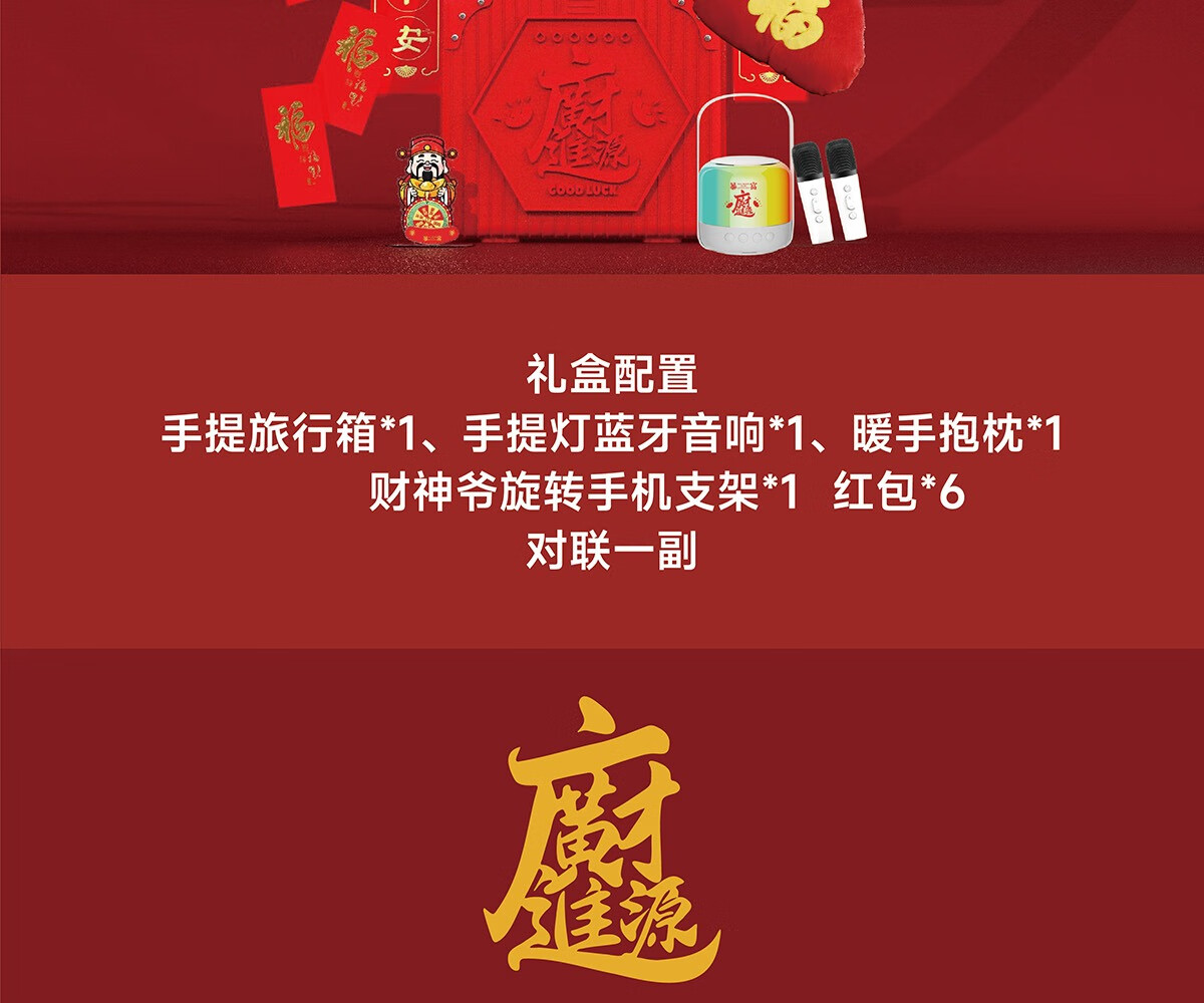 配置清单:手提旅行箱*1、手提灯蓝牙音响*1、麦克风*1 财神爷旋转手机支架*1 暖手枕*1红包*6 对联一副
