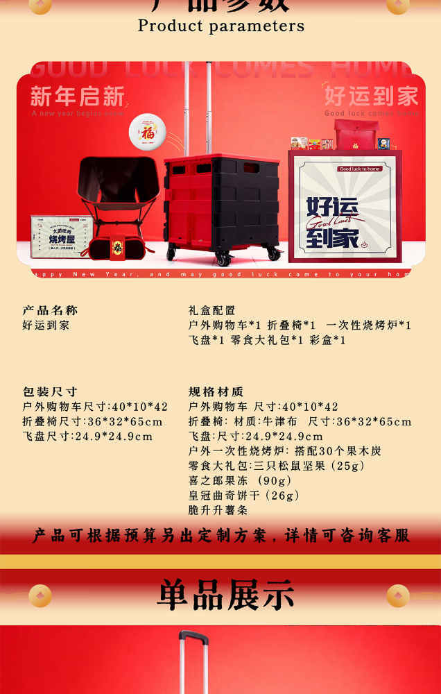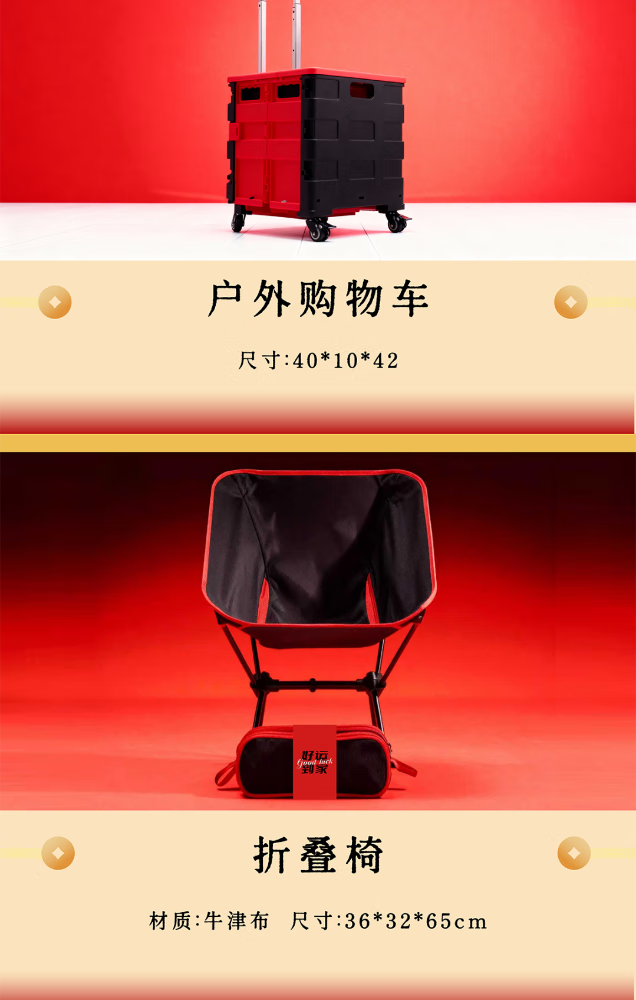 配置清单:户外购物车*1、折叠椅*1、一次性烧烤炉*1 飞盘*1 零食大礼包*1