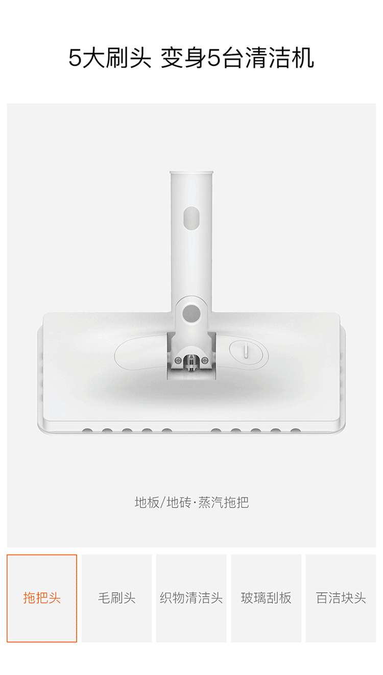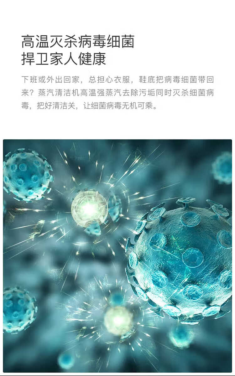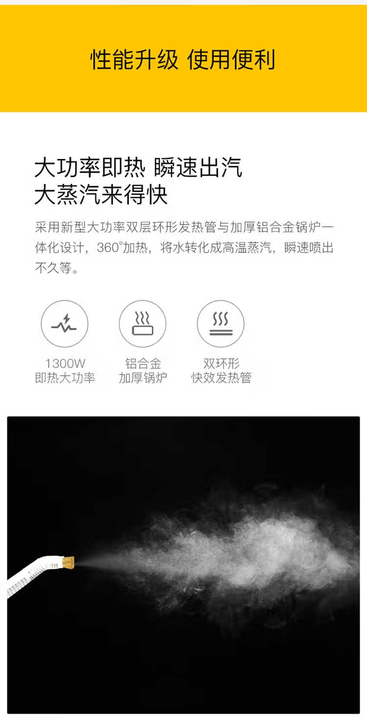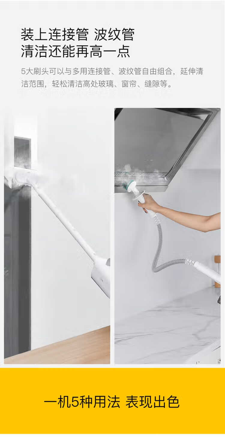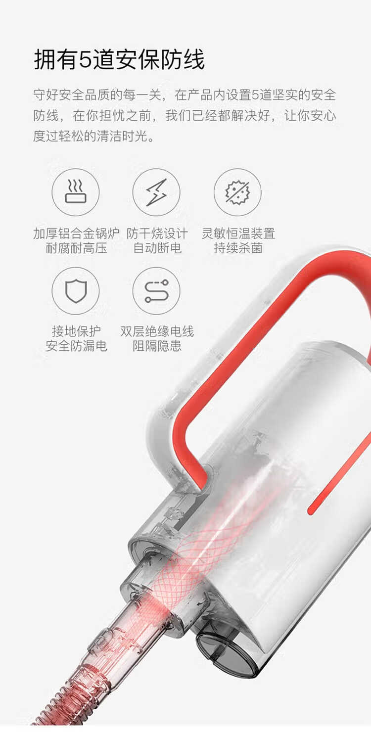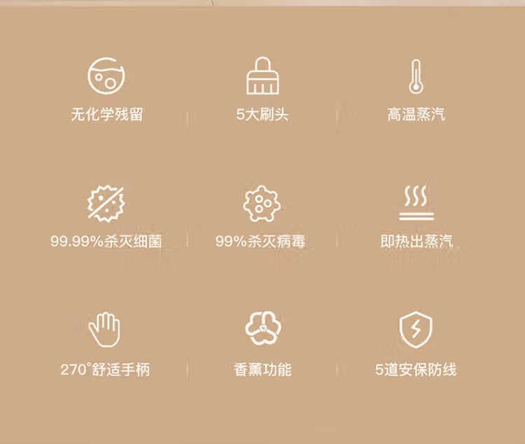加厚铝合金锅炉耐腐耐高压;防干烧设计自动断电;蒸汽清洁,高温杀菌灭病毒高达99%以上;5大刷头;即出蒸汽