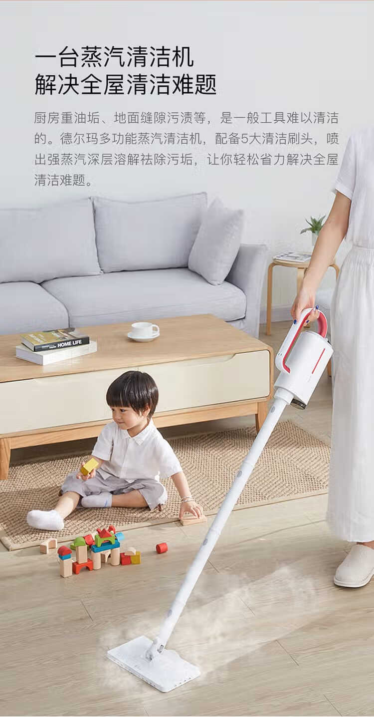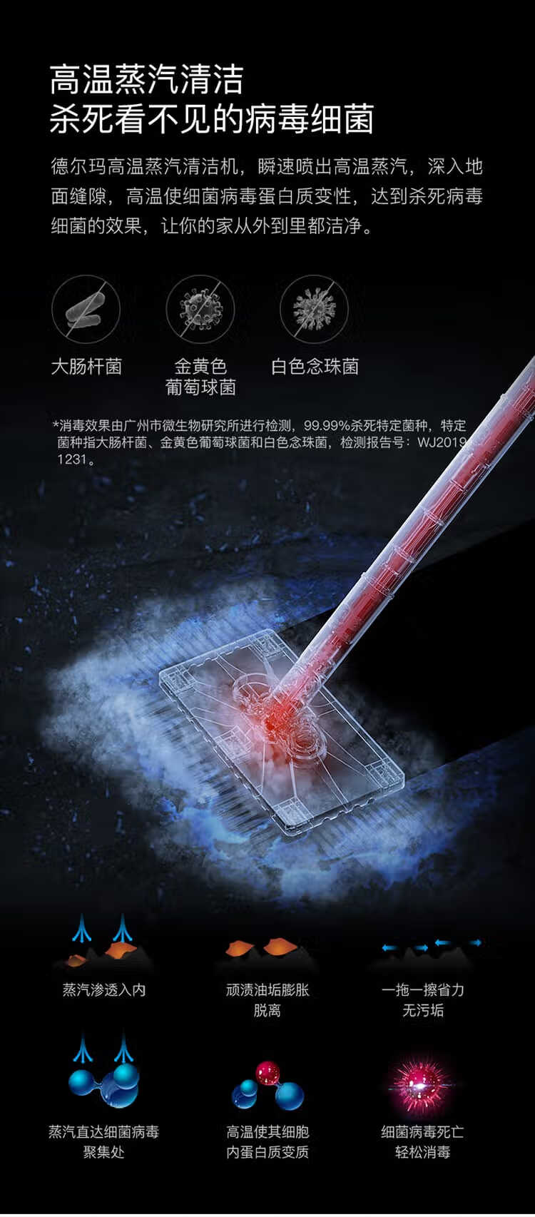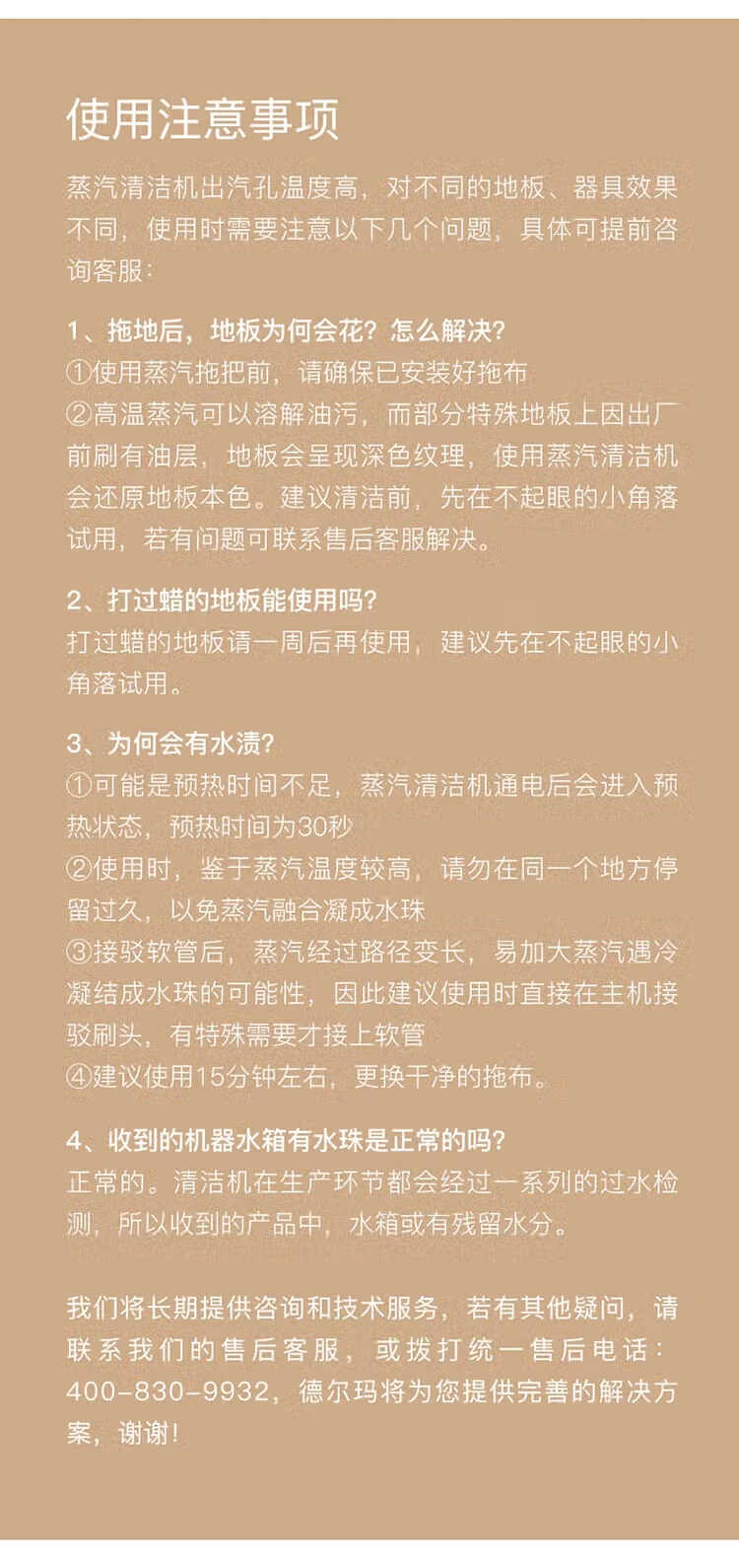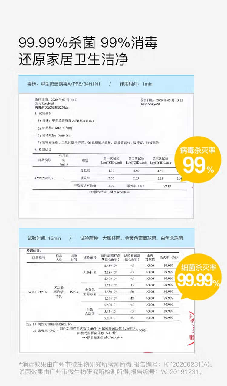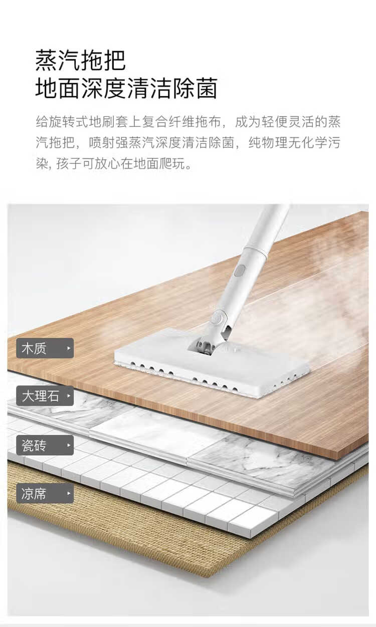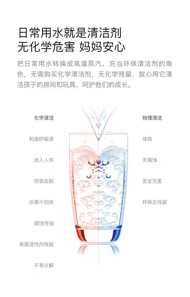 加厚铝合金锅炉耐腐耐高压;防干烧设计自动断电;蒸汽清洁,高温杀菌灭病毒高达99%以上;5大刷头;即出蒸汽