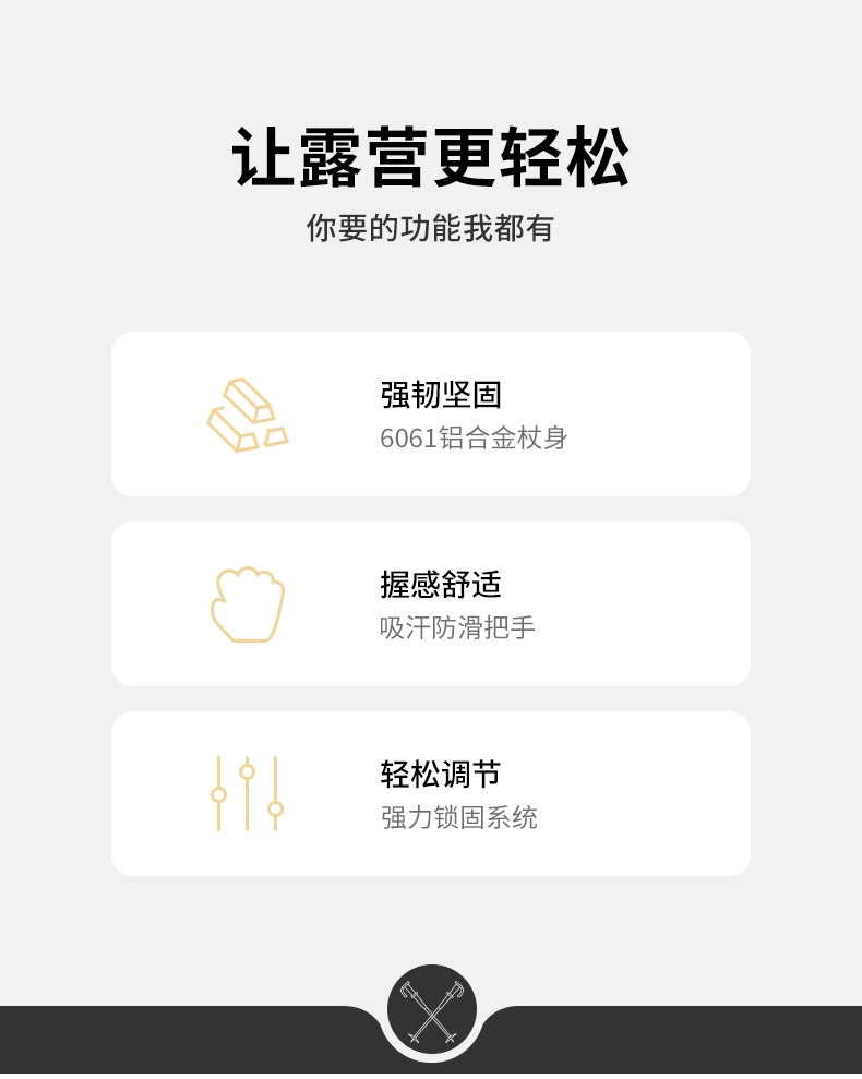 6061铝合金杖身,轻盈坚固,久用不易变形;速扣安全锁,简单一扣即可牢固锁定;EVA防滑手柄,柔软吸汗,时刻保持舒适握持感
