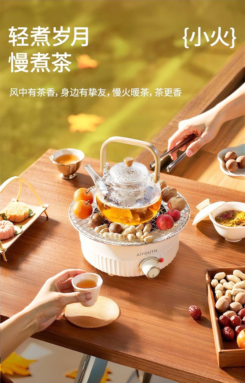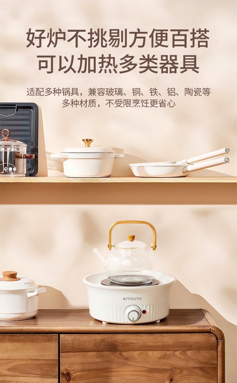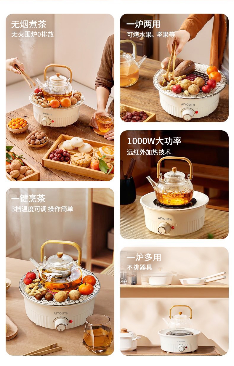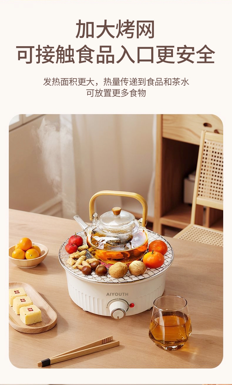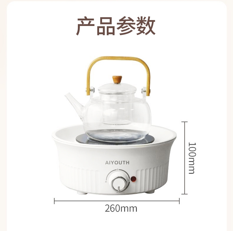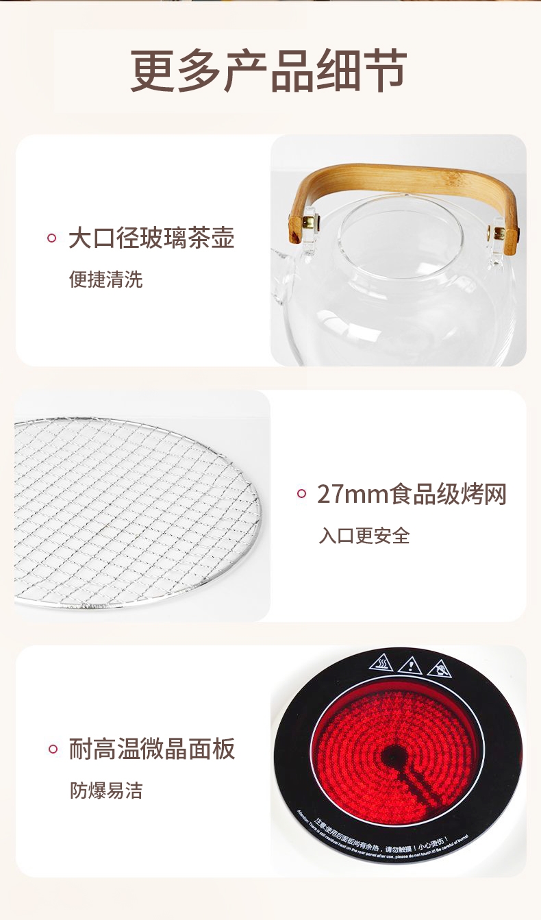 适配耐高温茶壶,适合多种常见壶具;可蒸煮多种茶叶,不串味,茶味更醇;三档火力调节,旋钮操控,控温更贴心
