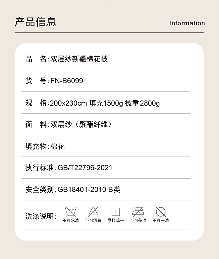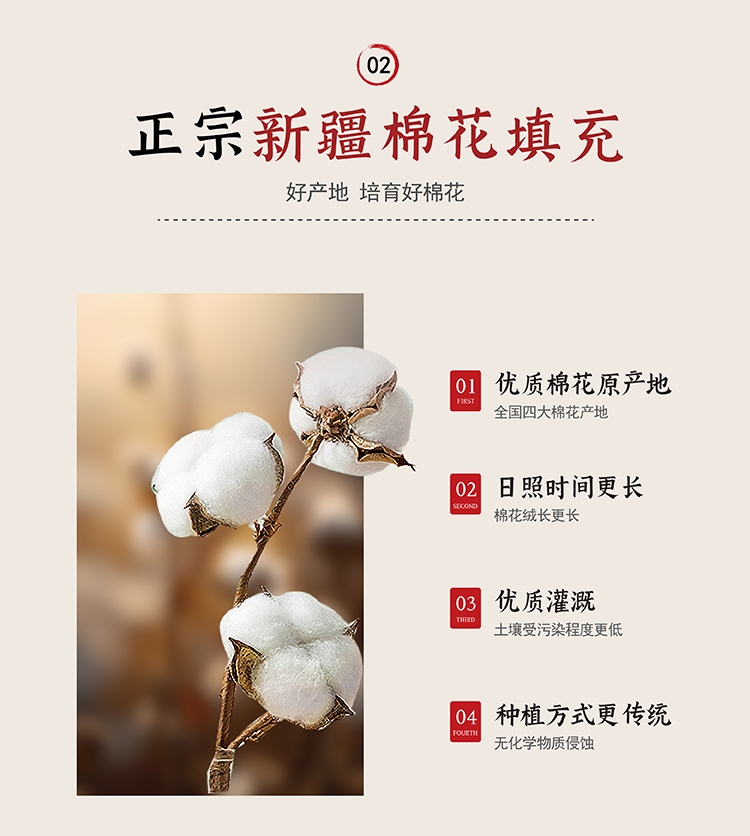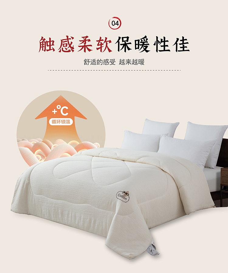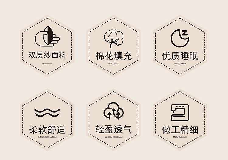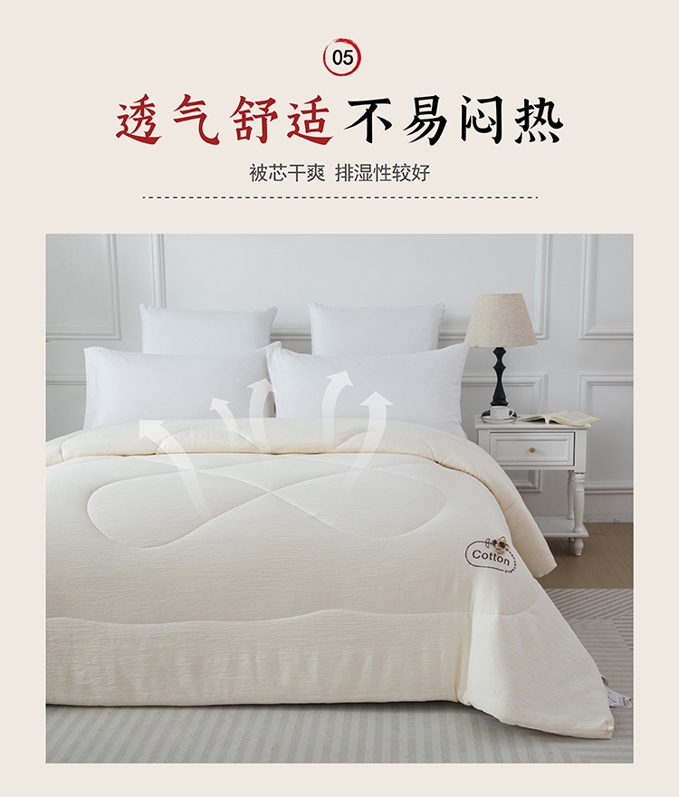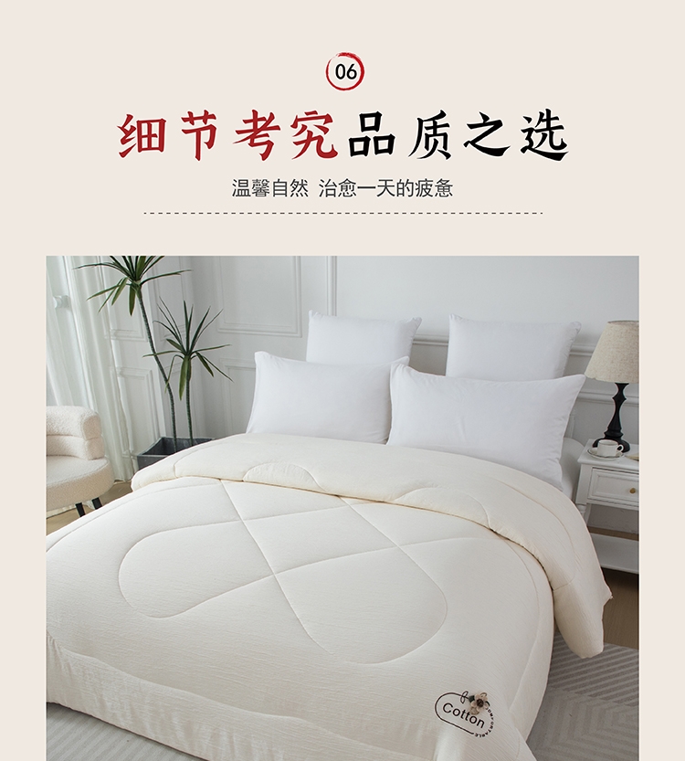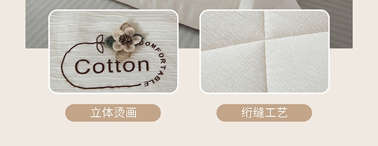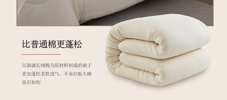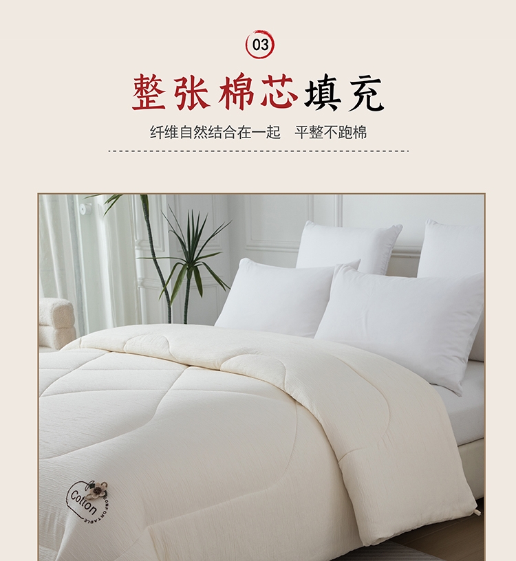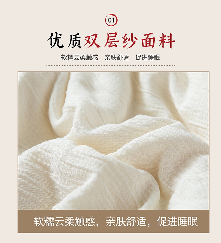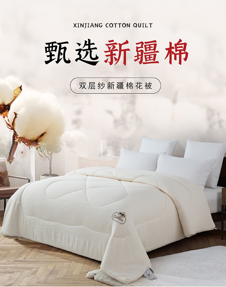 双层纱面料,软糯云柔触感,亲肤舒适;被芯采用优质新疆棉花填充,透气舒适,保暖性能佳;整张棉芯填充,平整不跑棉