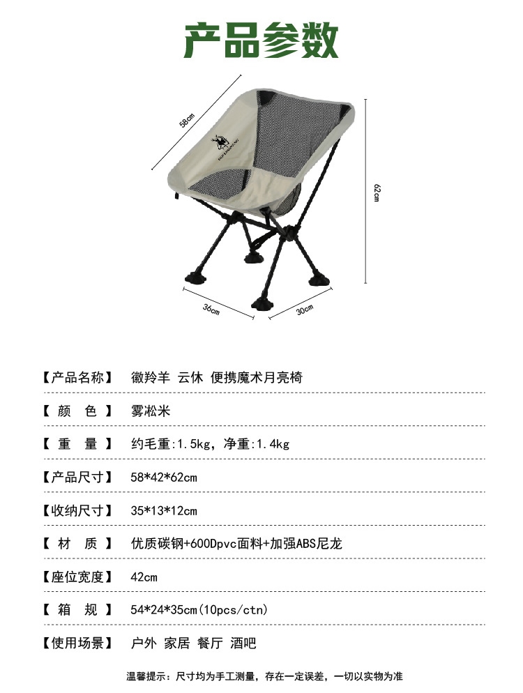 配置清单:产品参数:尺寸:58*42*62cm 颜色:米色 离地高度:25cm 收纳尺寸:35*13*12cm 重量:1.4kg 材质:支架:喷涂钢管;坐垫:高密度牛津布