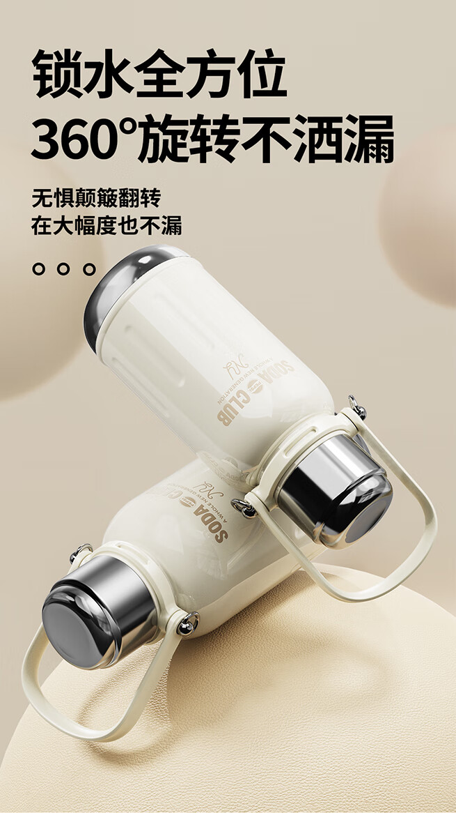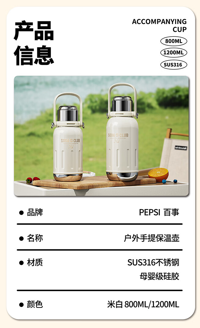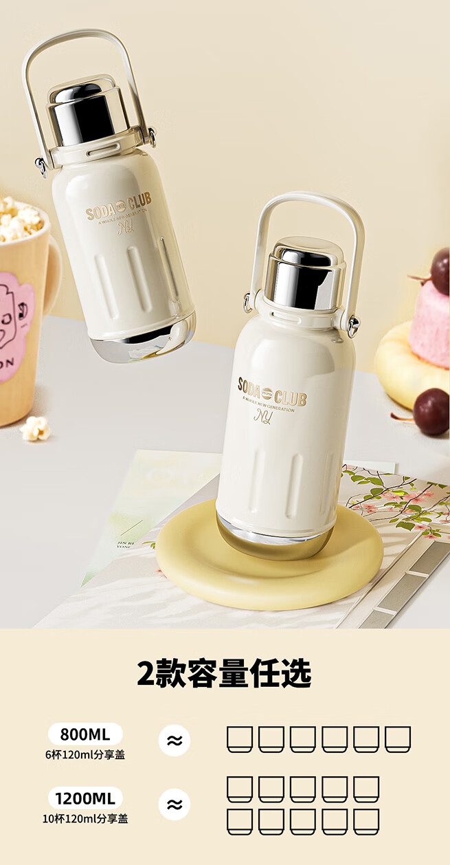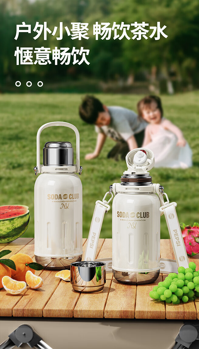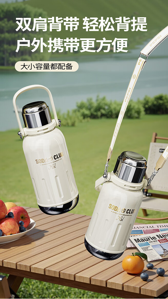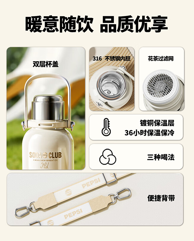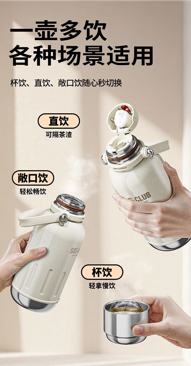 双层杯盖,杯盖可以当茶杯;800毫升容量;背带提手设计