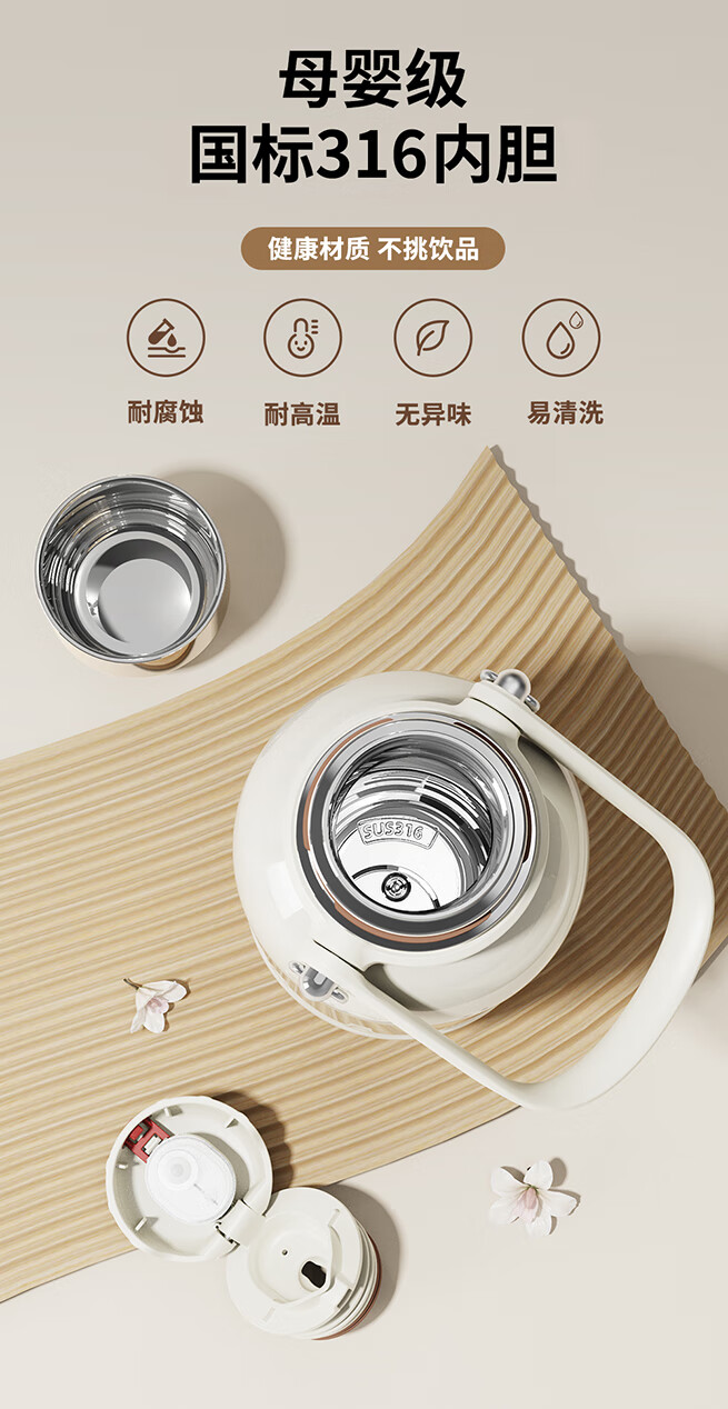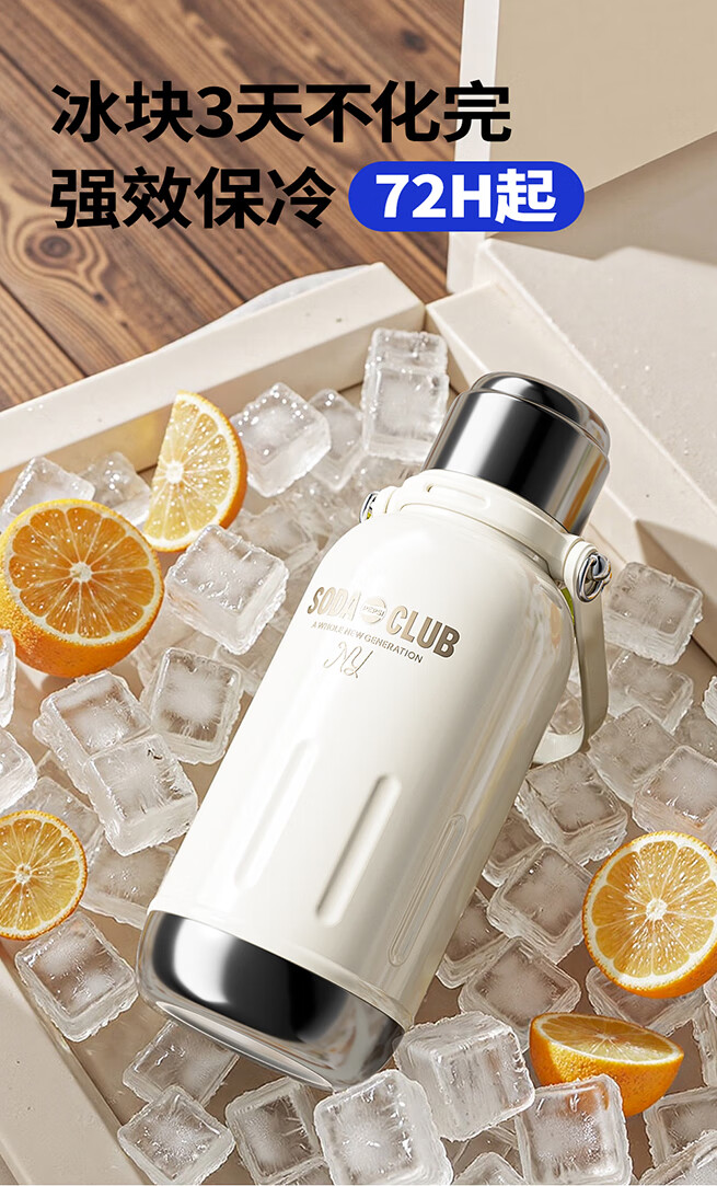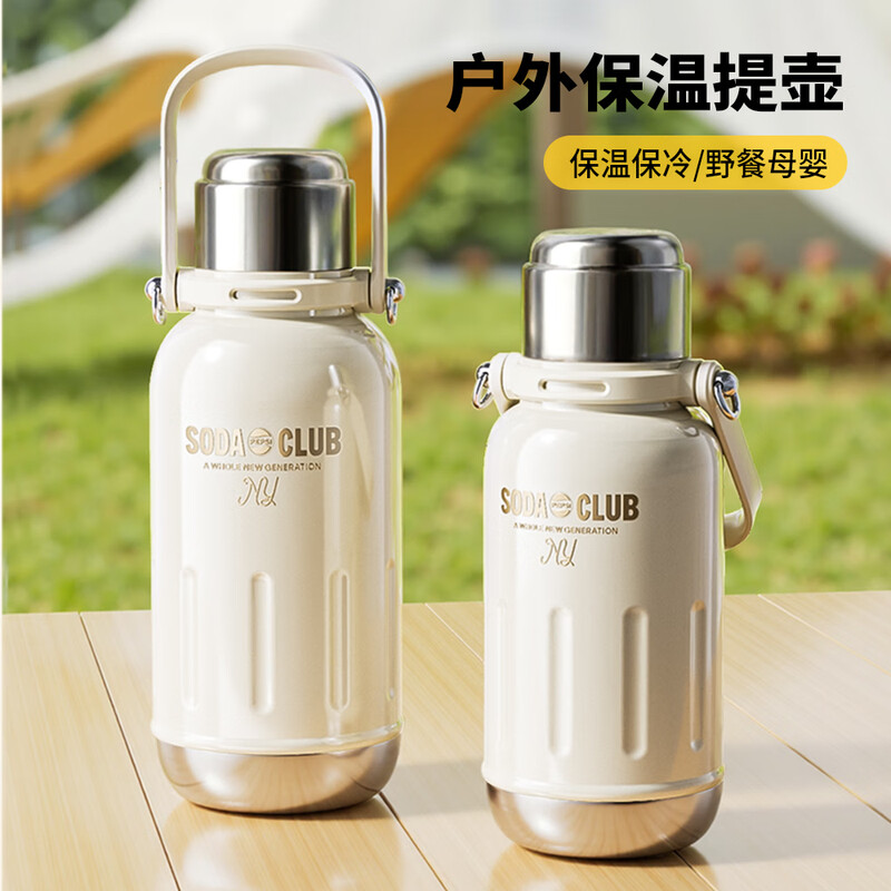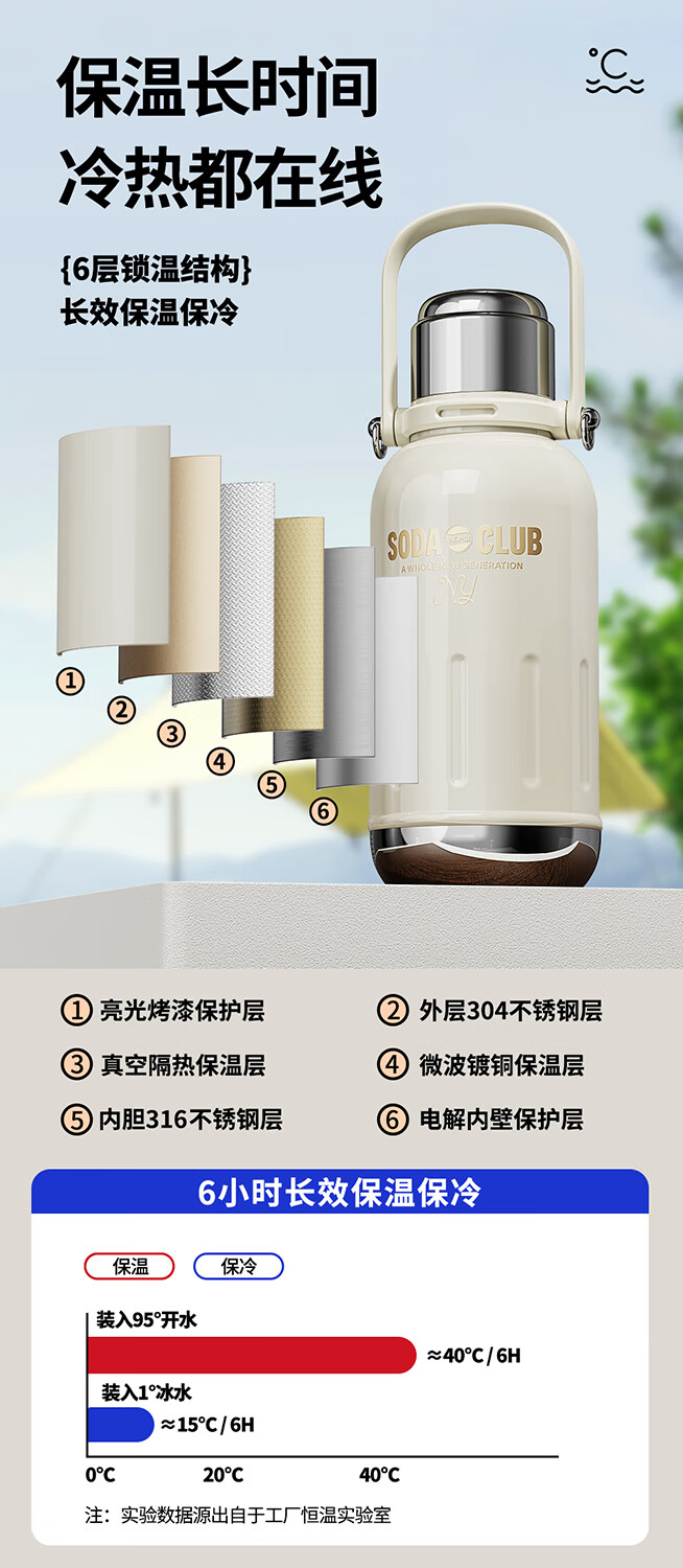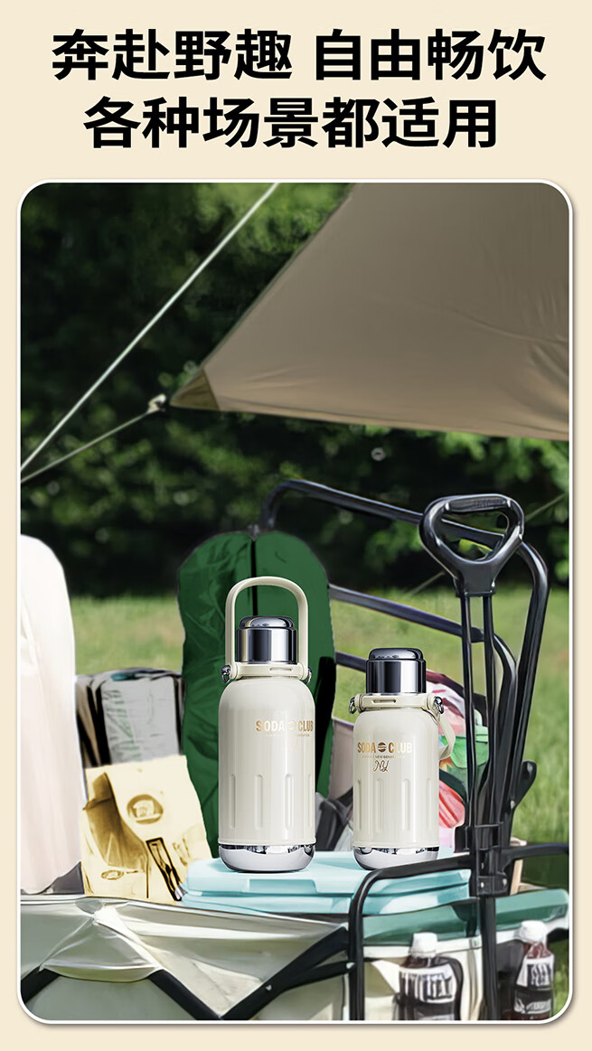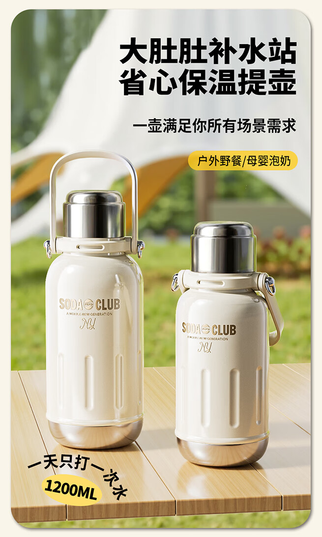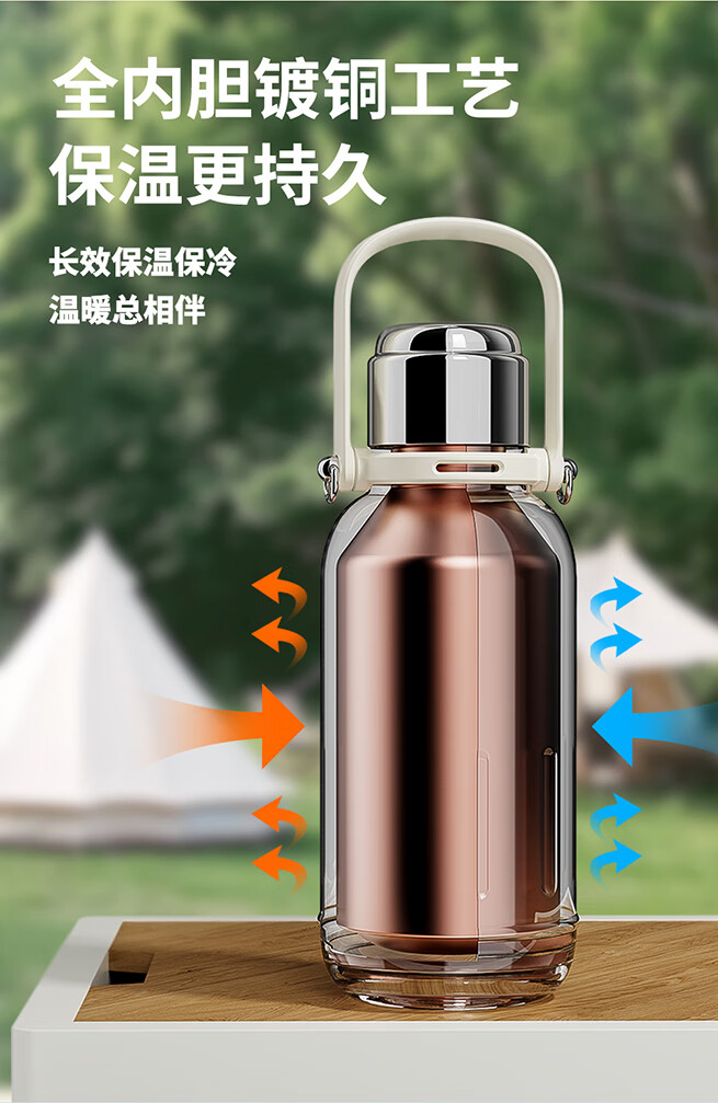 双层杯盖,杯盖可以当茶杯;800毫升容量;背带提手设计