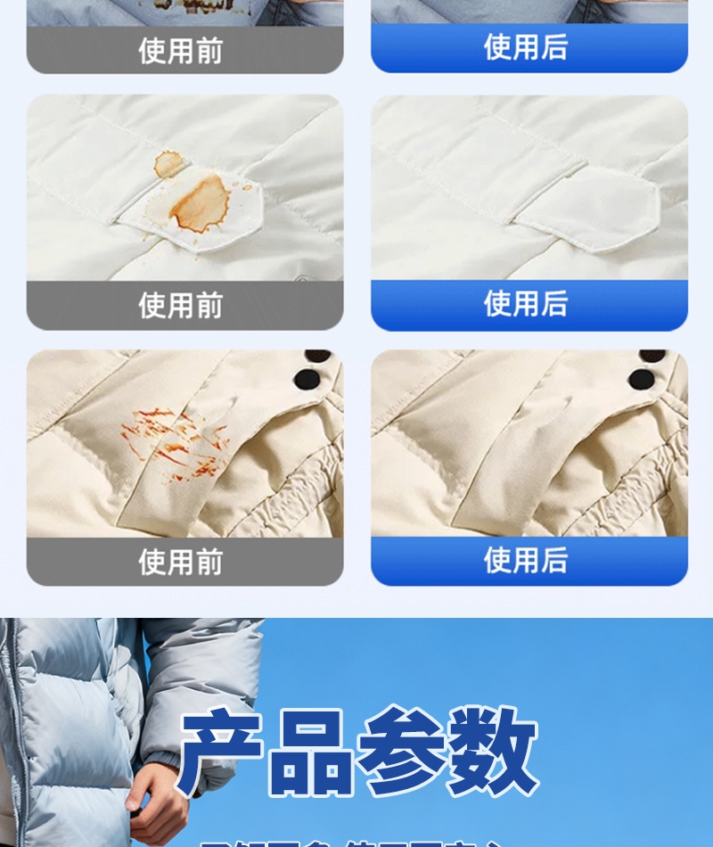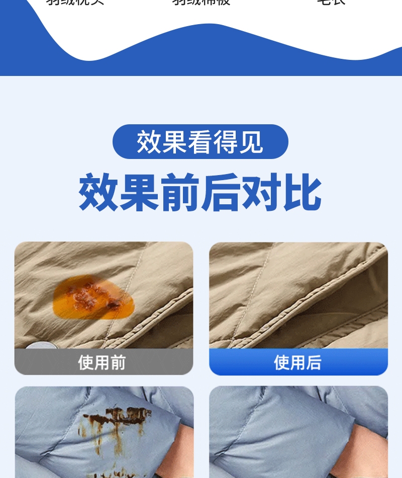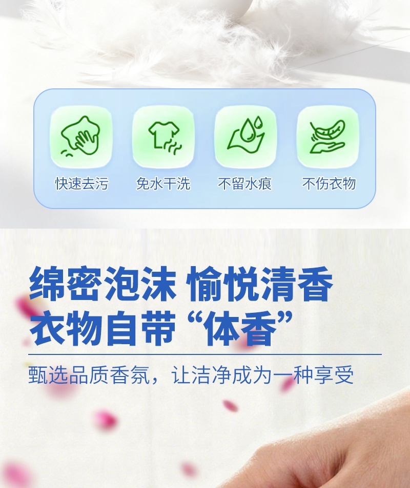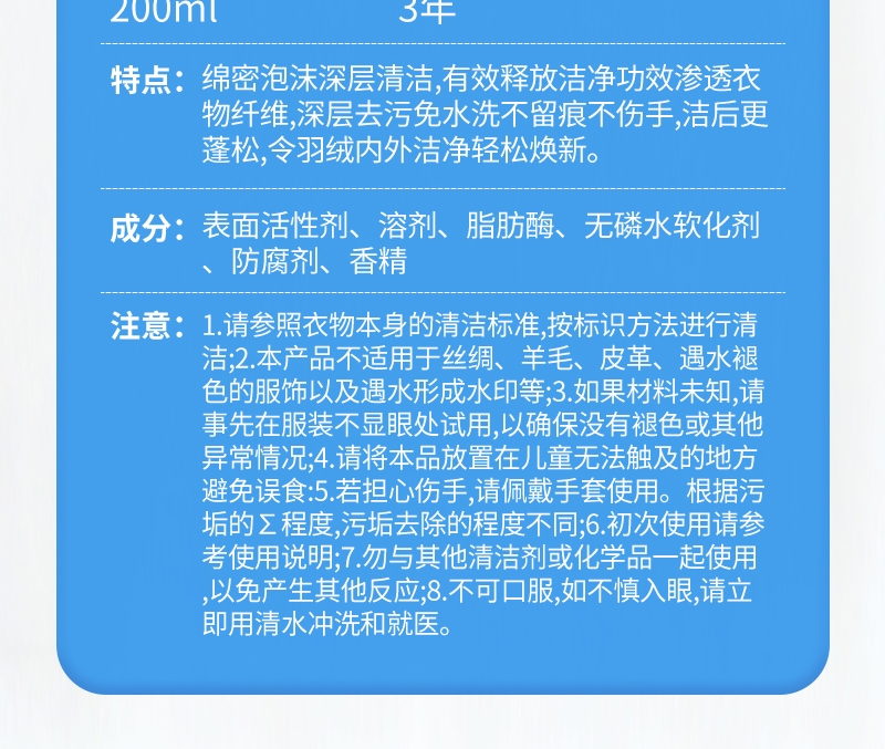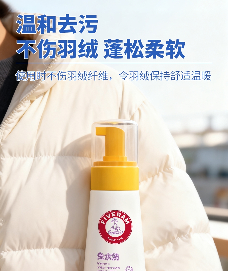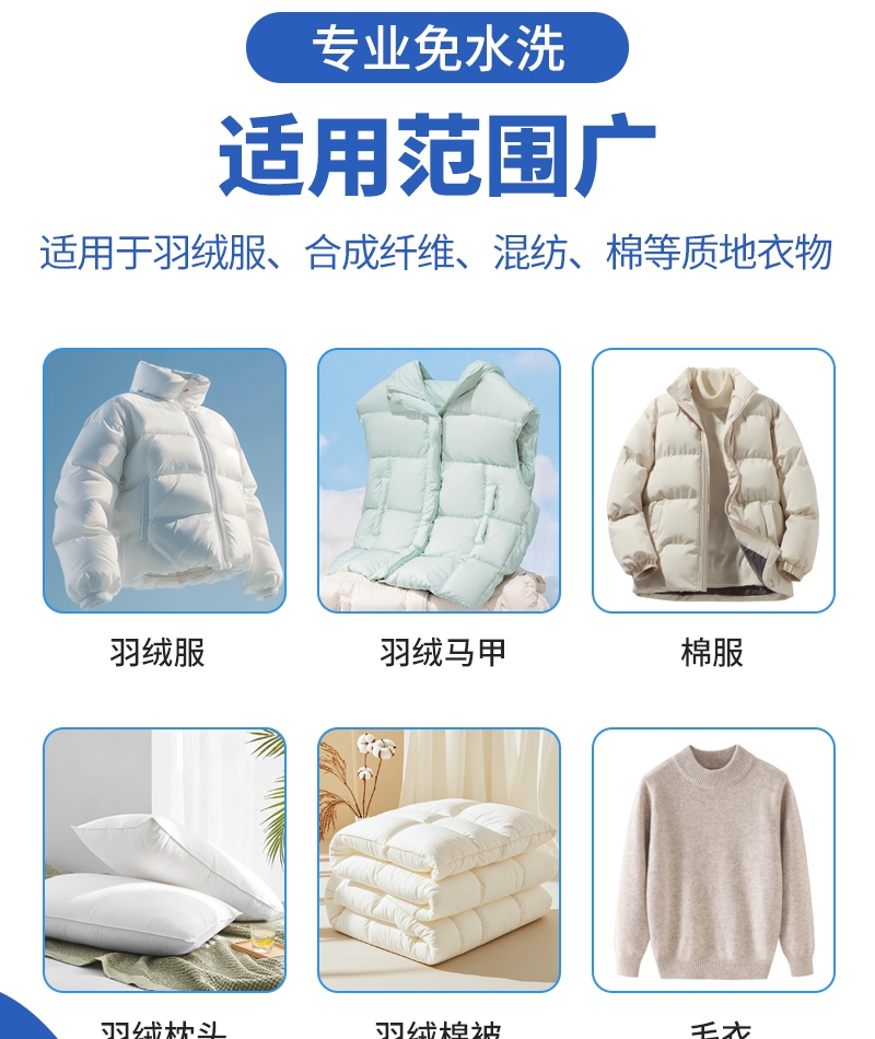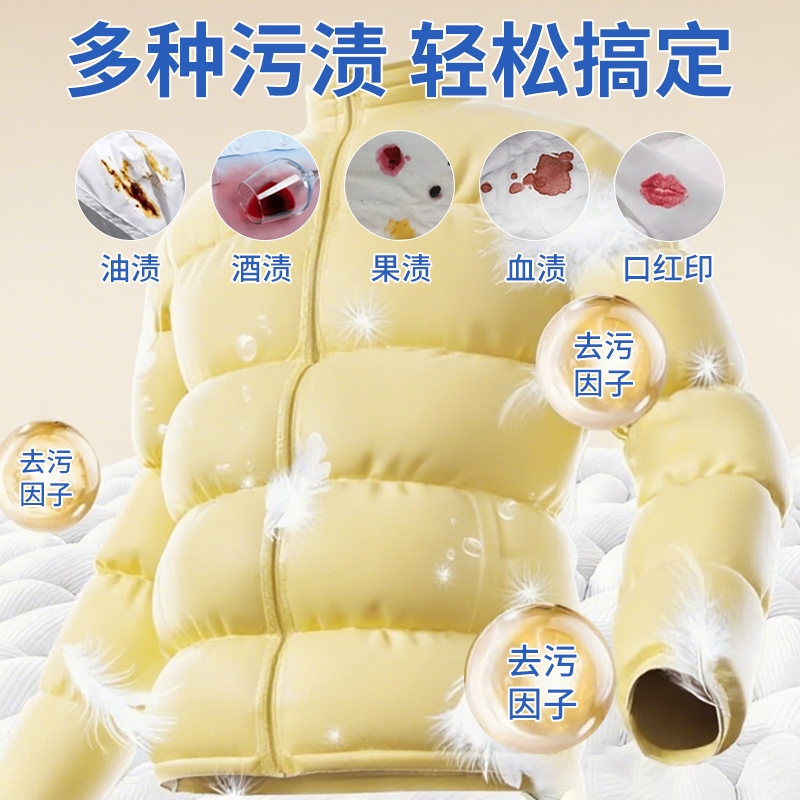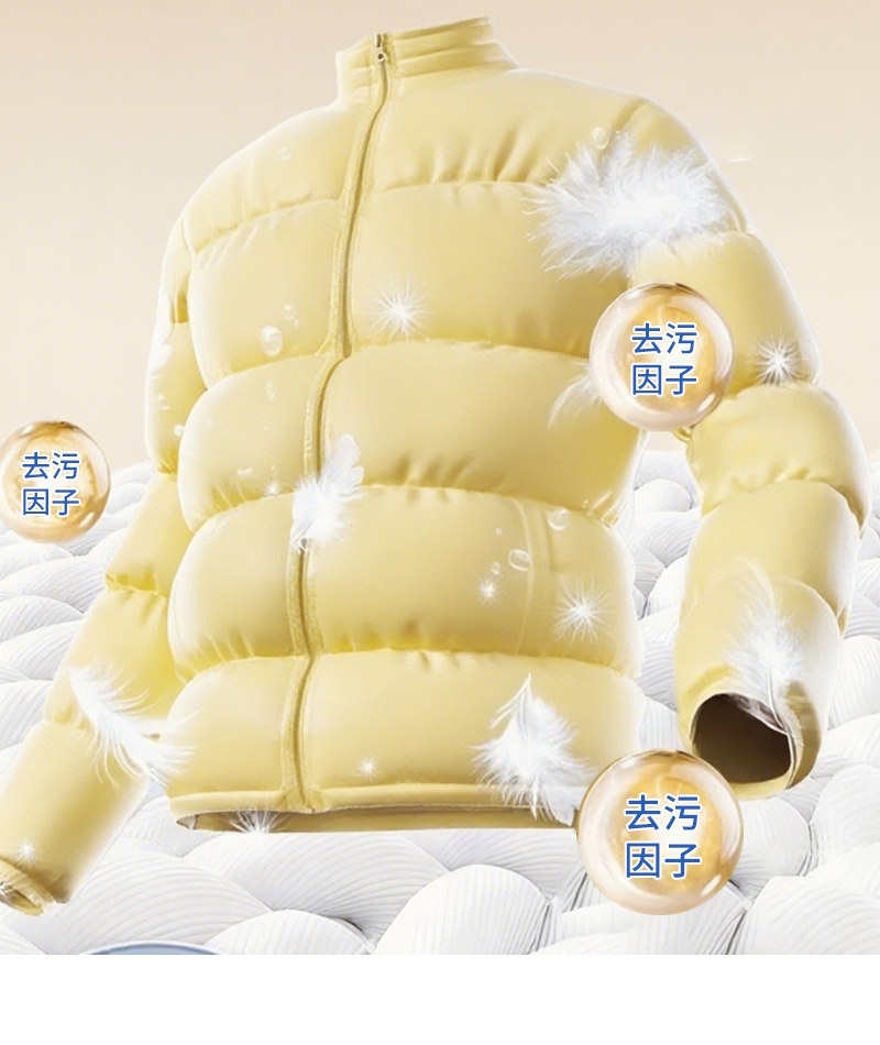 温和去污,不伤羽绒纤维,蓬松柔软,持续保暖;添加去污因子,泡沫绵密,分解带走污渍;适用于羽绒服,合成纤维,混纺,棉织衣物