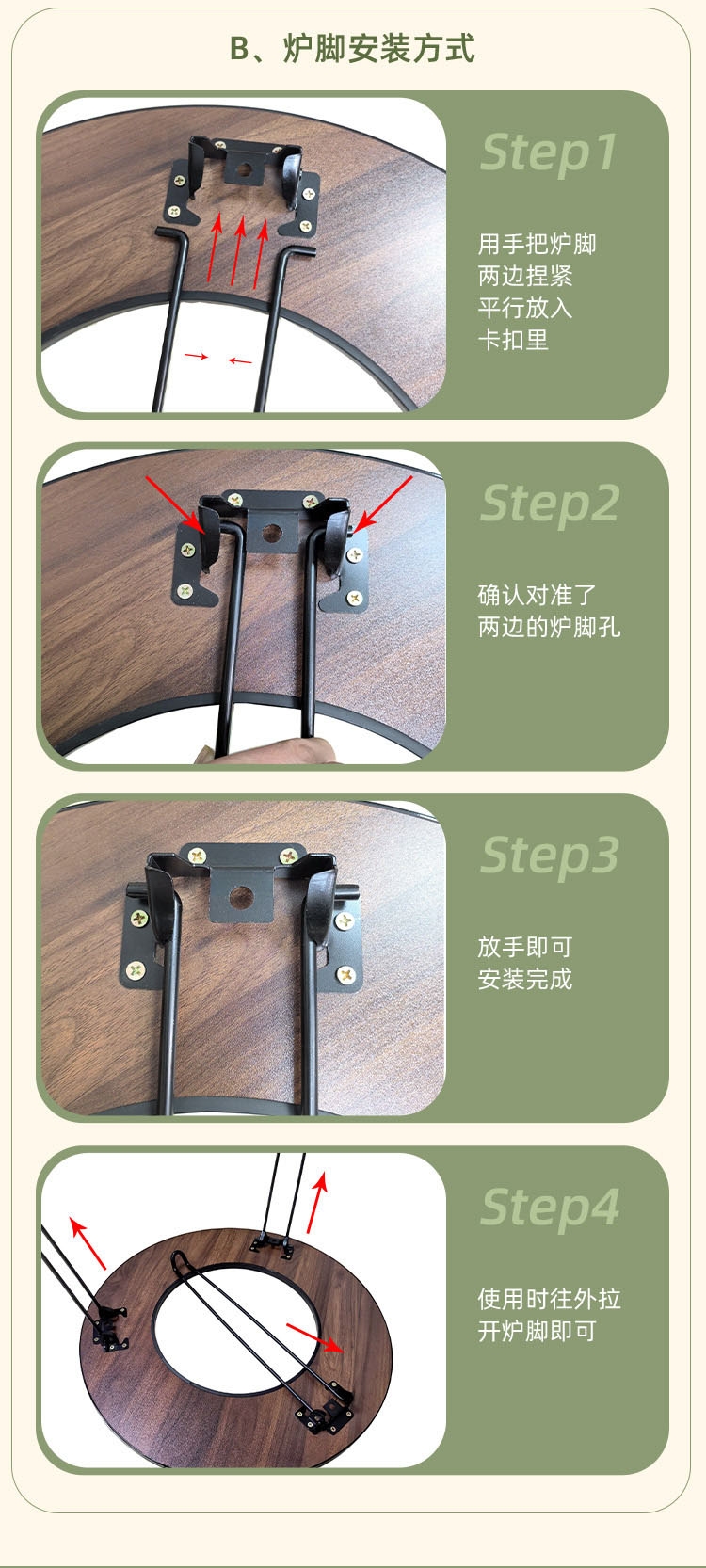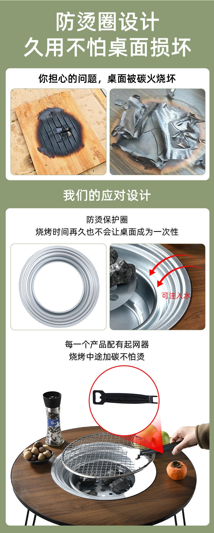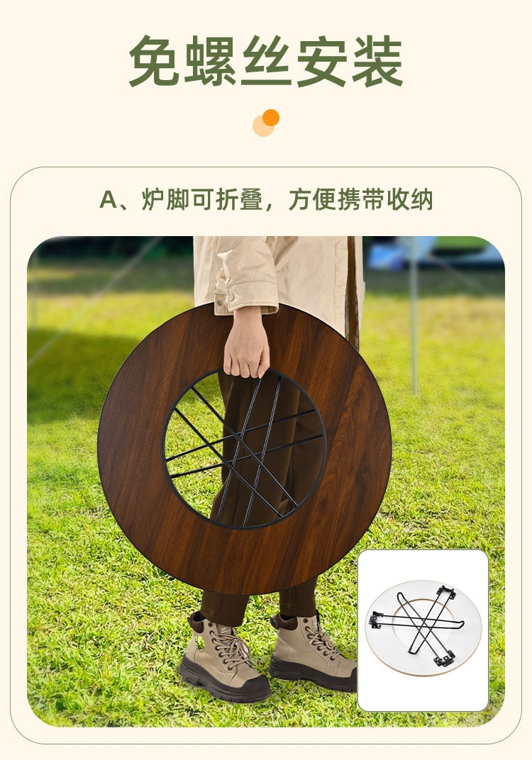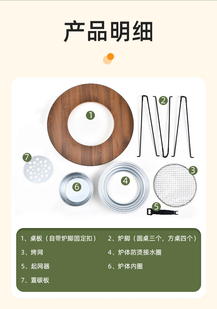 二合一围炉桌,有放置物品的区域,即使餐桌也是围炉;舒适加高桌腿,厚实耐用桌板;隔热少油烟,分体式炭盆;全身可拆卸,清洗更方便