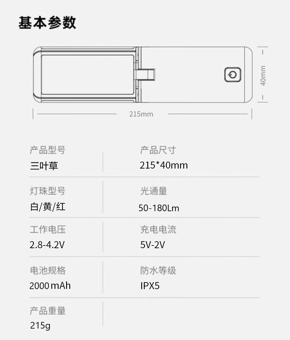 身材小巧,方便携带;带过充过放保护;三色光源,三档调光设计