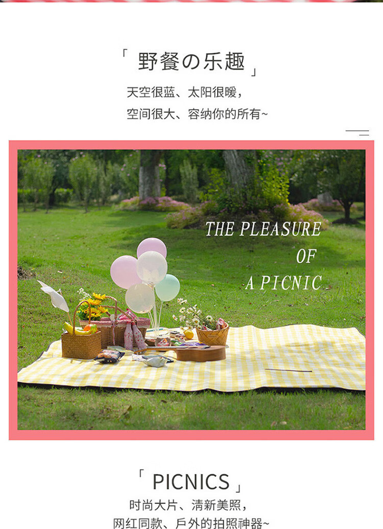 摊开面积大,收起体积小重量轻易于携带与存放;不沾草,污物易清洁; 防水防潮;用于广场绿地、沙滩游玩户外郊游、顶楼阳台、花园地面