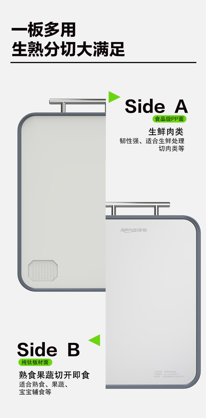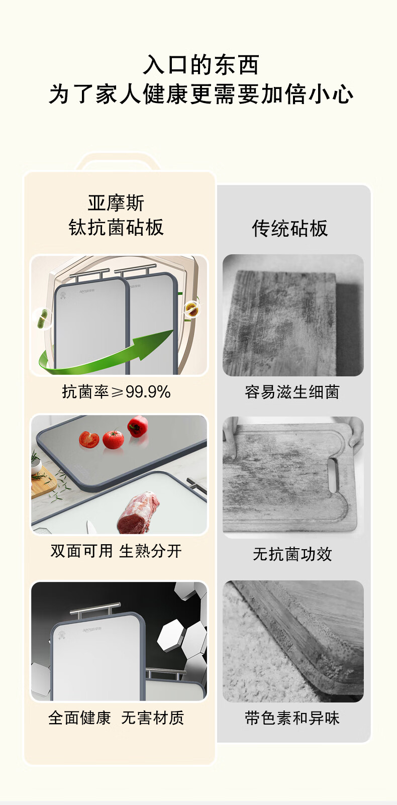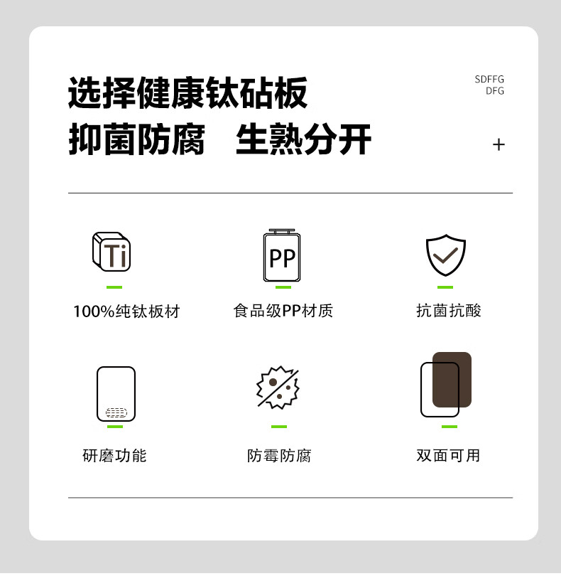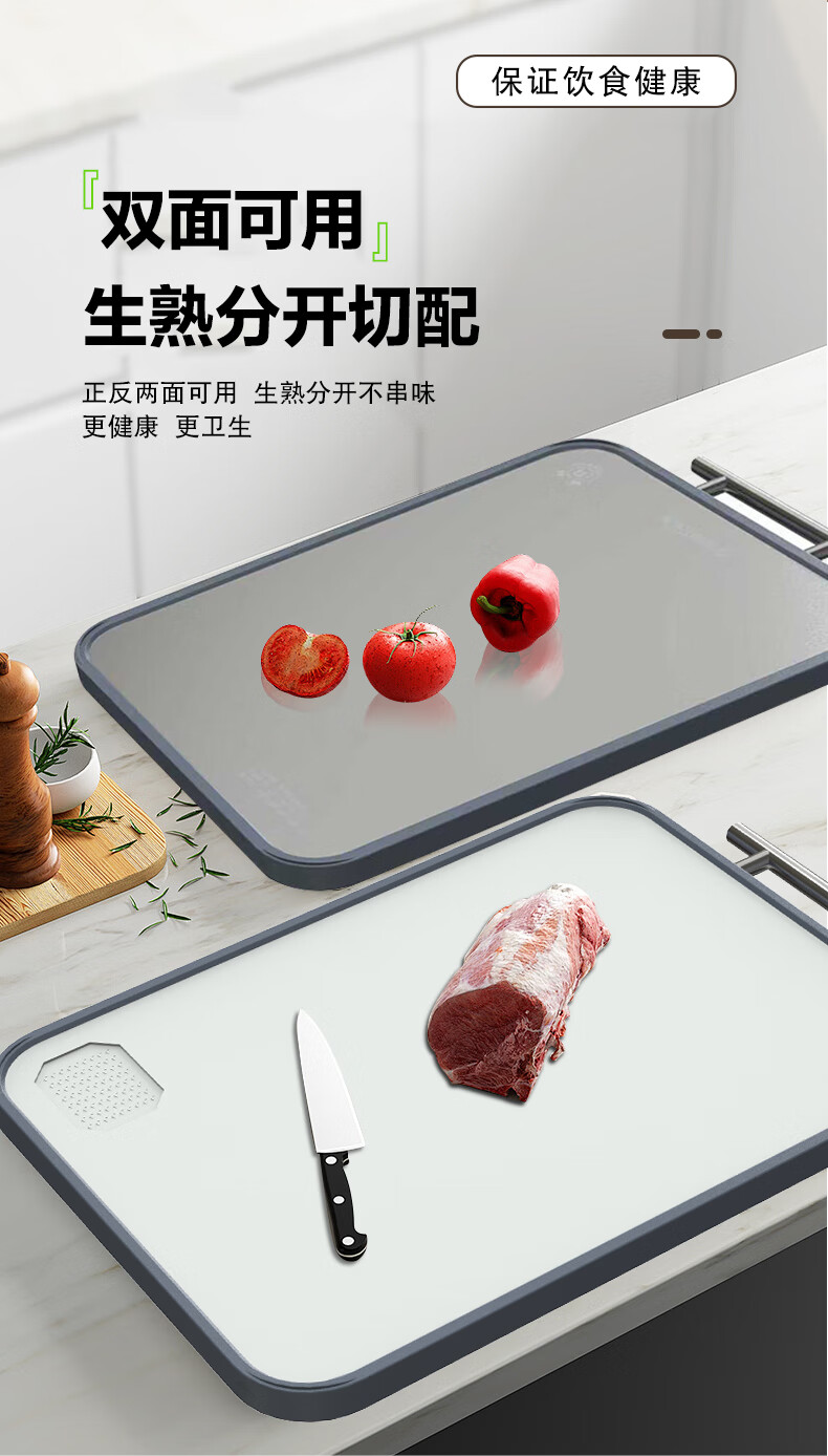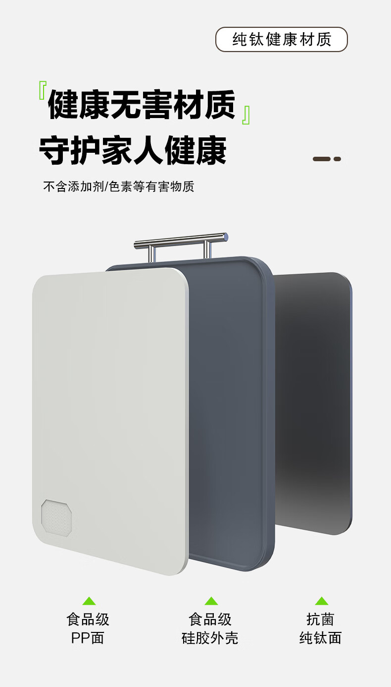 双面砧板,健康材料 -- 99.9%纯钛面和PP;钛砧板有效保鲜抑菌,不发霉、不滋生细菌、防霉抑菌;钛材料硬度高,不易刮花,经久耐用;收纳便捷简单,只需要冲洗或者擦干净