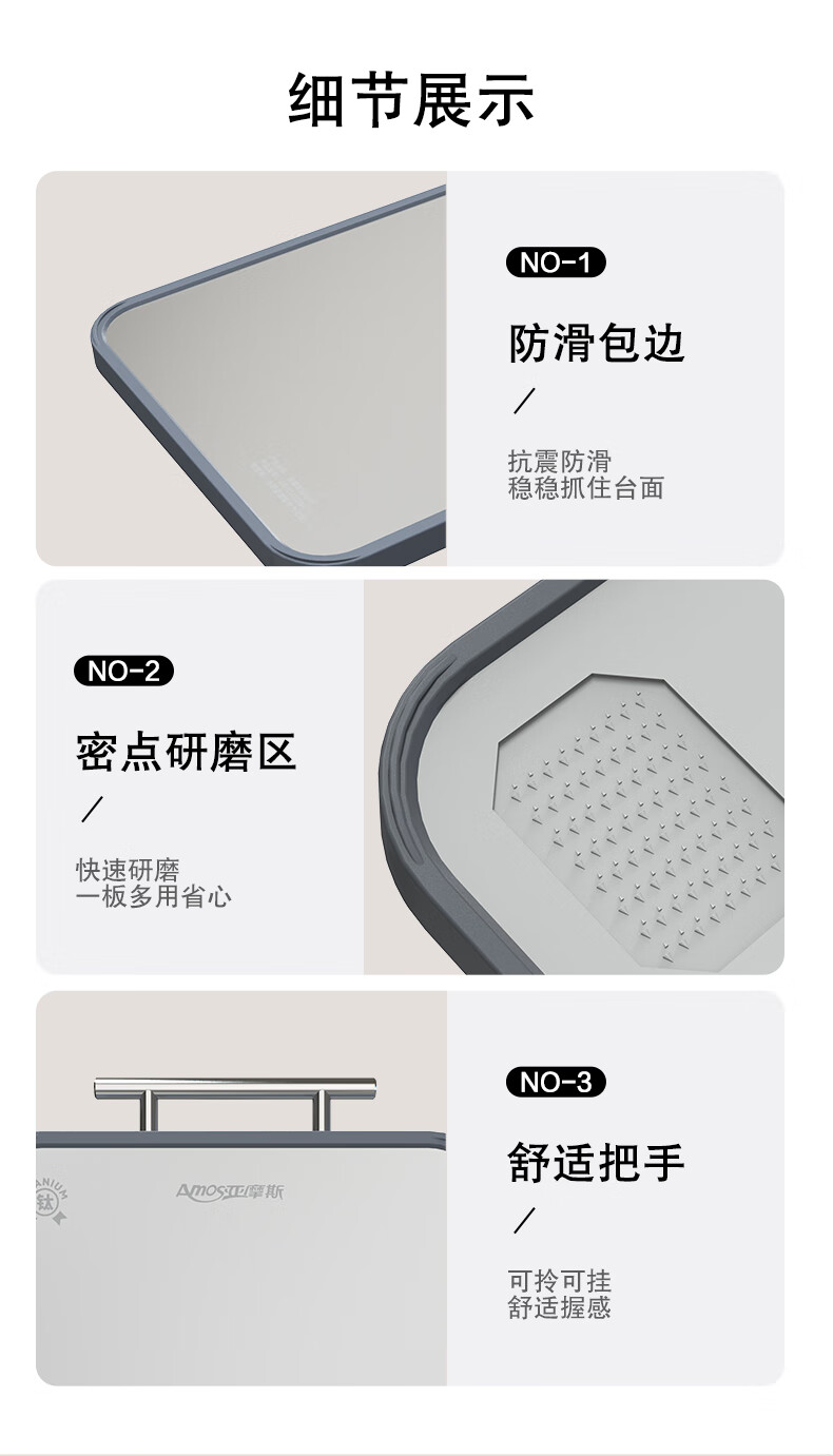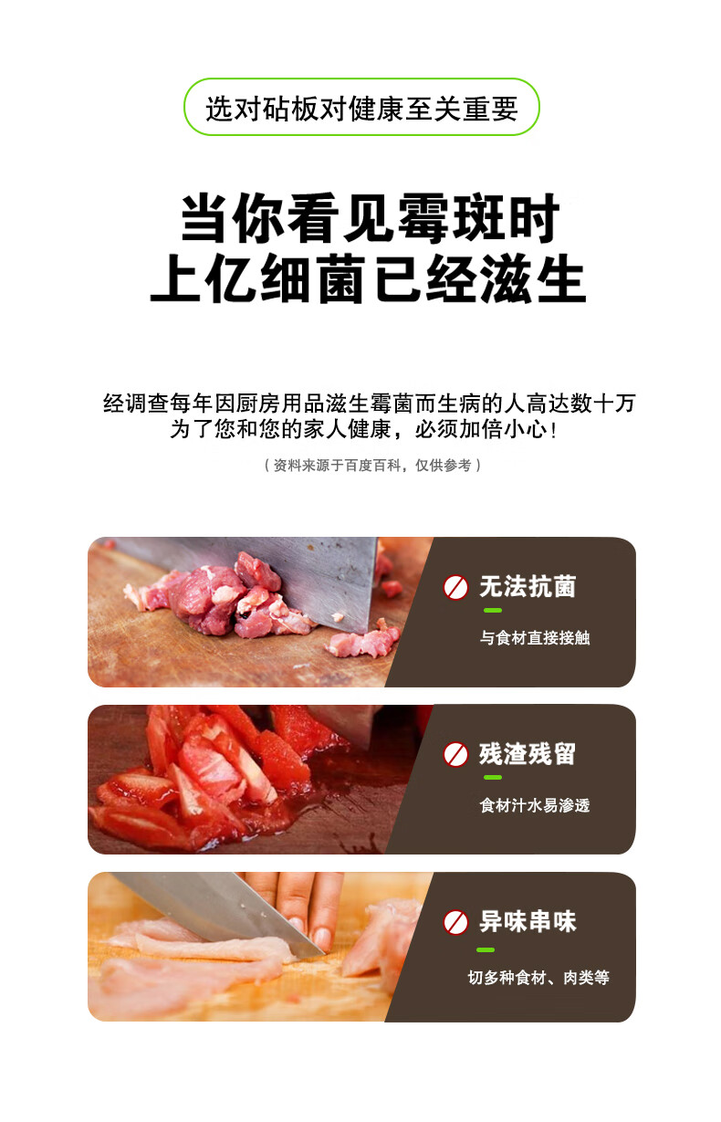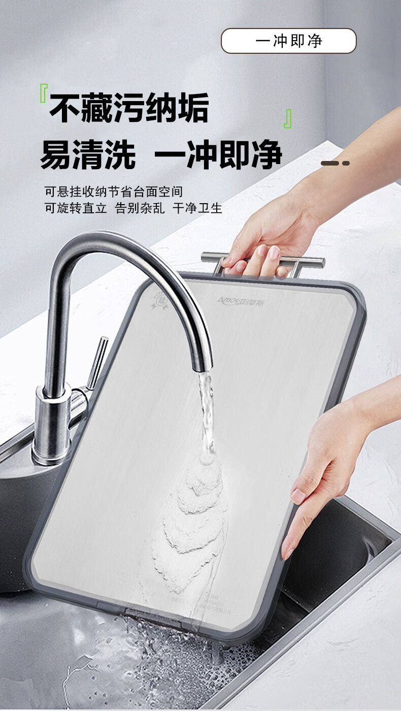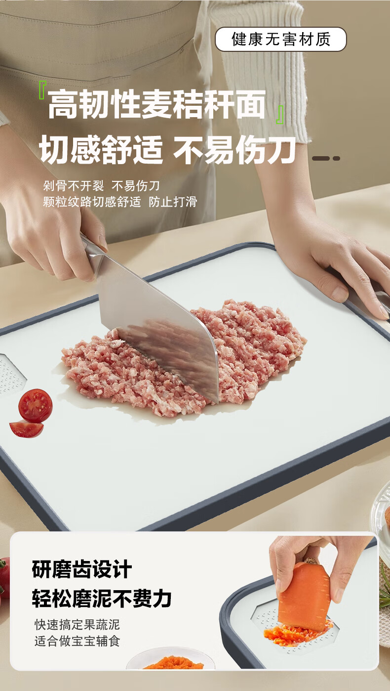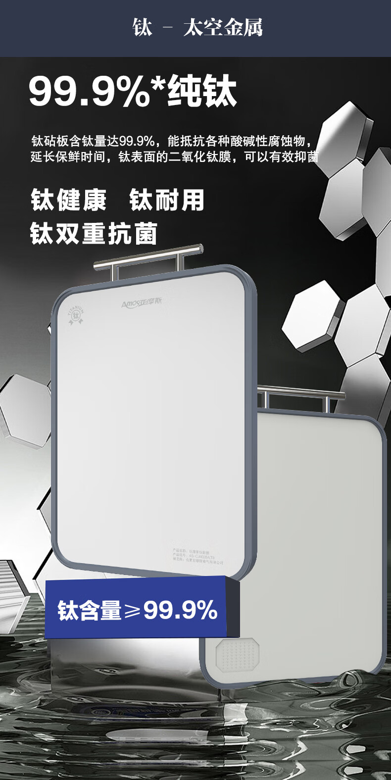 双面砧板,健康材料 -- 99.9%纯钛面和PP;钛砧板有效保鲜抑菌,不发霉、不滋生细菌、防霉抑菌;钛材料硬度高,不易刮花,经久耐用;收纳便捷简单,只需要冲洗或者擦干净