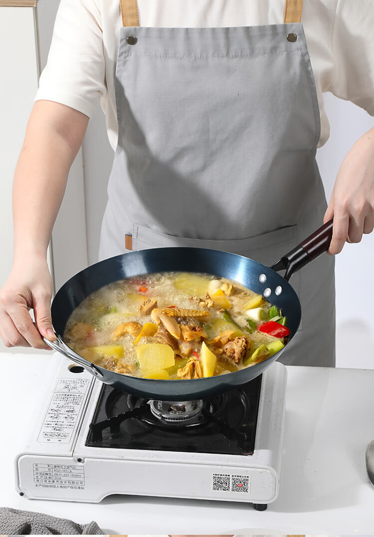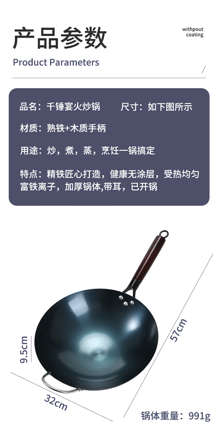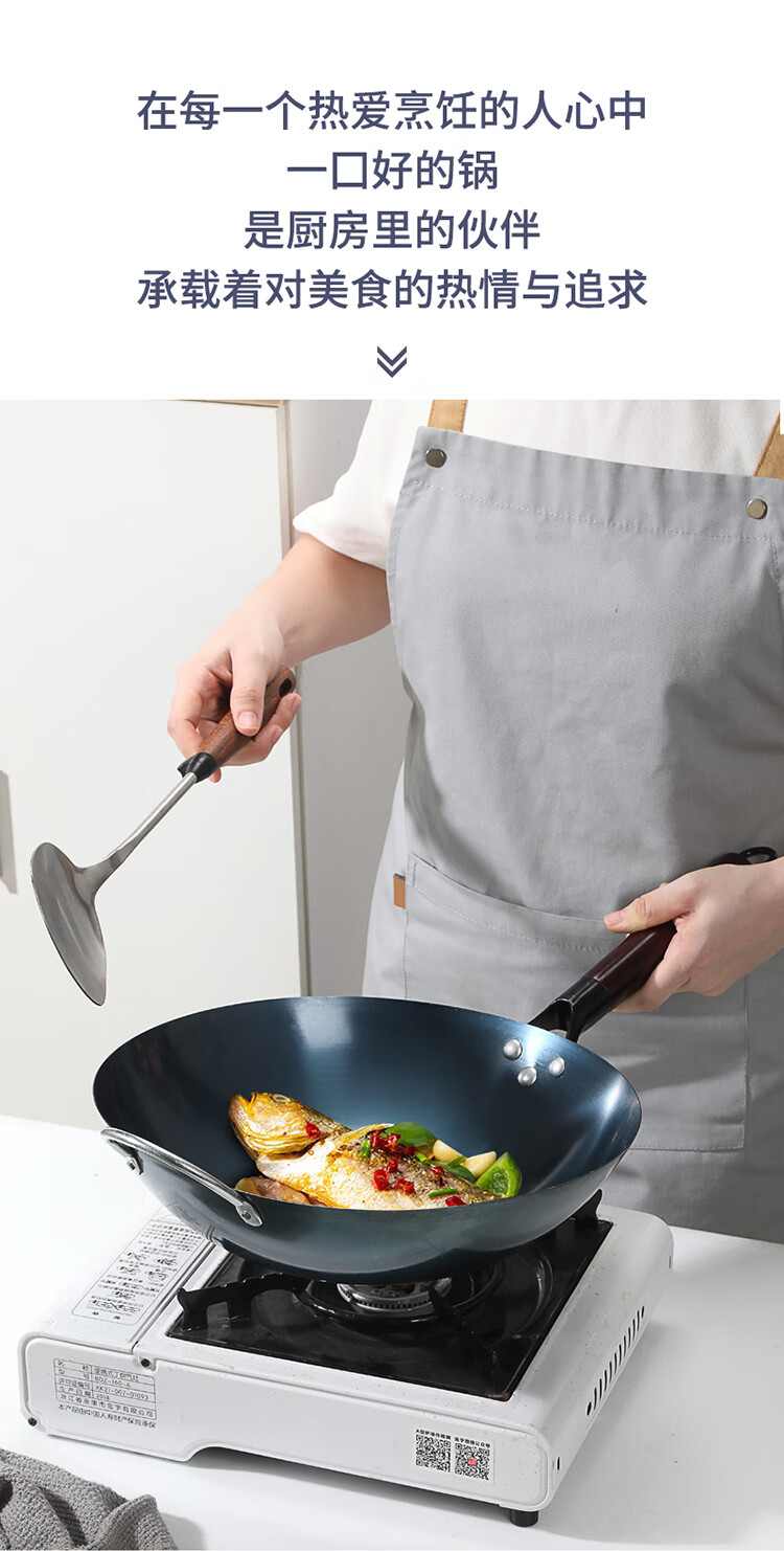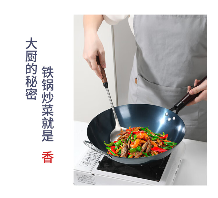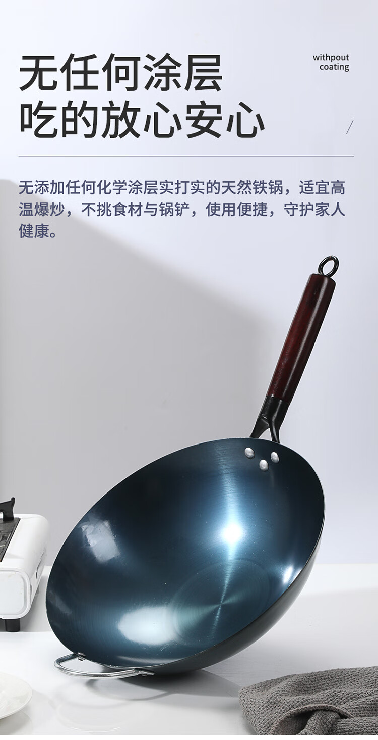精铁匠心打造,健康无涂层,受热均匀;富铁离子,加厚锅体,带耳,已开锅;炒,煮,蒸,烹饪一锅搞定