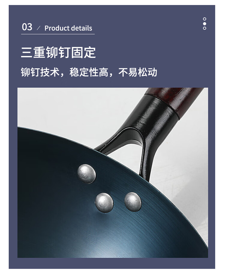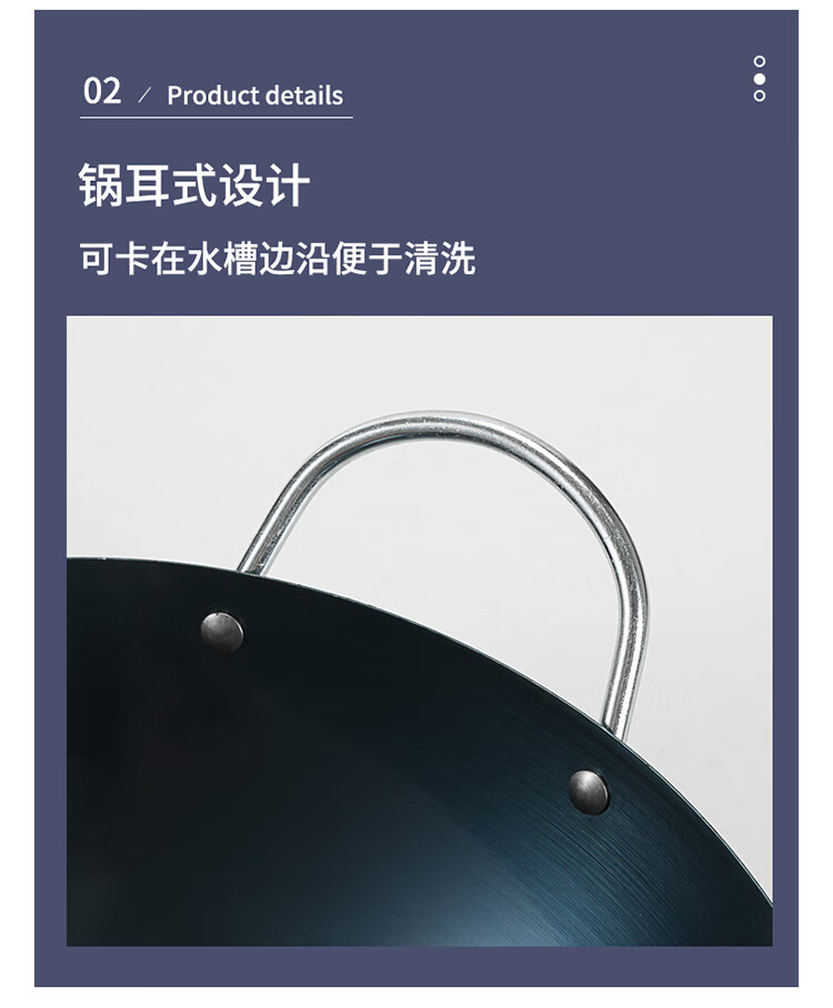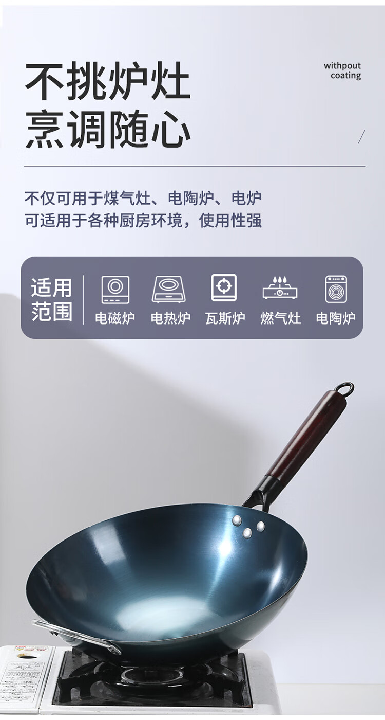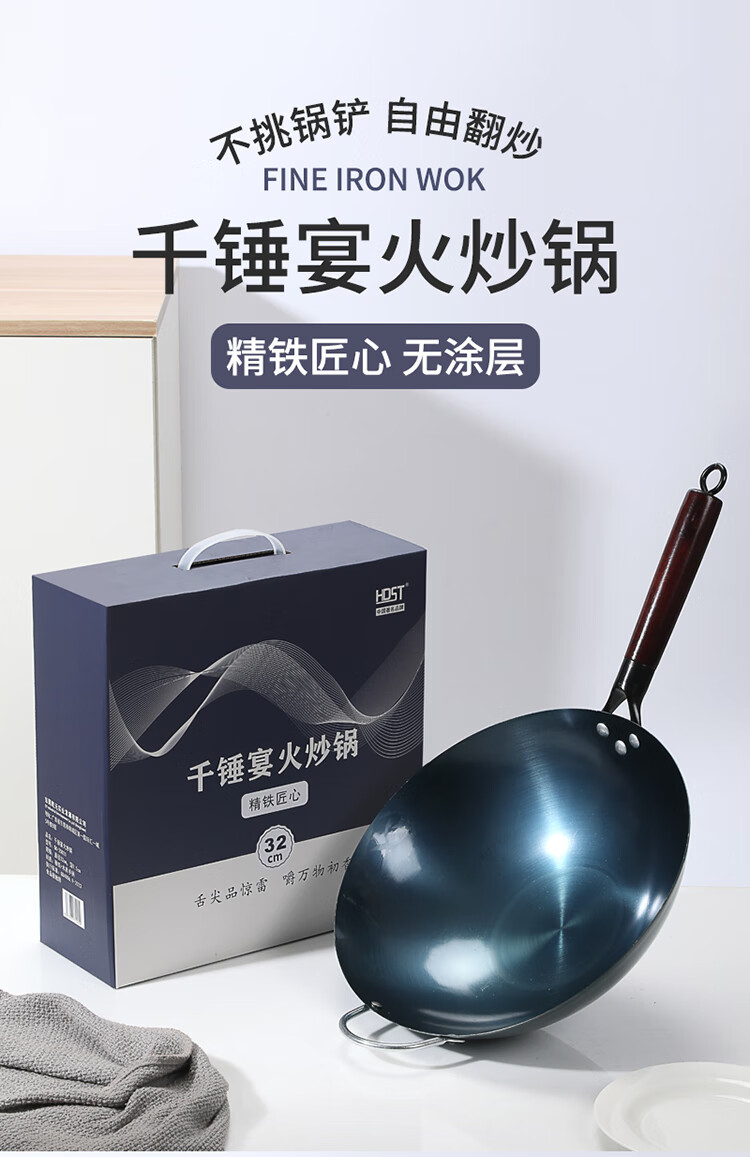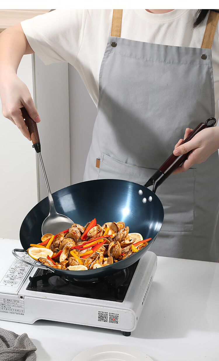 精铁匠心打造,健康无涂层,受热均匀;富铁离子,加厚锅体,带耳,已开锅;炒,煮,蒸,烹饪一锅搞定