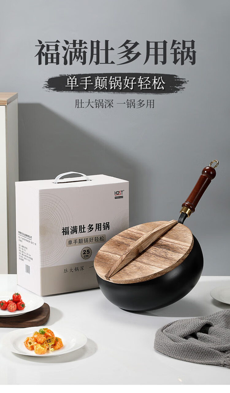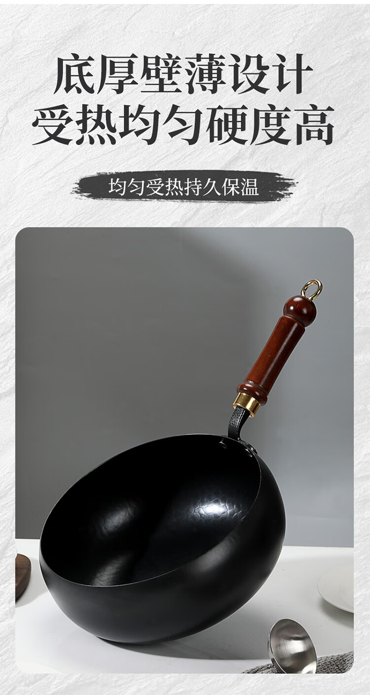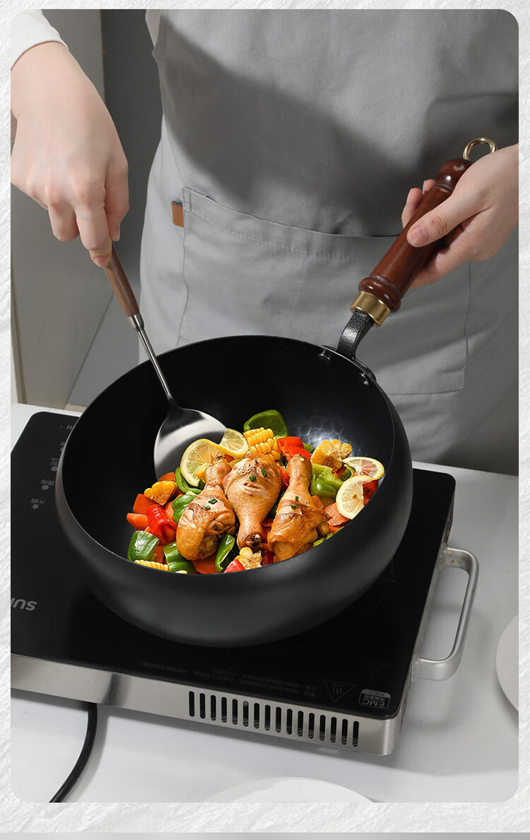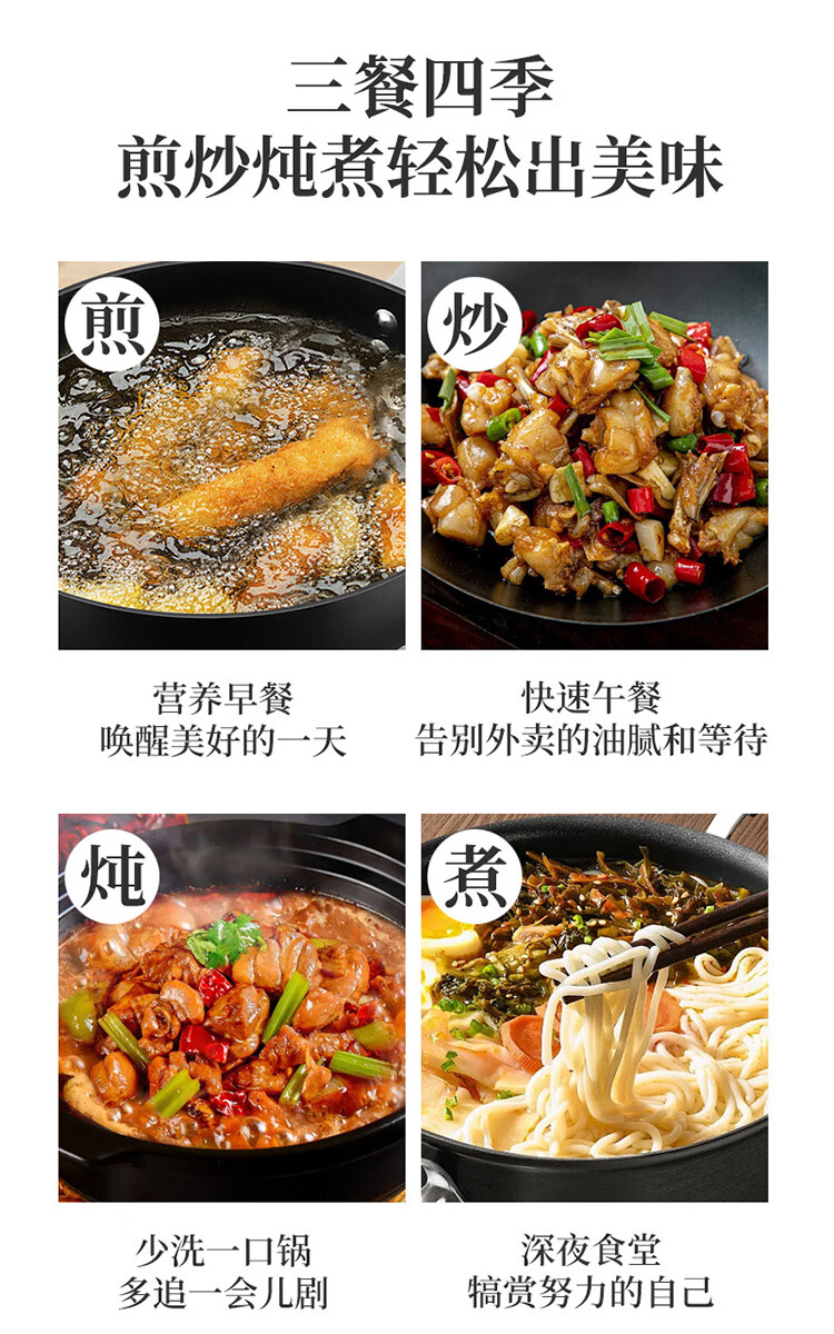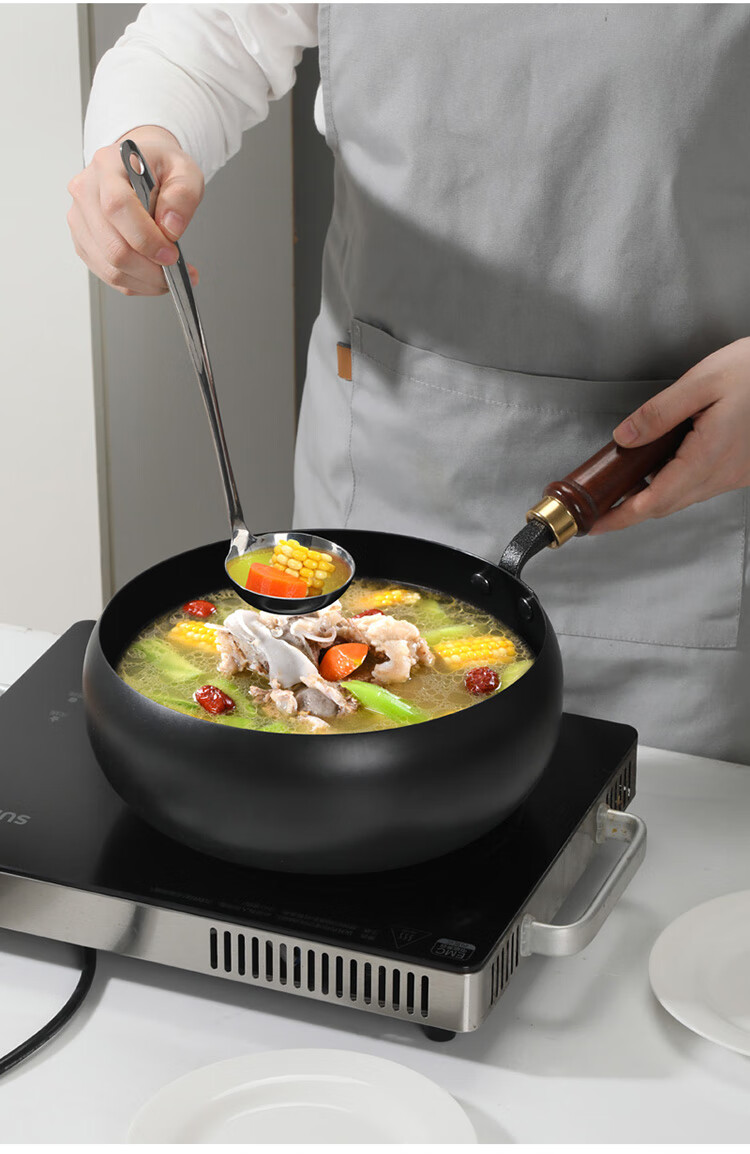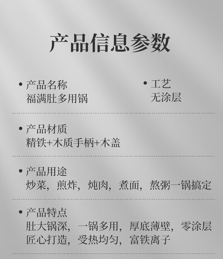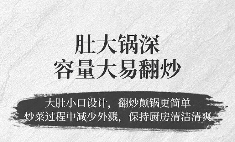 炒菜,煎炸,炖肉,煮面,熬粥一锅搞定;肚大锅深,一锅多用,厚底薄壁,零涂层;匠心打造,受热均匀,富铁离子。