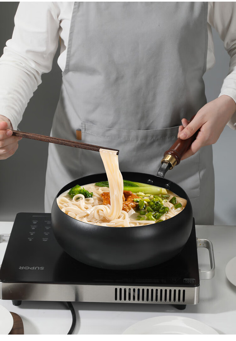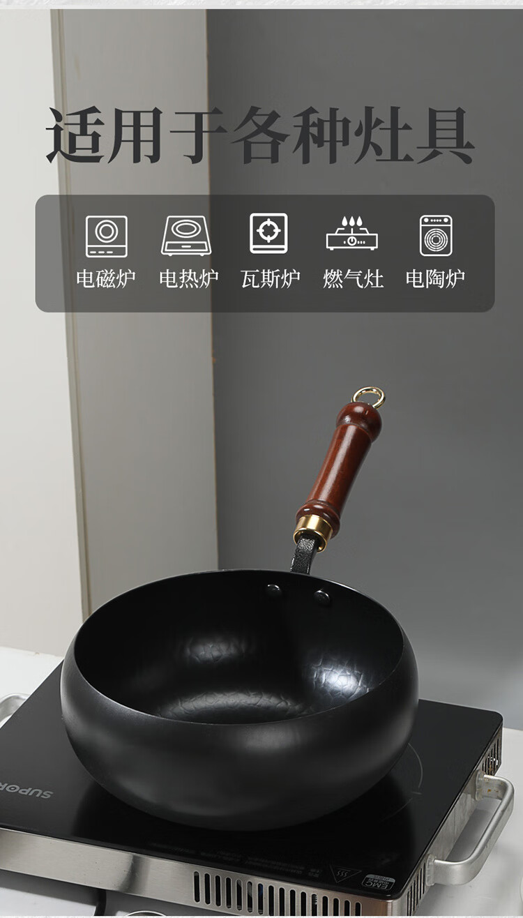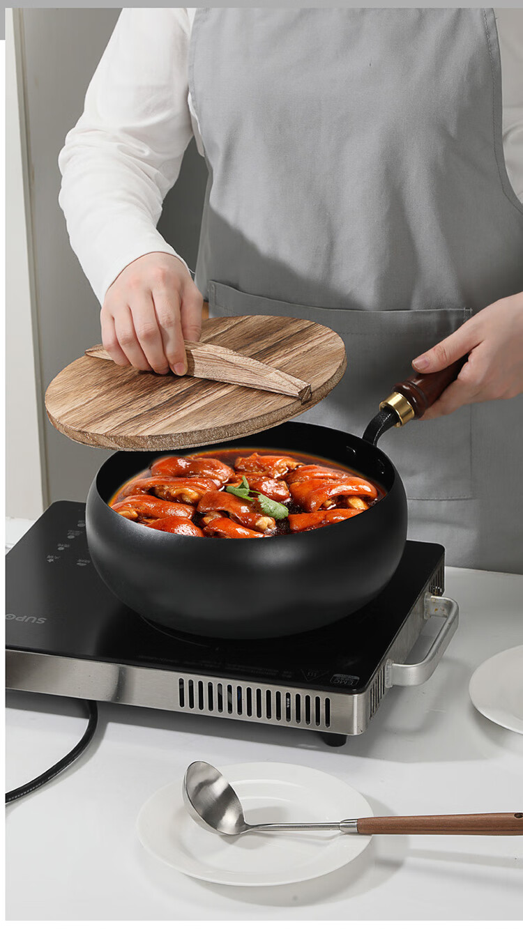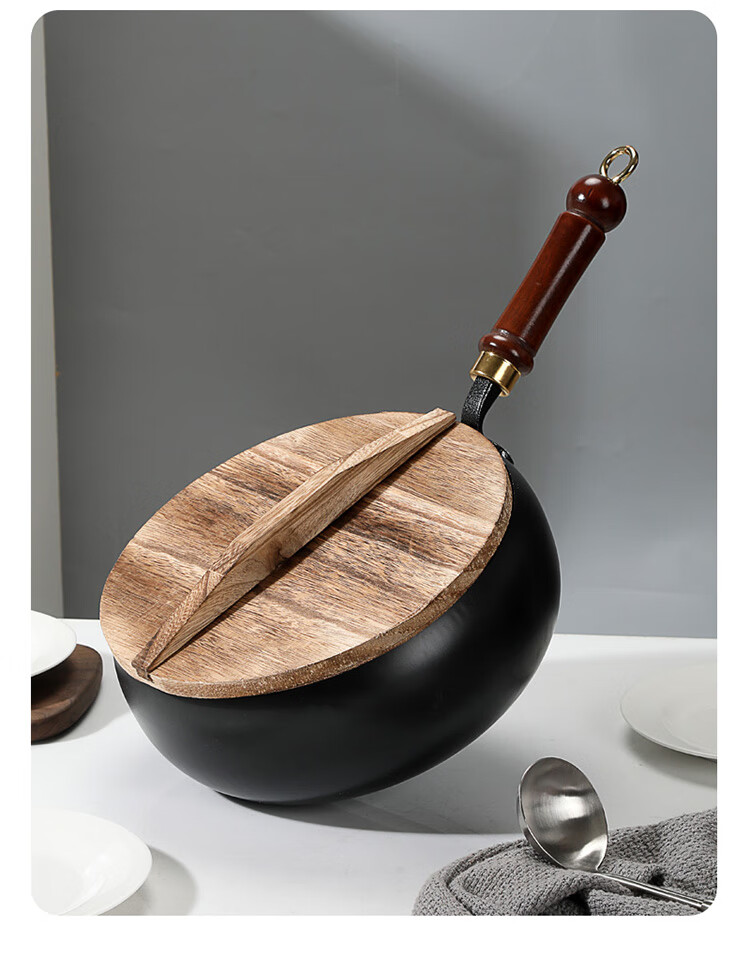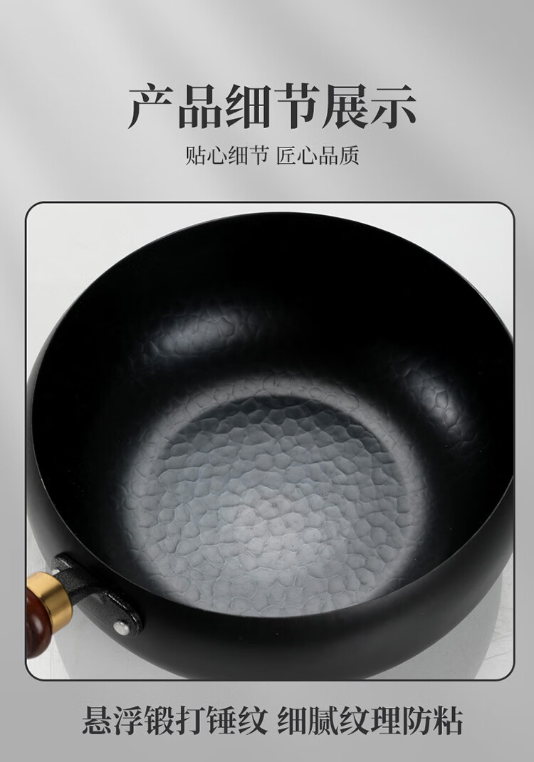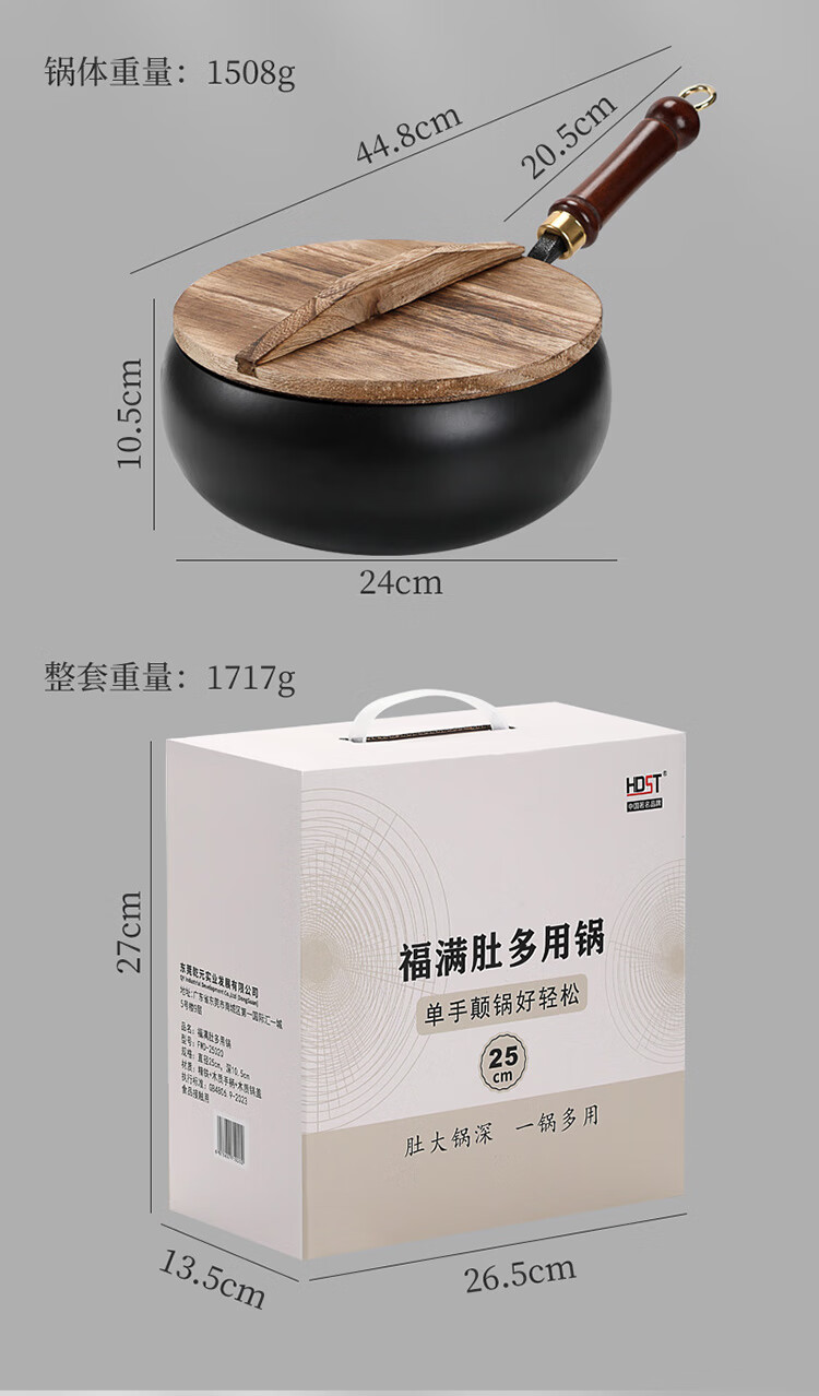 炒菜,煎炸,炖肉,煮面,熬粥一锅搞定;肚大锅深,一锅多用,厚底薄壁,零涂层;匠心打造,受热均匀,富铁离子。
