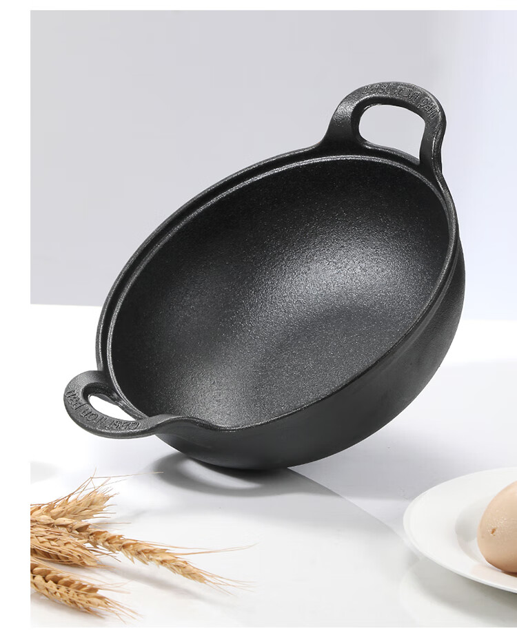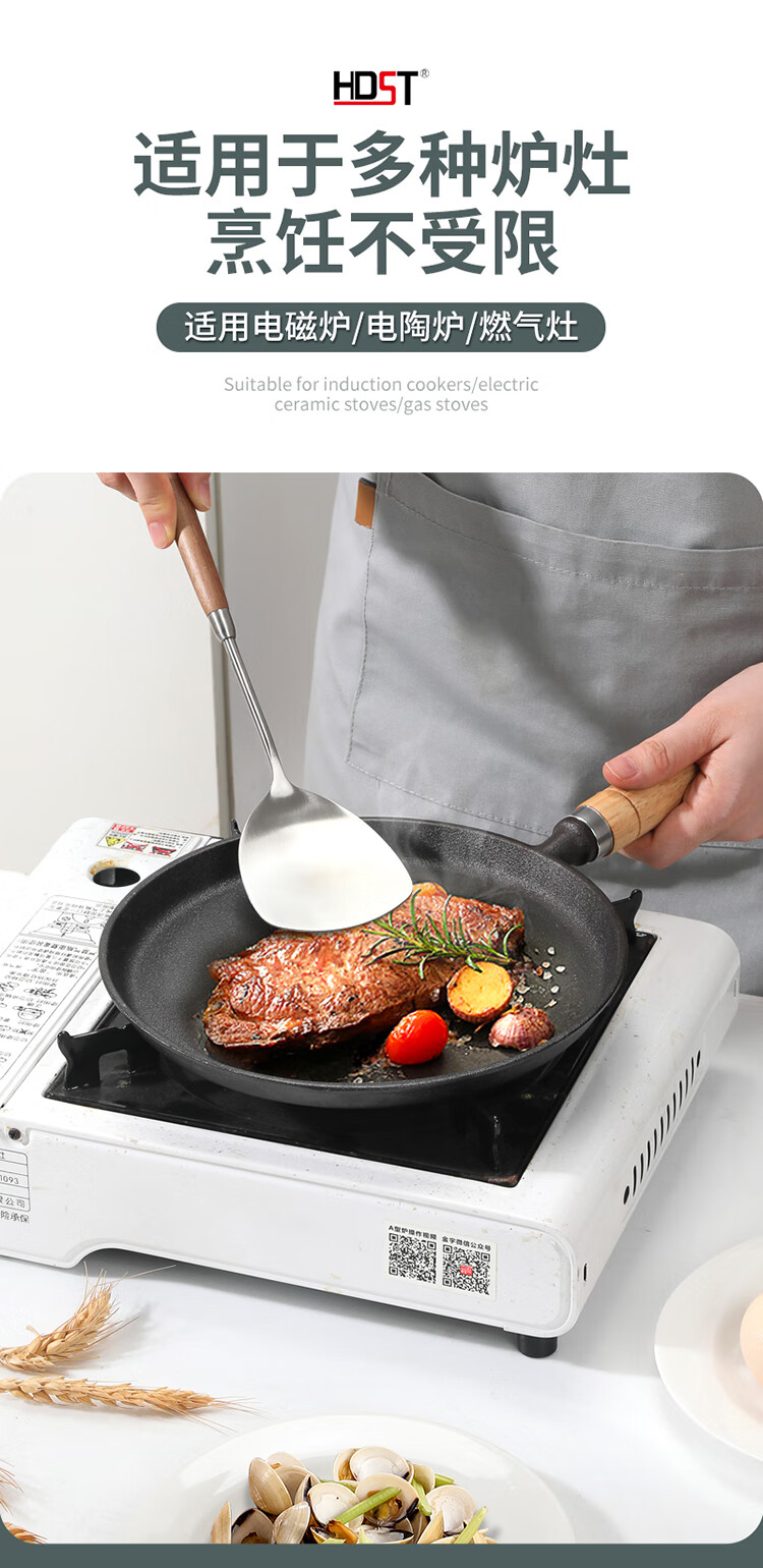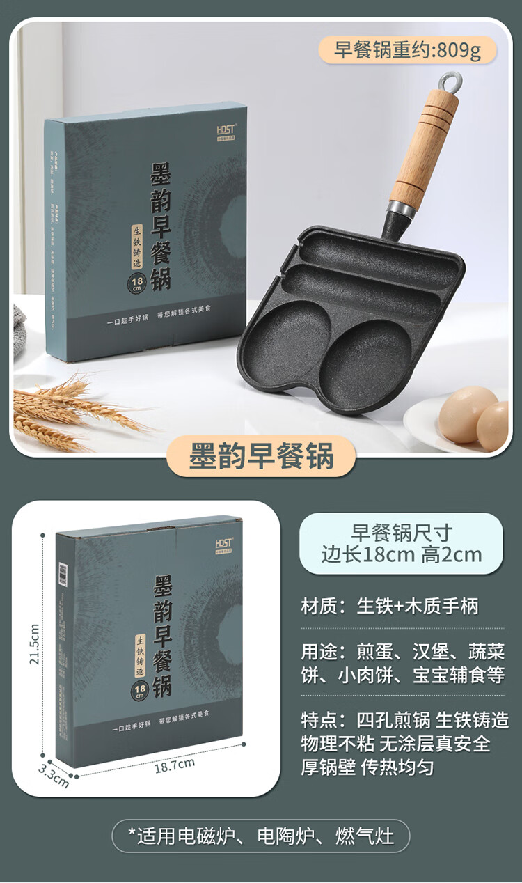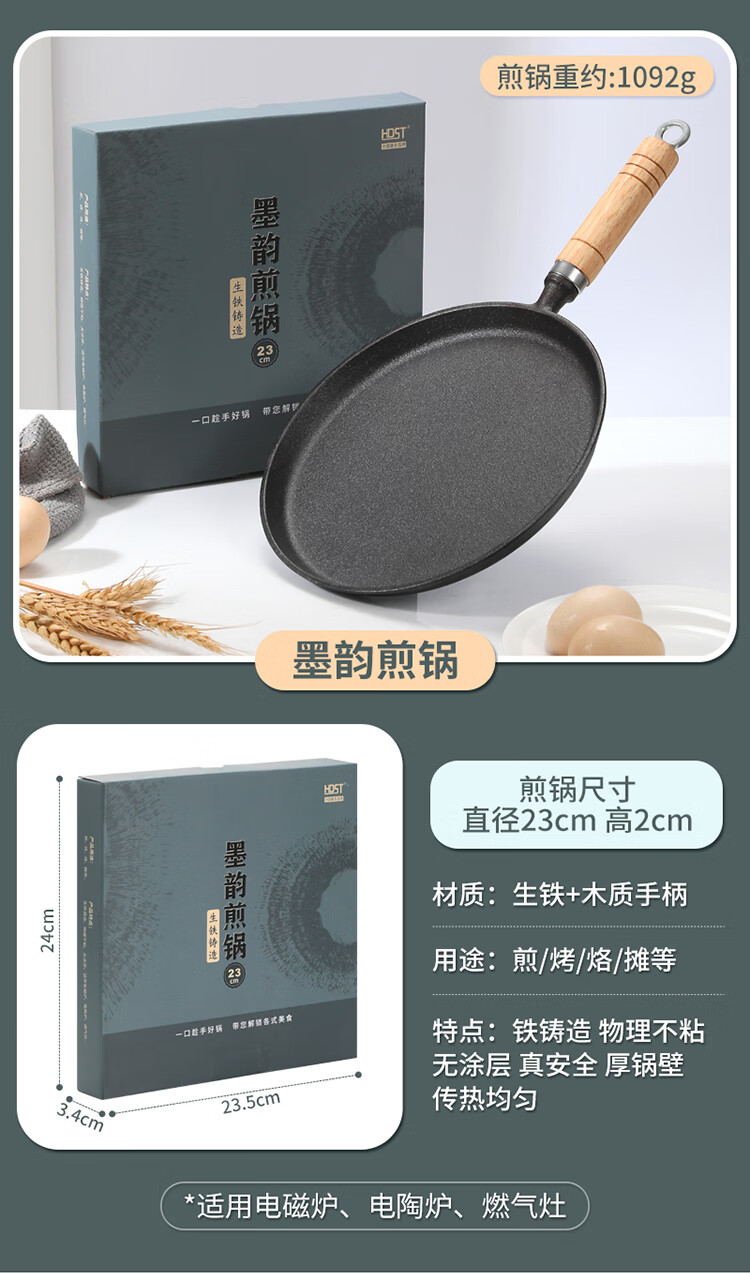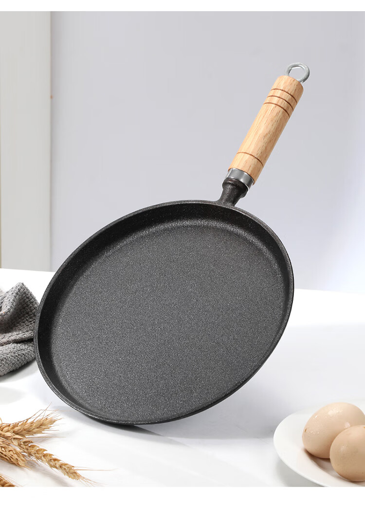 煎蛋,汉堡,蔬菜饼,肉肠。;生铁铸造,物理不粘,无涂层,真安全;厚锅壁,传热均匀,适用电磁炉,电陶炉,燃气灶。