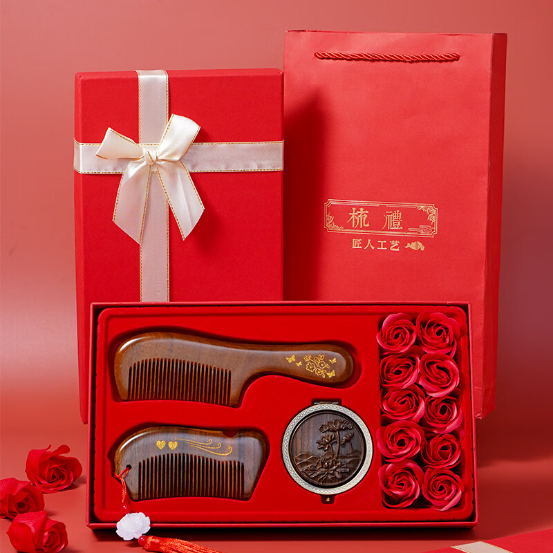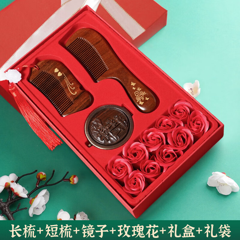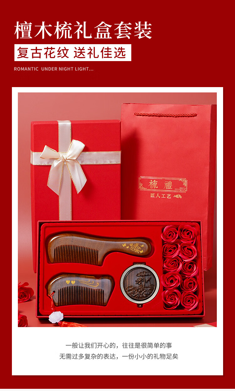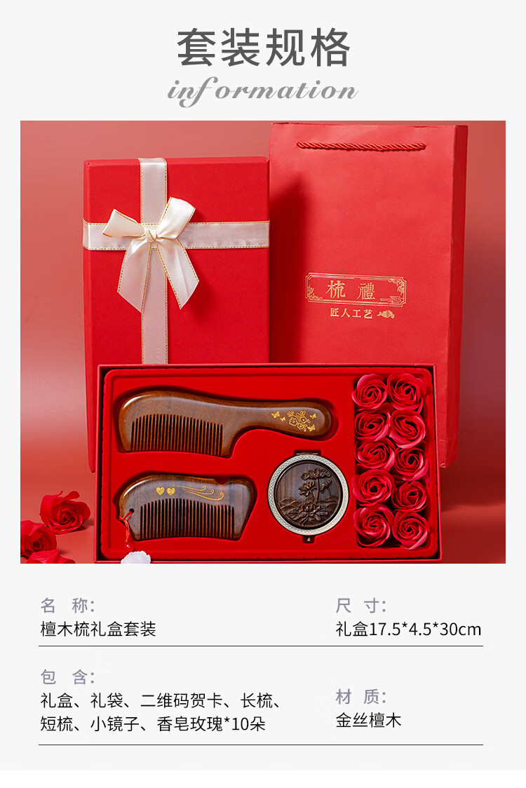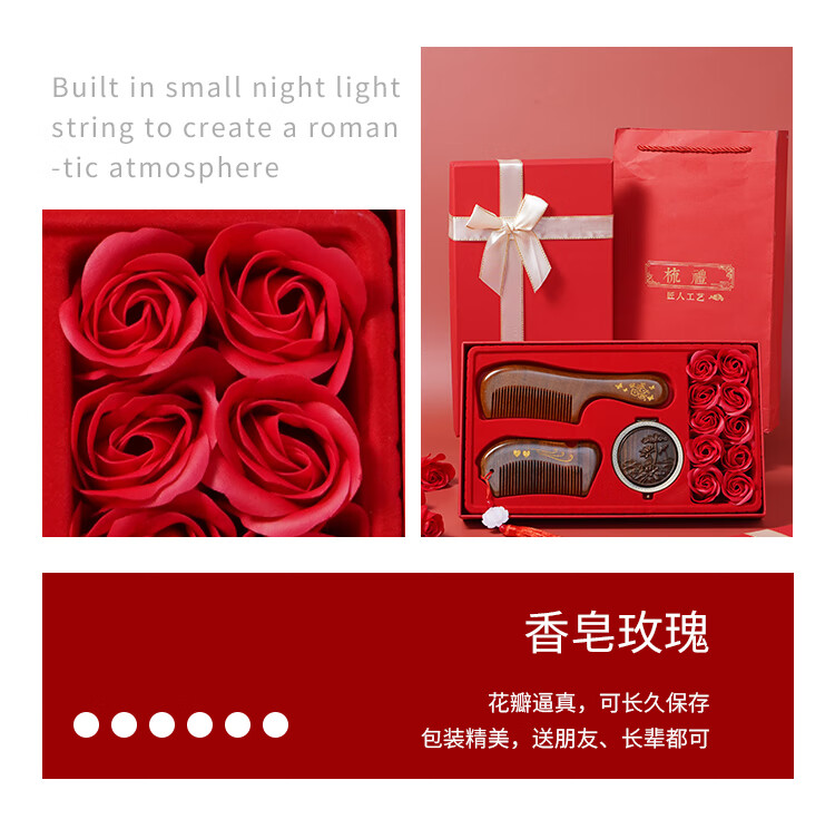 套装内容:雕花短梳、雕花长梳、雕花小镜子、香皂玫瑰*10朵