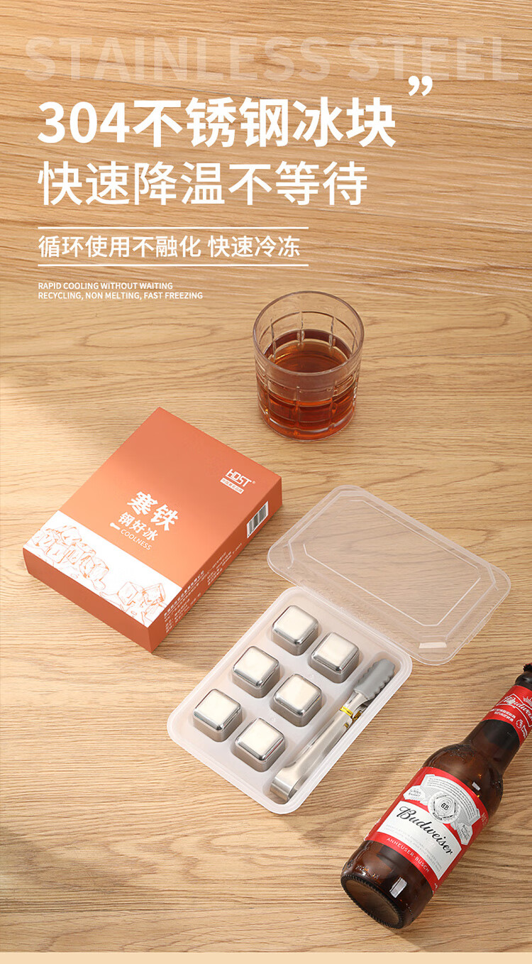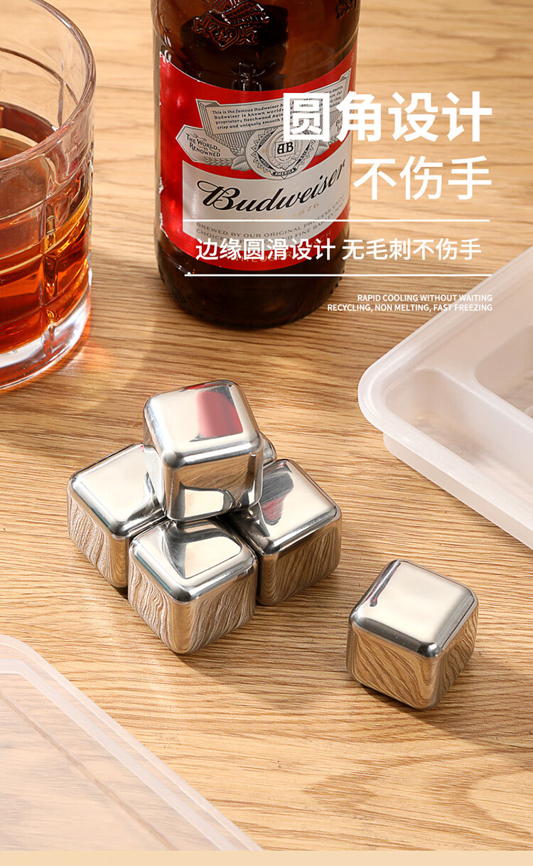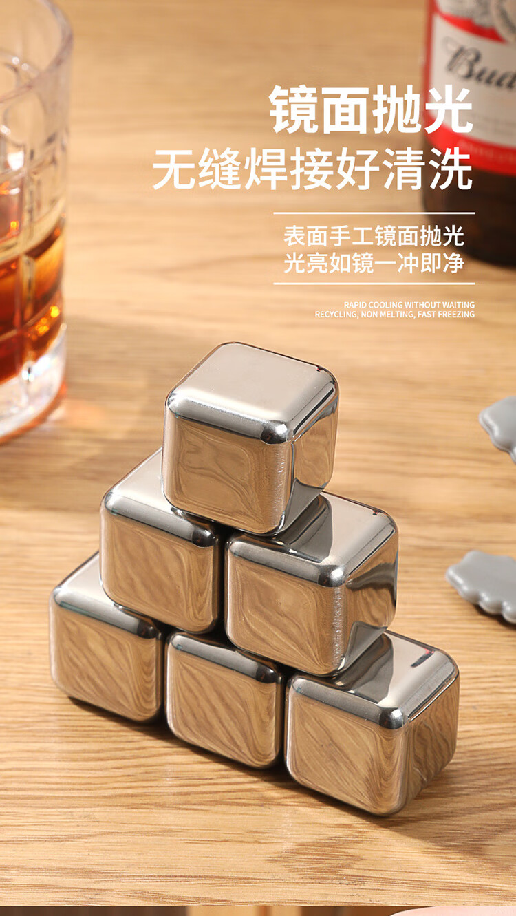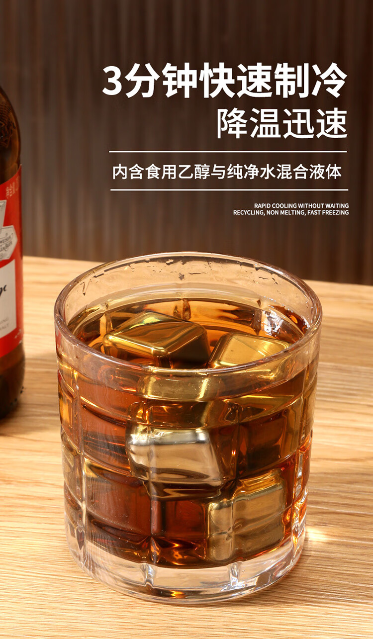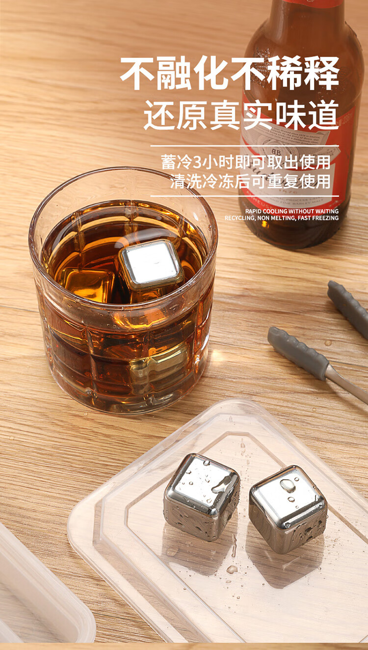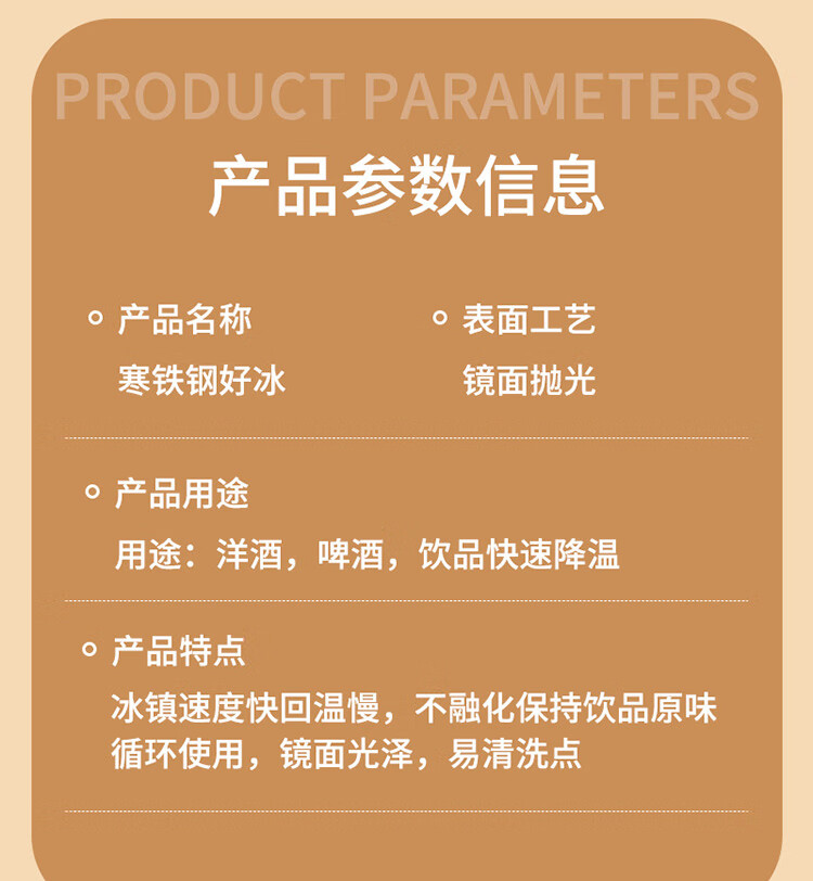 适用于洋酒,啤酒,饮品快速降温;冰镇速度快回温慢,不融化保持饮品原味;循环使用,镜面光泽,易清洗。