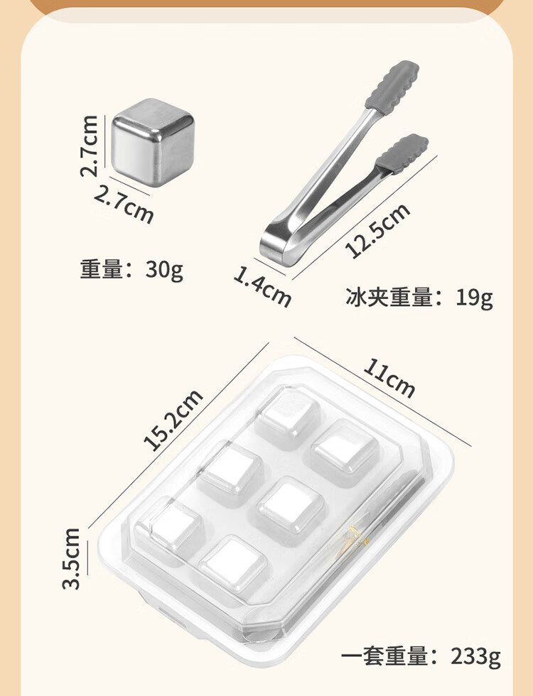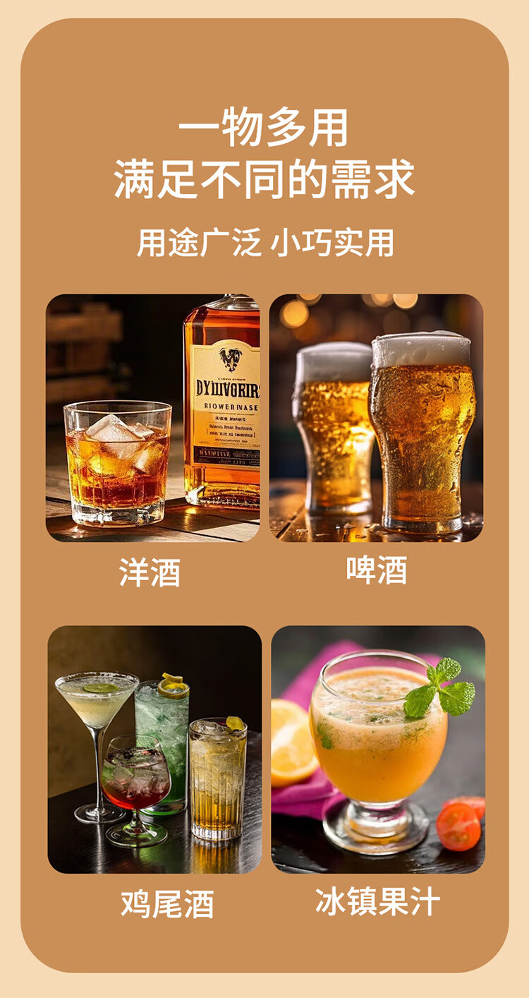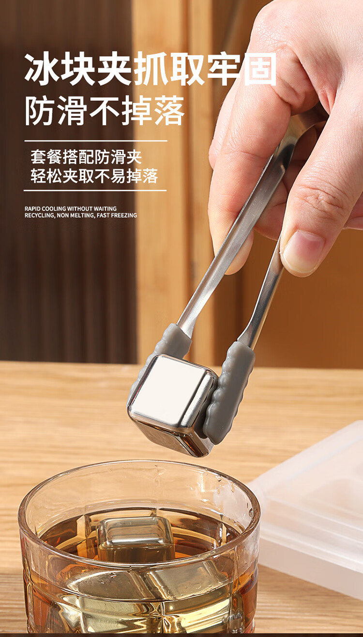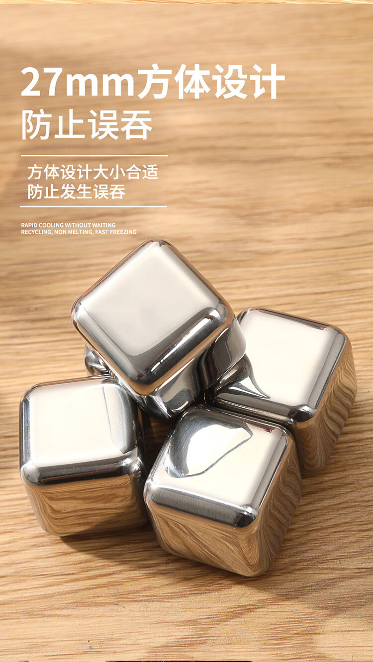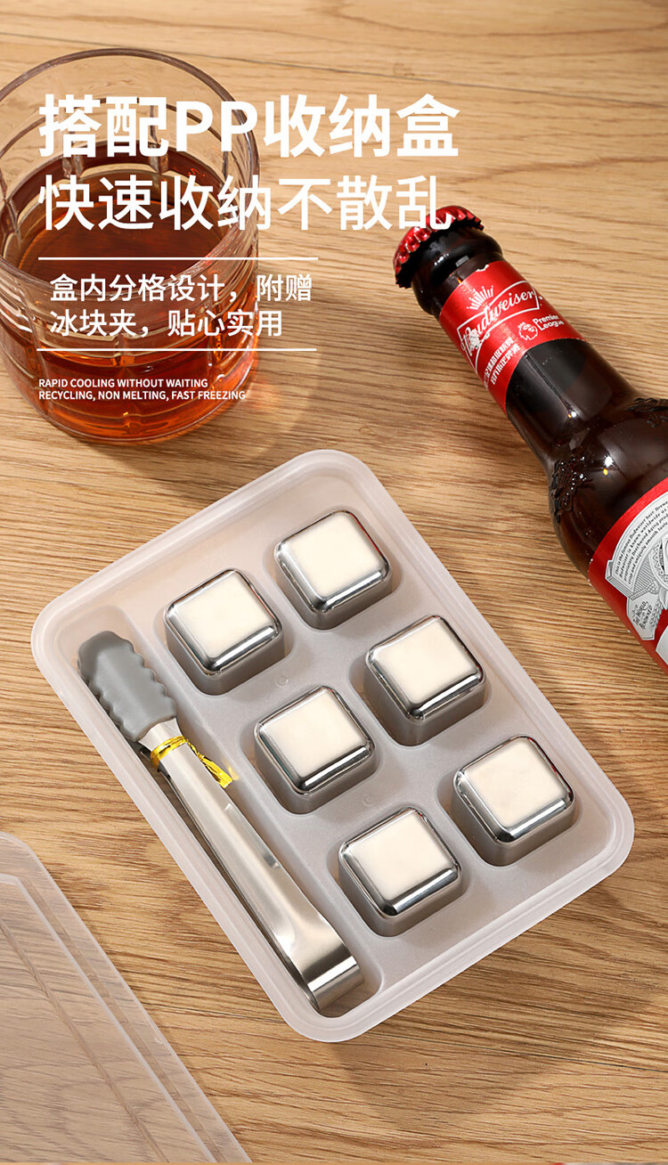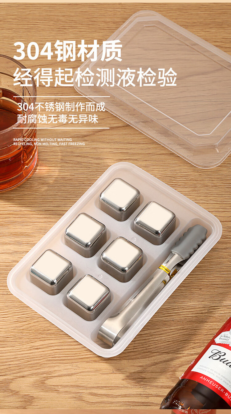 适用于洋酒,啤酒,饮品快速降温;冰镇速度快回温慢,不融化保持饮品原味;循环使用,镜面光泽,易清洗。
