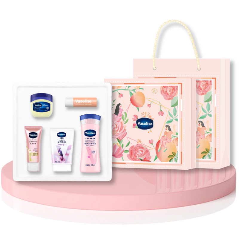 配置清单:凡士林滋润柔嫩手甲精华霜葡醉清香 40ml 凡士林经典修护弹润润唇膏清甜白桃味 3.5g 凡士林维他亮肤烟酰胺焕亮修护身体乳 100ml 凡士林经典修护晶冻原味 50g 凡士林水润焕亮精华露 30ml
