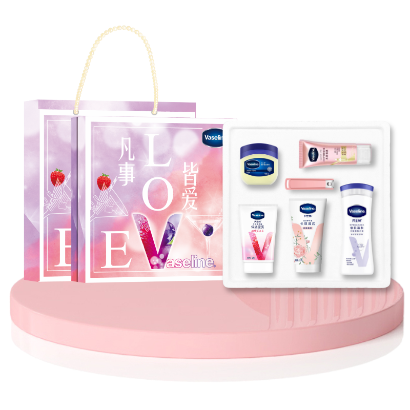 配置清单:凡士林保湿莹亮手甲精华霜莓语果香 40ml 凡士林滋润护手霜玫瑰香型 50ml 凡士林经典修护晶冻原味 50g 凡士林倍护特润修护身体乳清香型 100ml 凡士林水润焕亮精华露 30ml 凡士林防飞溅指甲刀