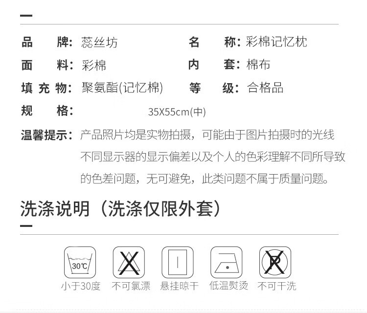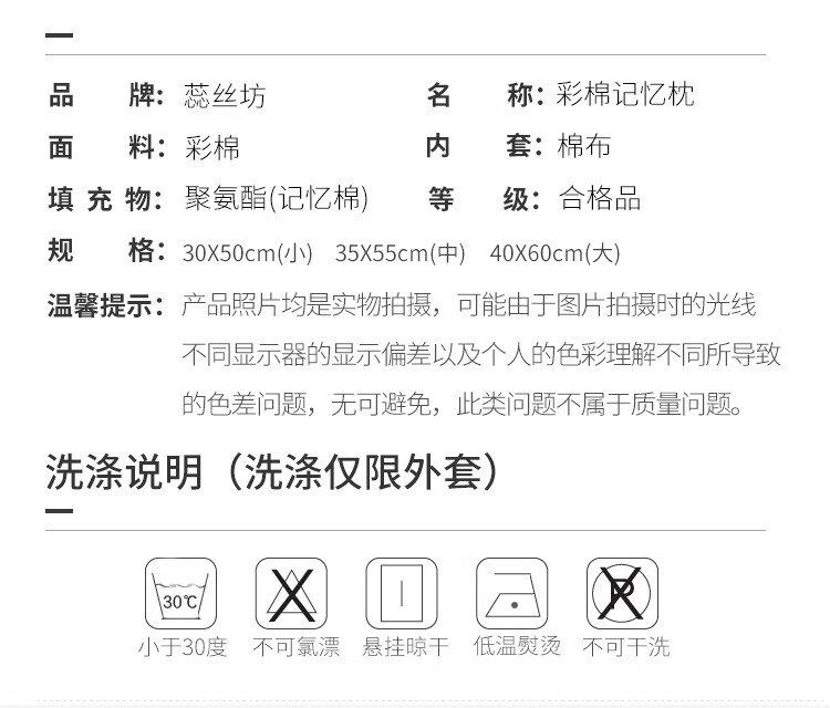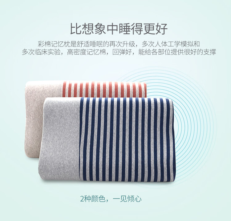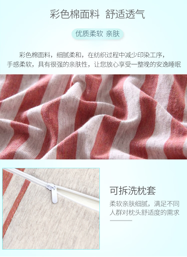 彩棉是具有天然色彩的新型纺织原料;彩棉不起静电,不起球,透气性非常好;枕芯零压力慢回弹,三个高度满足你不同需求,棉质枕套