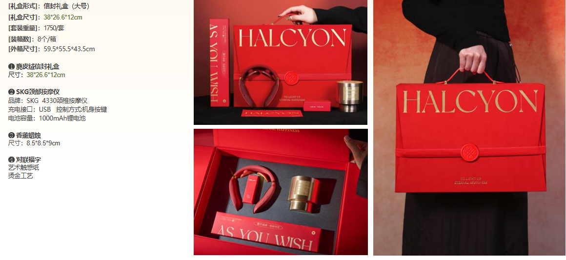 配置:❶ 麂皮绒信封礼盒 ❷ SKG颈部按摩仪 ❸ 香薰蜡烛 ❹ 对联福字