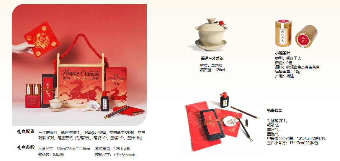 配置:三才盖碗*1、福运挂饰*1、小罐茶叶*2罐、空白福字*20张、空白对联10对、笔墨套装(毛笔2支、笔袋1个、墨蝶1个、墨汁1瓶)