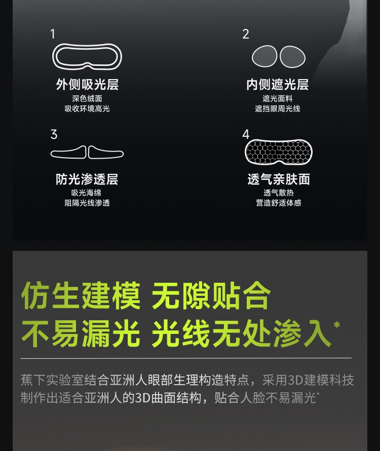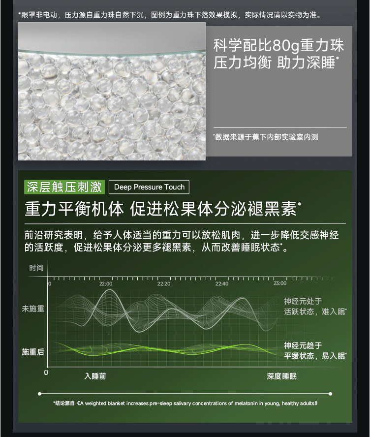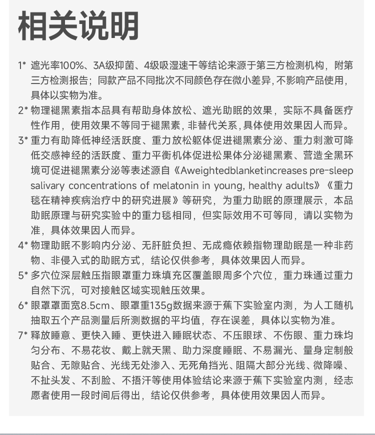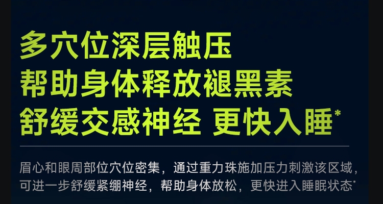 仿生建模 无隙贴合不易漏光 光线无处渗入;多穴位深层触压帮助身体释放褪黑素舒缓交感神经 更快;重力自助眠眼罩 舒缓压力 释放睡意