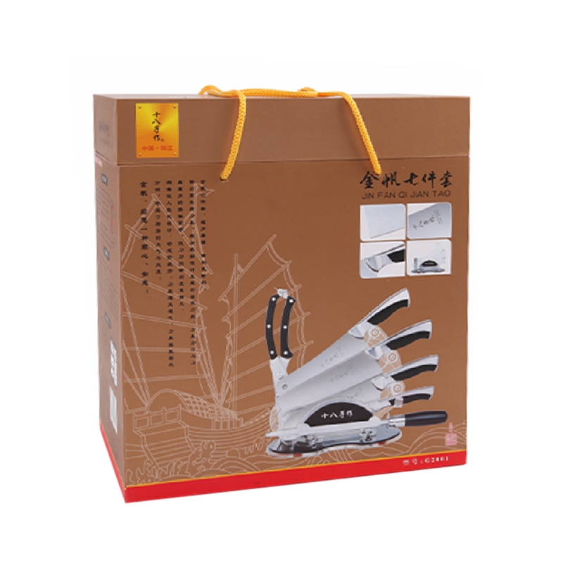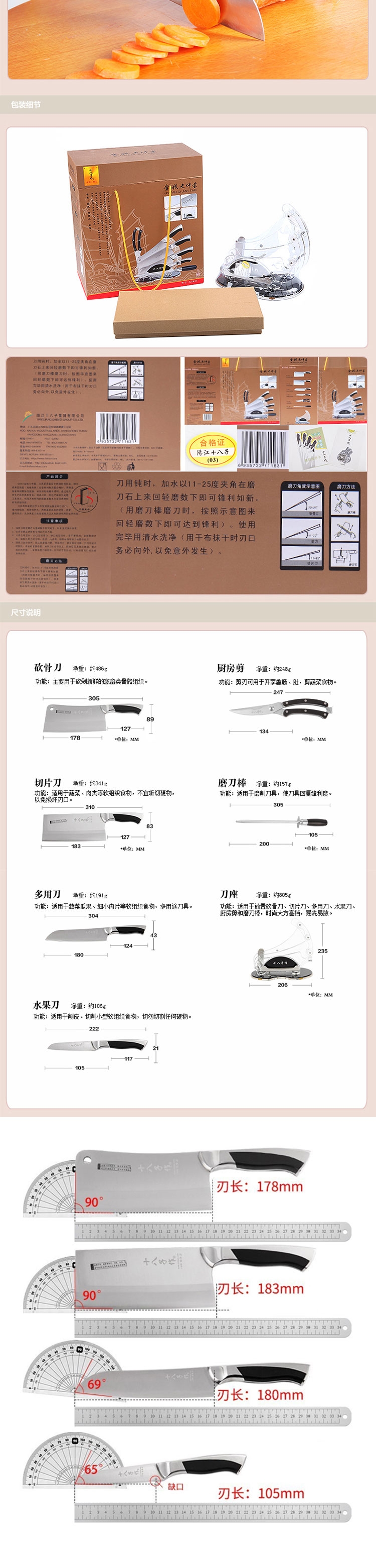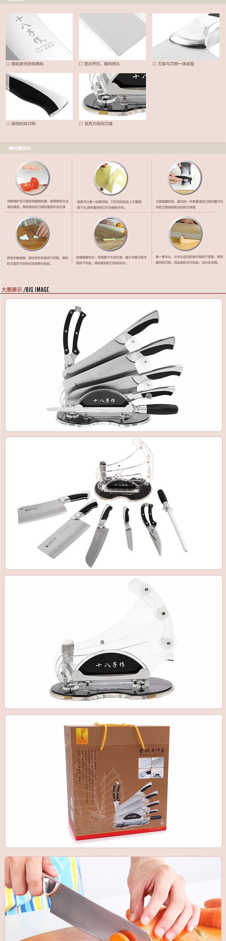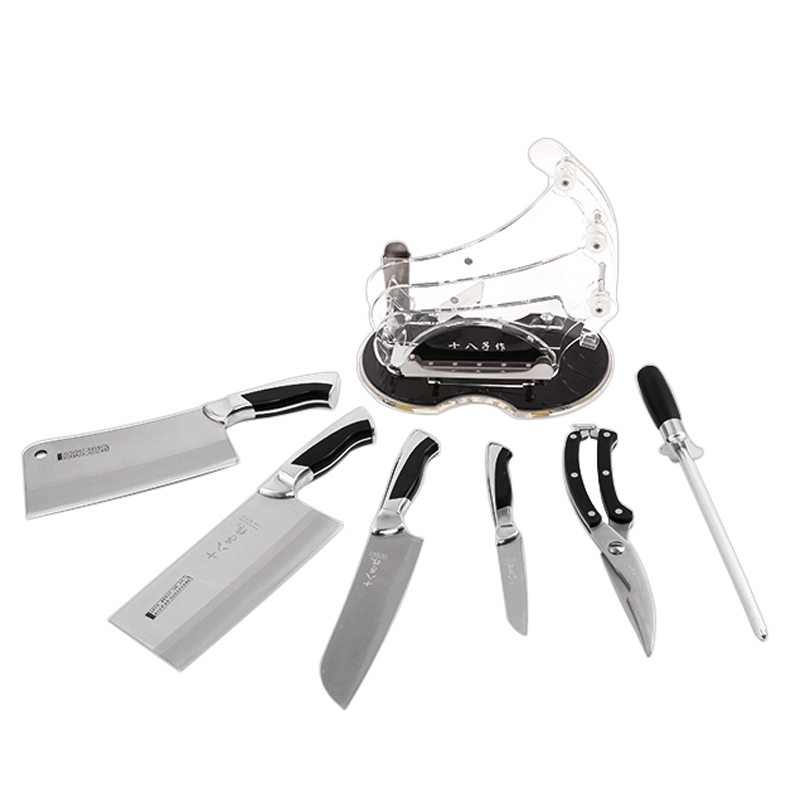 配置:砍骨刀、切片刀、多用刀、水果刀,剪刀、磨刀棒,亚克力刀座