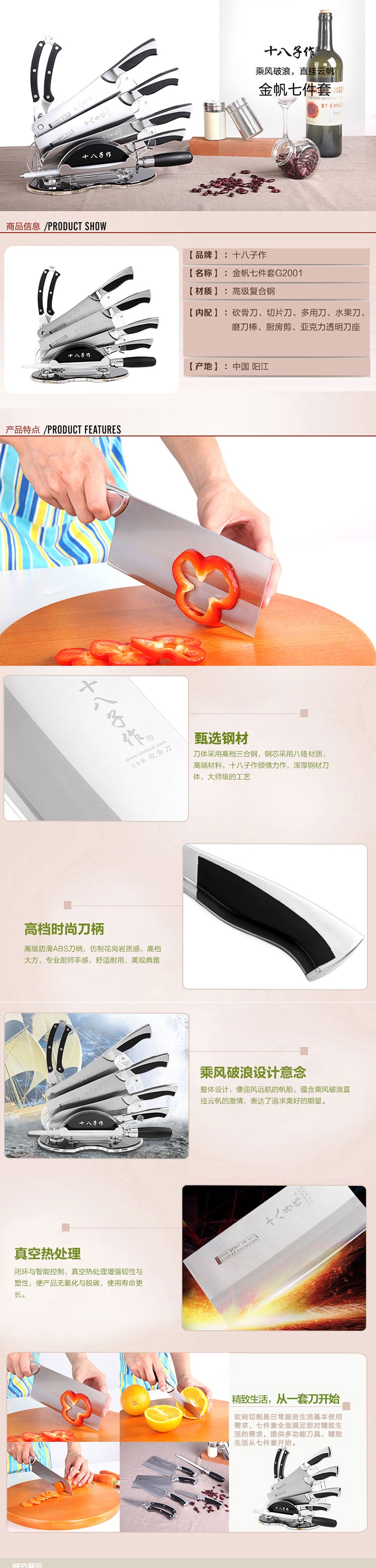 采用复合不锈钢,三层复合,加倍锋利,轻松耐用;刀面喷砂,创新防粘技术,让食物不粘刀面;手柄采用工程塑料与浇注的钢水形成的铸件结合后再打磨;亚克力材质,收集刀具摆放整齐,易洗易放