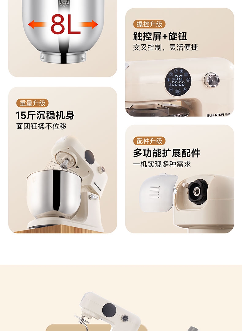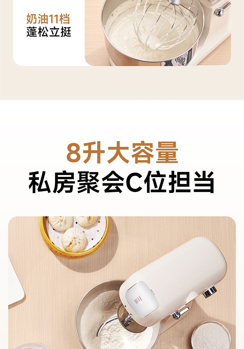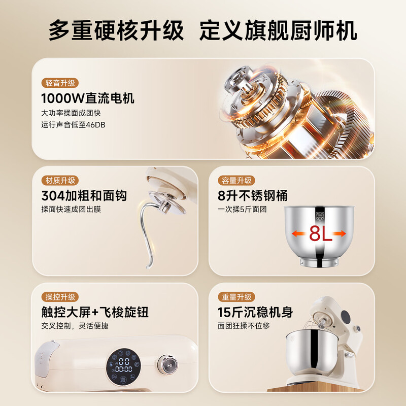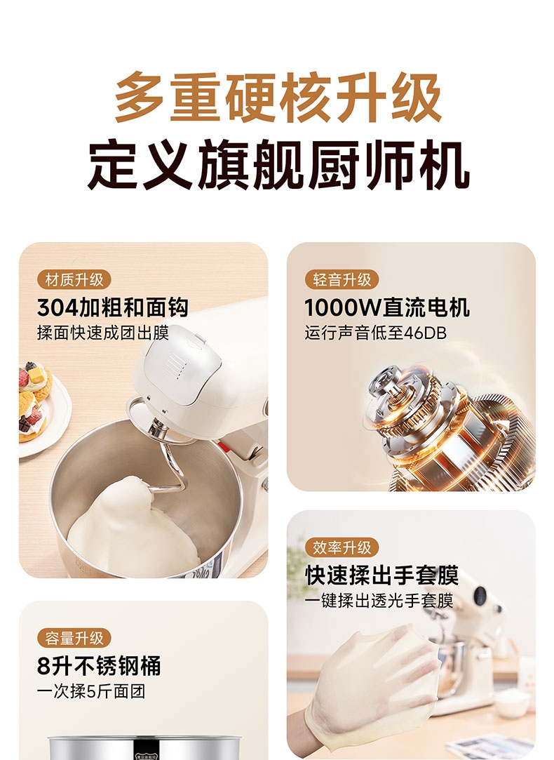 1000w直流电机高效轻音运行,成团快;8升家用大容量 11档精准调速 支持扩展配件需另购;30分钟定时免看管 3大预设功能