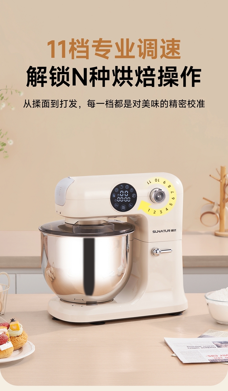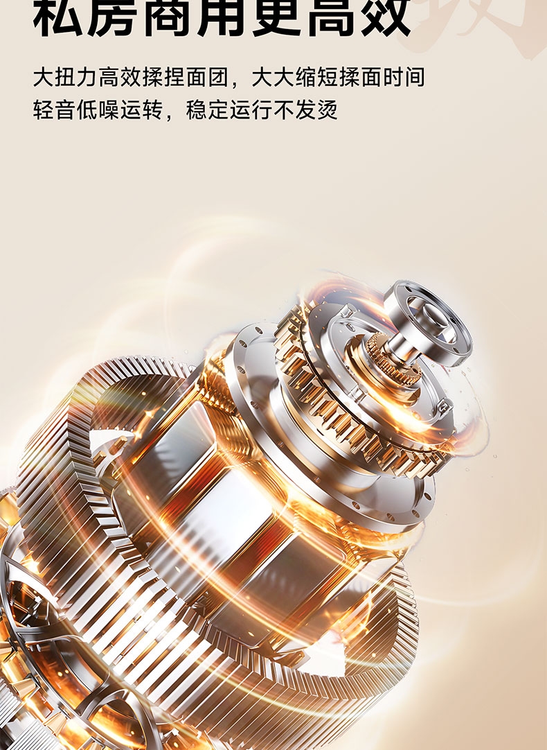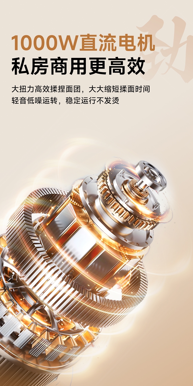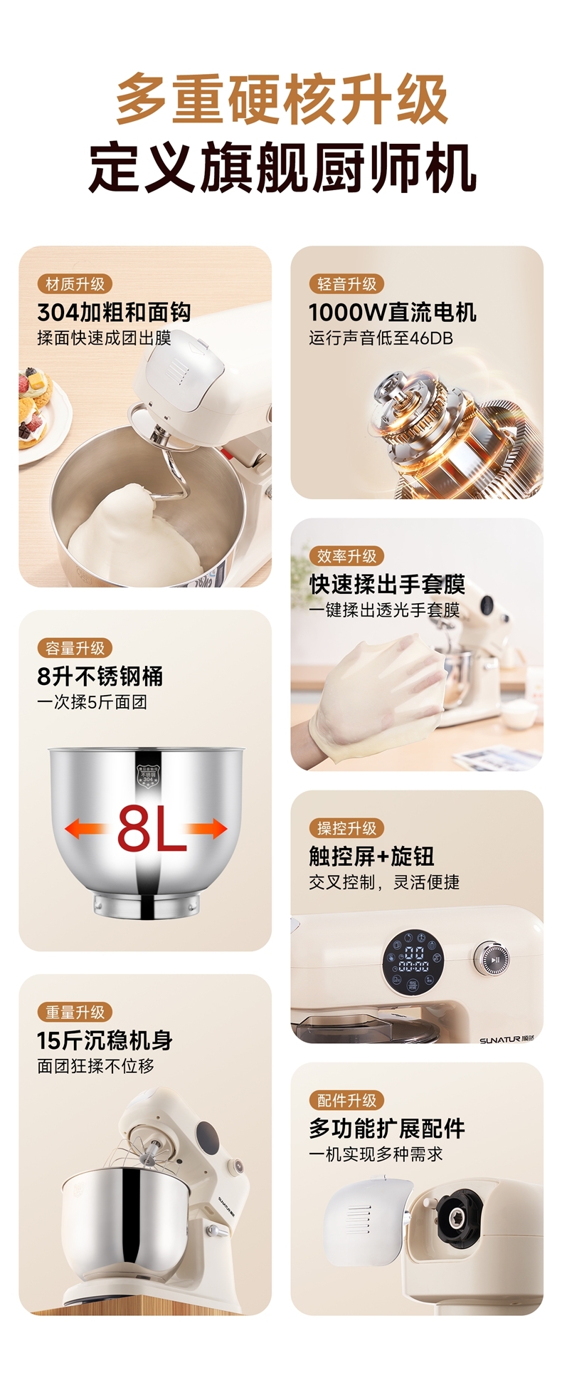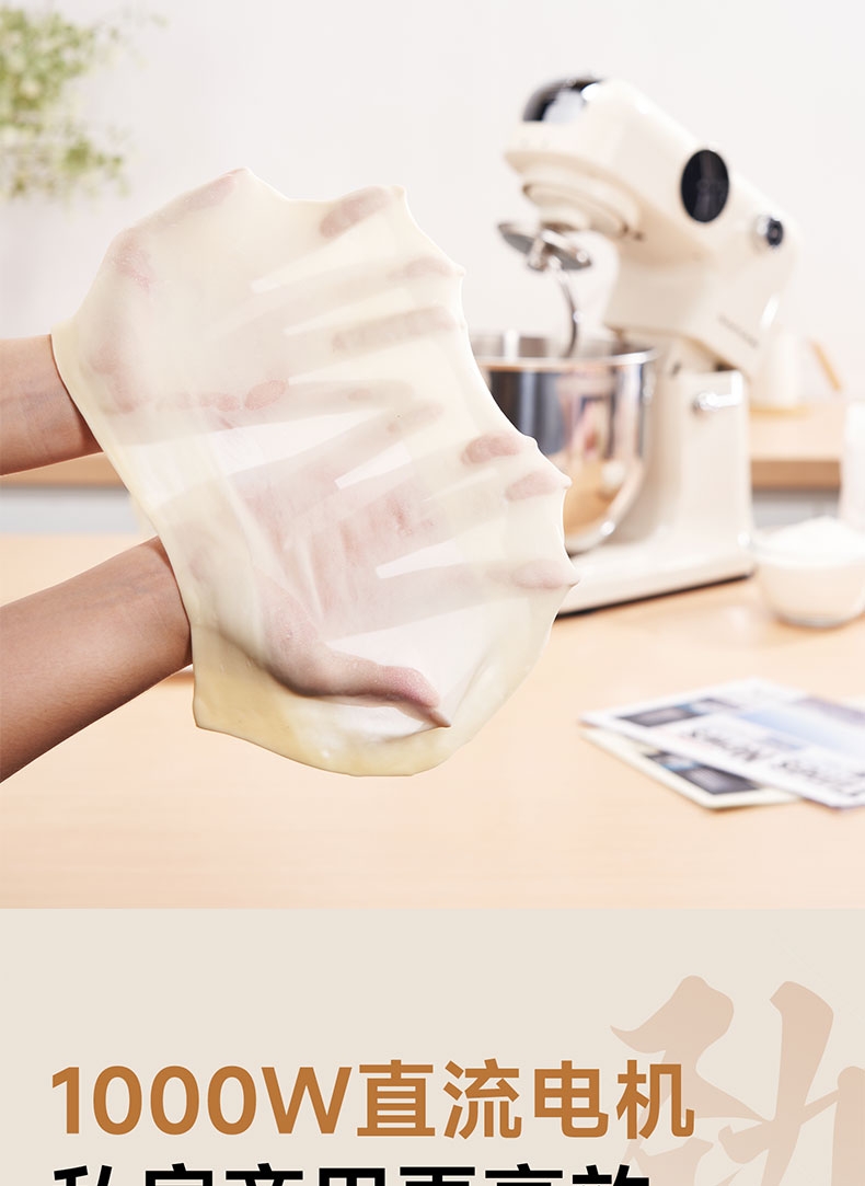 配置清单:1000w直流电机高效轻音运行,成团快,轻松出手套膜 8升家用大容量 11档精准调速,满足不同需求,30分钟定时免看管 3大预设功能,304和面钩,304打蛋笼,搅拌桨配件 金属传动齿轮,高强度高精度使用寿命长 触控屏+旋钮交叉控制 支持扩展配件,需另购;