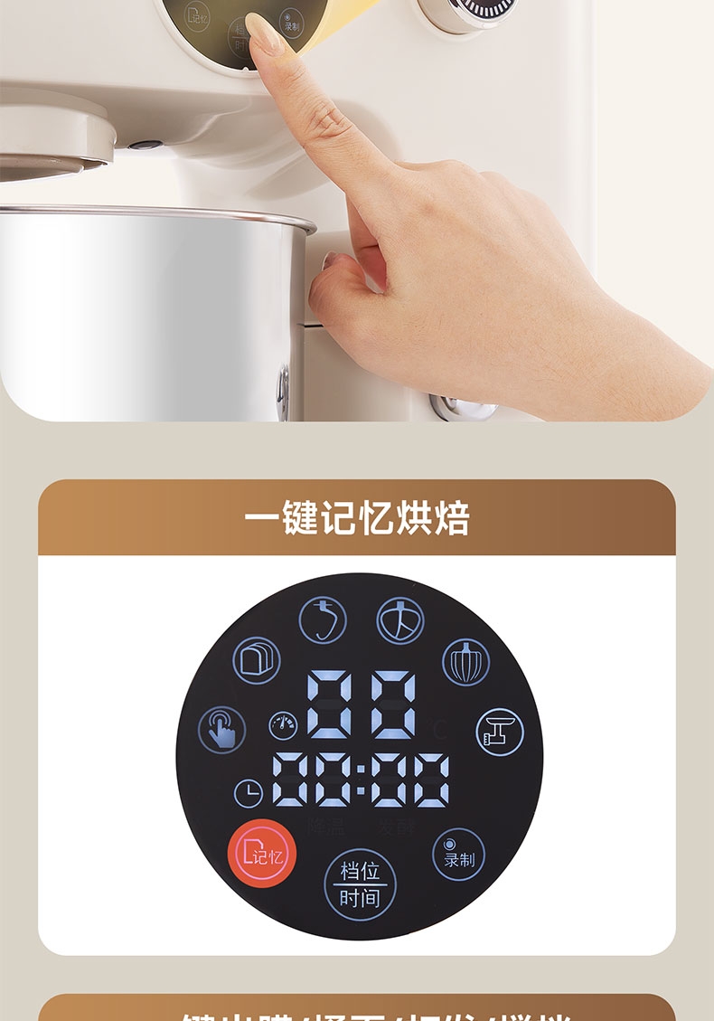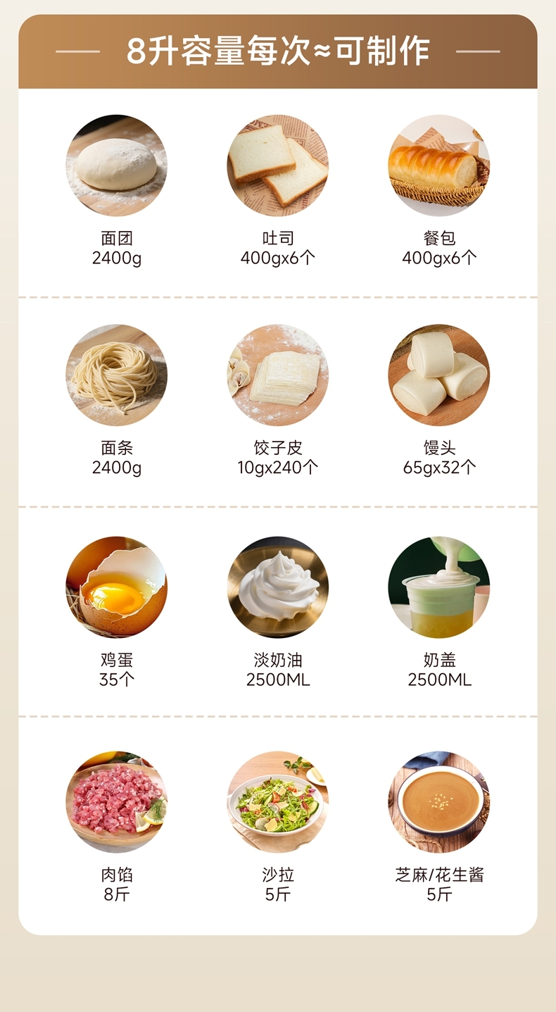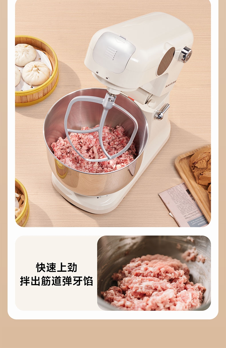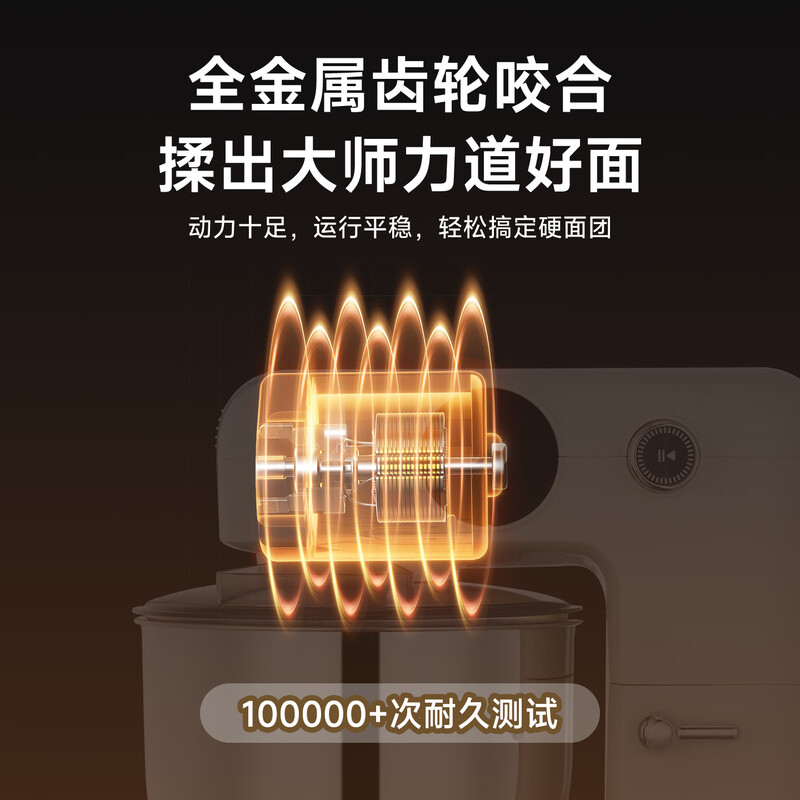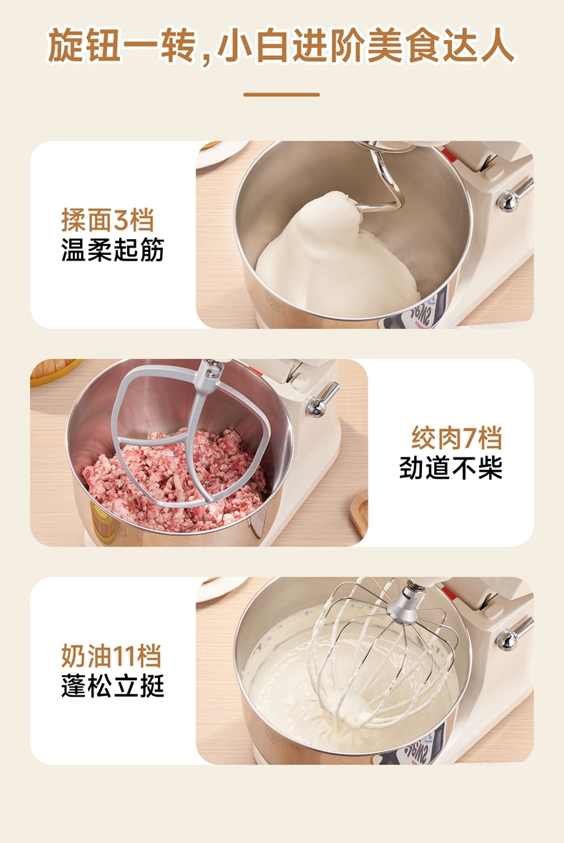 配置清单:1000w直流电机高效轻音运行,成团快,轻松出手套膜 8升家用大容量 11档精准调速,满足不同需求,30分钟定时免看管 3大预设功能,304和面钩,304打蛋笼,搅拌桨配件 金属传动齿轮,高强度高精度使用寿命长 触控屏+旋钮交叉控制 支持扩展配件,需另购;