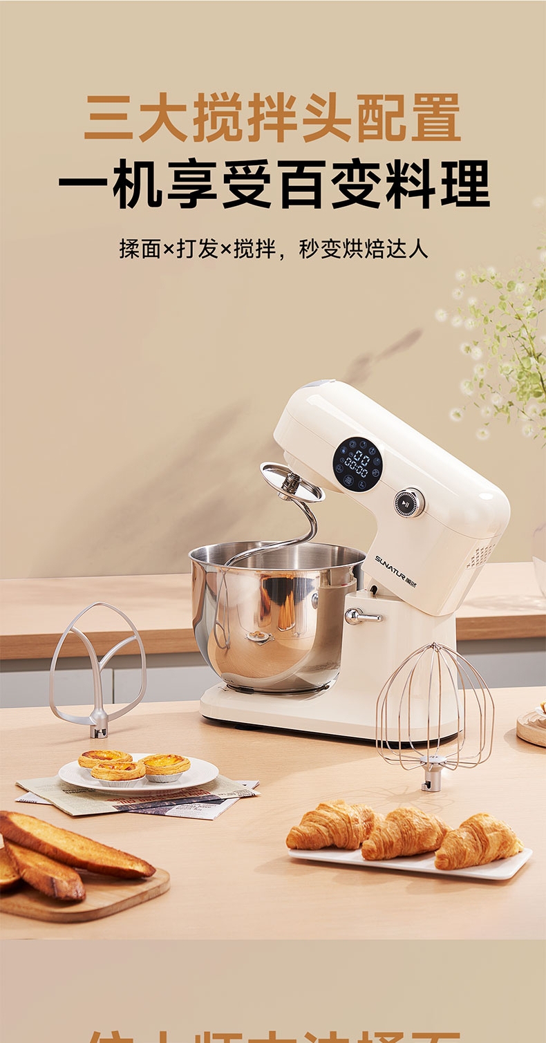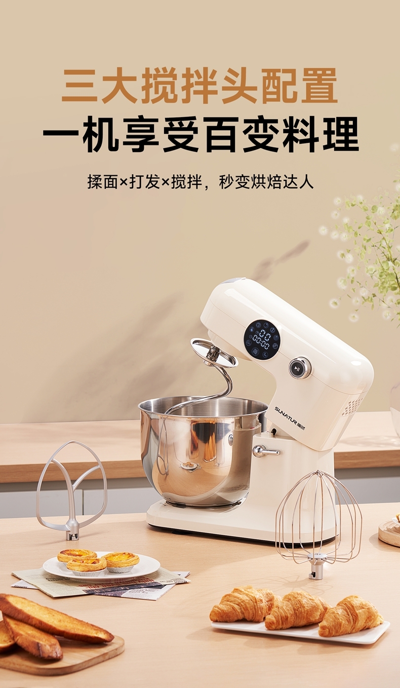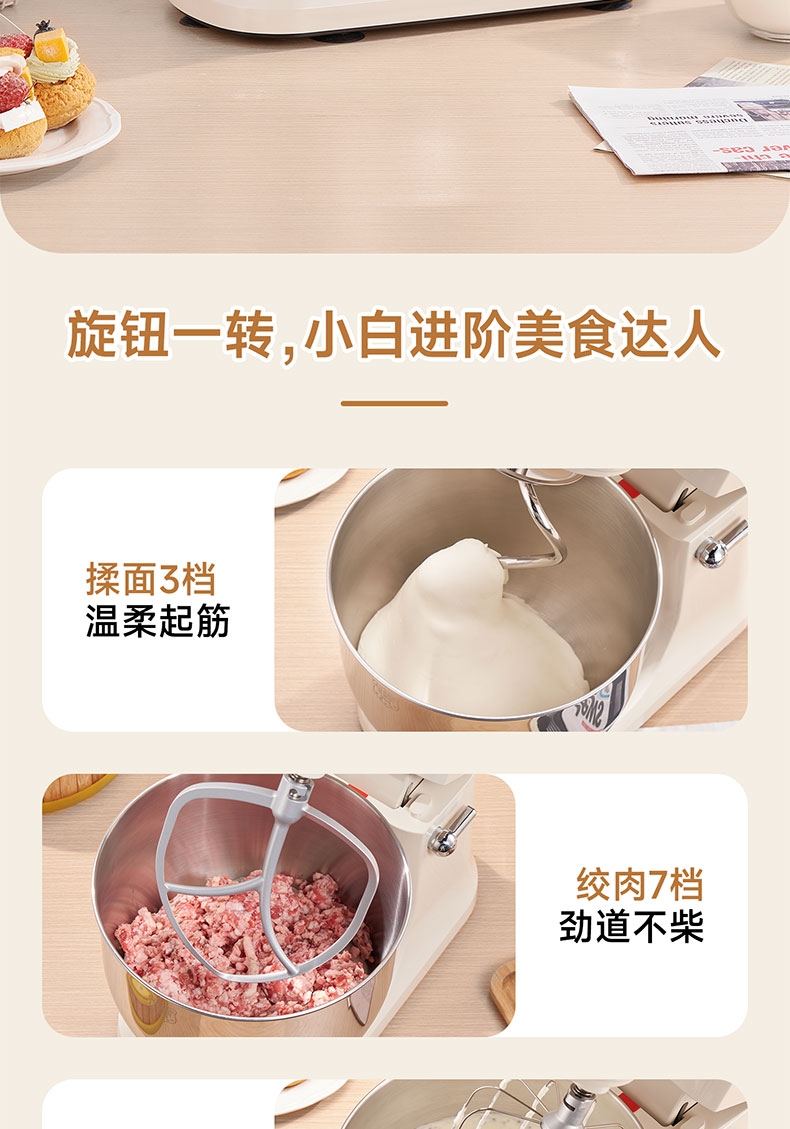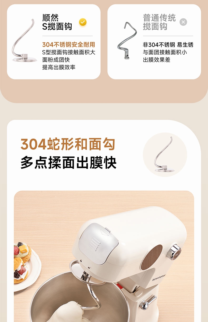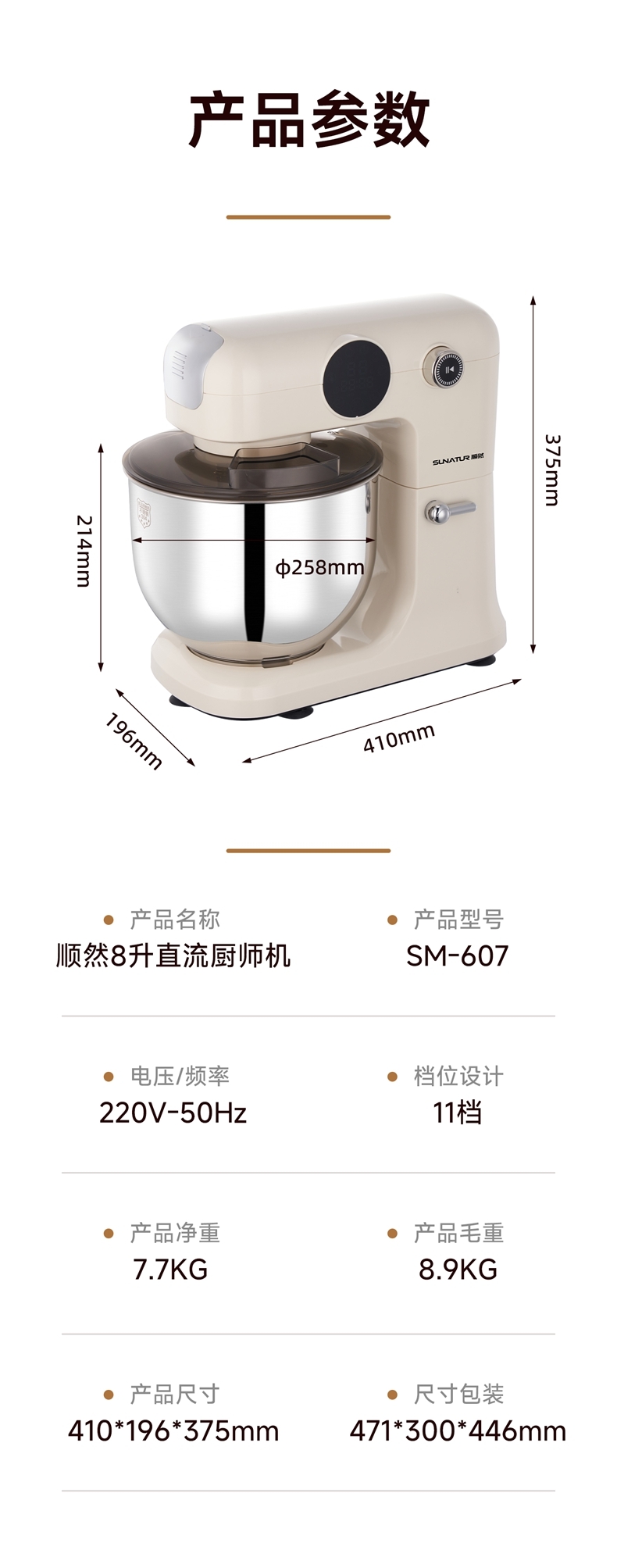 配置清单:1000w直流电机高效轻音运行,成团快,轻松出手套膜 8升家用大容量 11档精准调速,满足不同需求,30分钟定时免看管 3大预设功能,304和面钩,304打蛋笼,搅拌桨配件 金属传动齿轮,高强度高精度使用寿命长 触控屏+旋钮交叉控制 支持扩展配件,需另购;